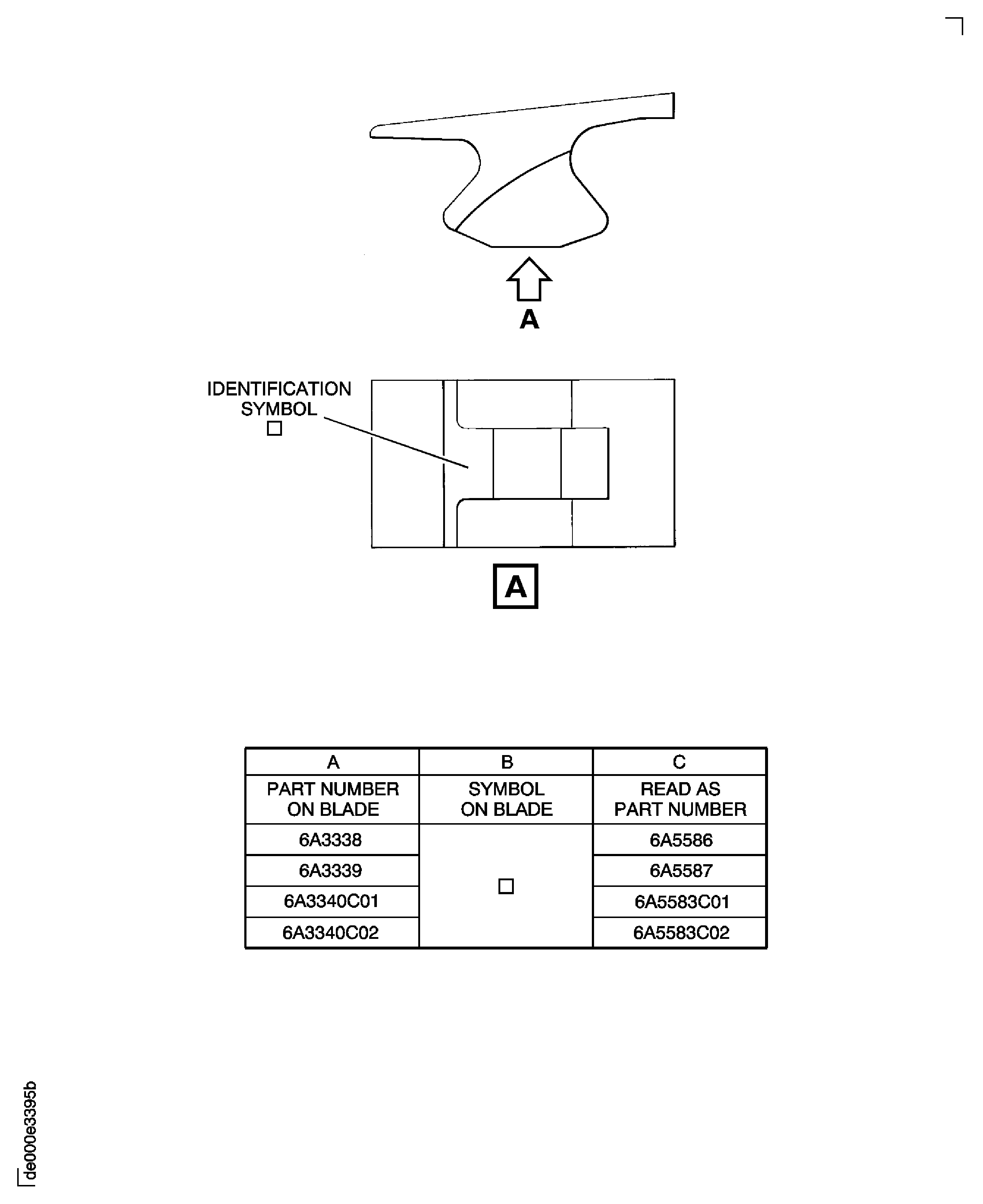 Refer to the table in Figure, if the part number on the blade is shown in A and has the symbol shown in B, then the part number should be read as that shown in C.