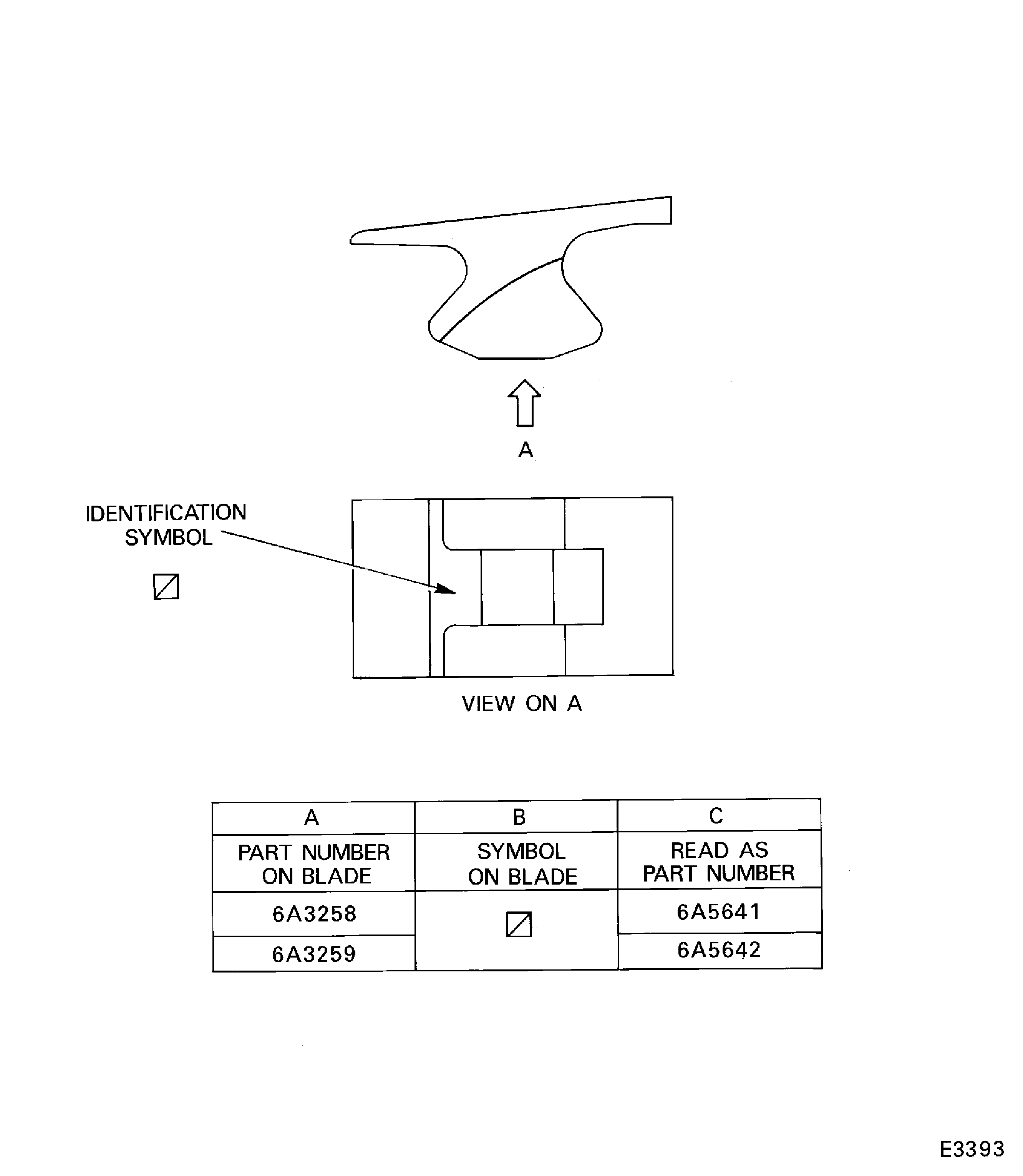 Refer to the table in Figure, if the part number on the blade is shown in A and has the symbol shown in B, then the part number should be read as that shown in C.