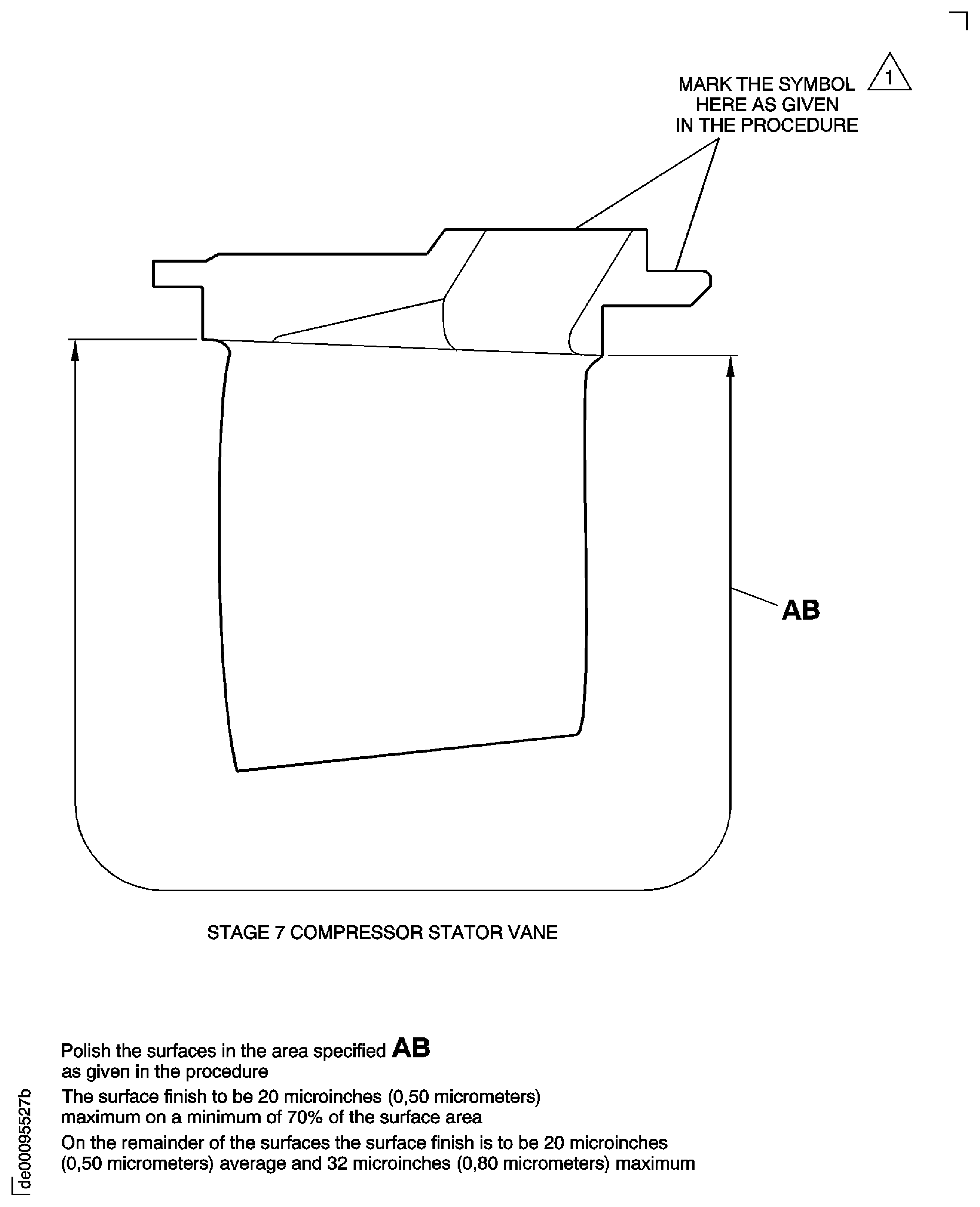 Examine the surface finish on the two sides of the airfoil and the adjacent surfaces in the area specified AB. The surface finish is to be 20 microinches (0.50 micrometers) on a minimum of 70 percent of the surface area. On the remainder of the surfaces the surface finish is to be 20 microinches (0.50 micrometers) average and 32 microinches (0.80 micrometers) maximum.
