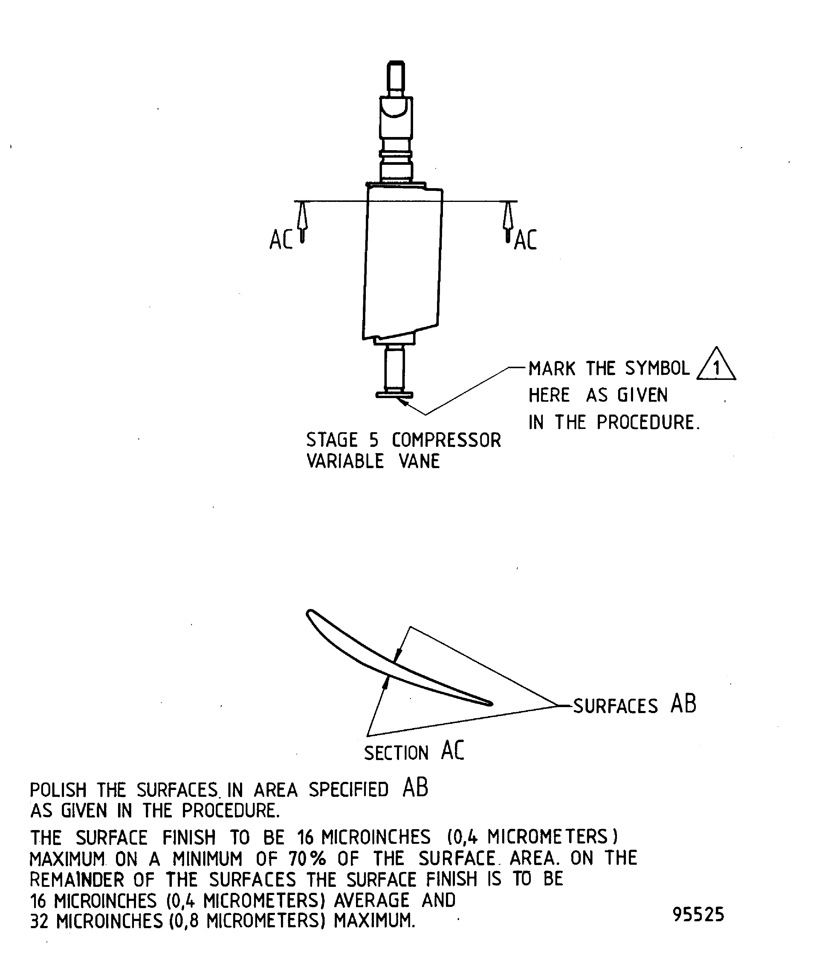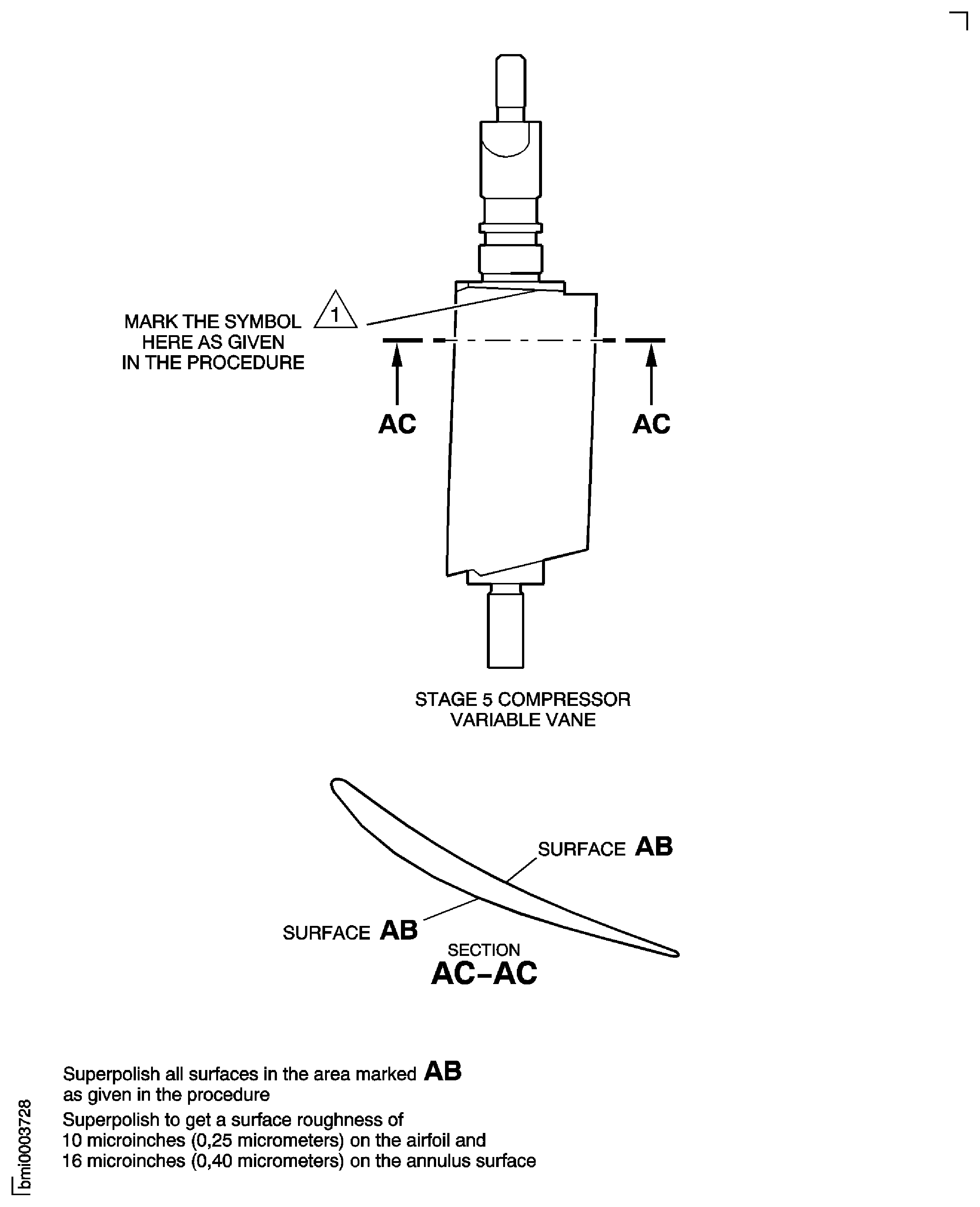 Check the surface finish on the two sides of the airfoil and the adjacent surfaces in the area specified AB. The surface finish is to be 16 microinches (0.40 micrometers) on a minimum of 70 percent of the surface area. On the remainder of the VSV the surface finish is to be between 16 microinches (0.40 micrometers) and 32 microinches (0.80 micrometers).