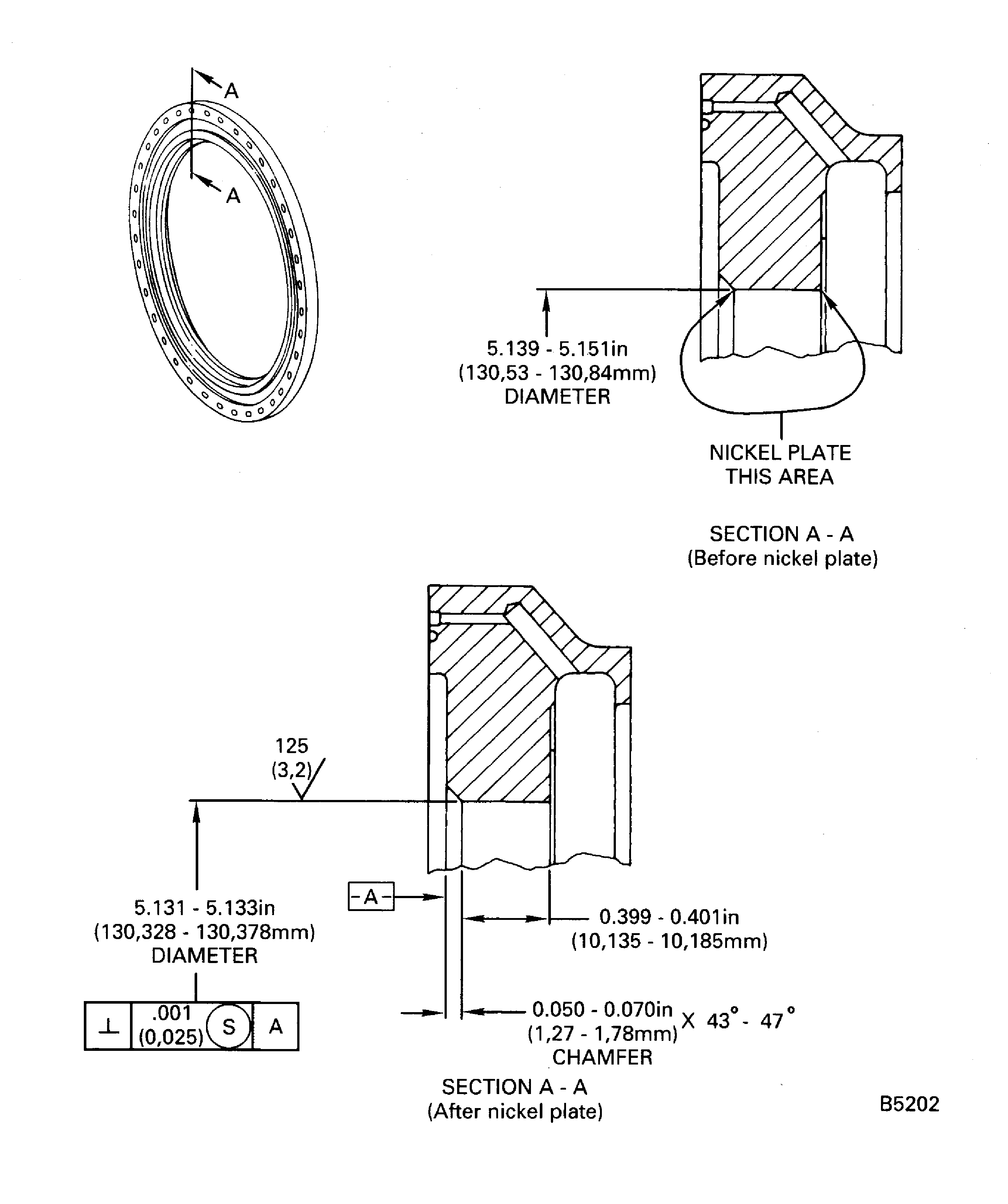 Machine the pilot diameter to 5.139 to 5.151 in. (130.53 to 130.84 mm).