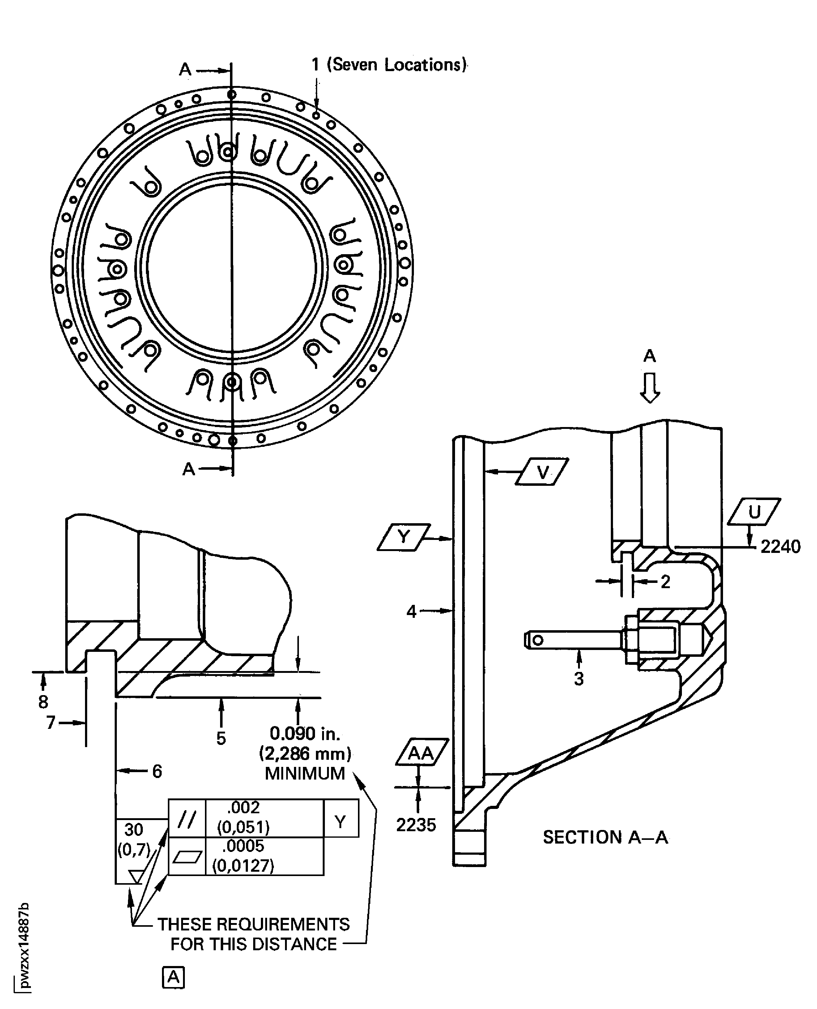 If the measured diameter in a free condition is not satisfactory, a held condition is permitted. All dimensions apply when Surface Y is flat by 0.002 in. (0.051 mm) and Diameters AA and U maintain a clearance envelope of 10.887 in. (276.53 mm) and 6.050 in. (153.67 mm) respectively in a free or held condition. Hold the seal ring holder only on surfaces Y and V and Diameters AA and U.Repair, VRS3795 TASK 72-43-20-300-019 (REPAIR-019)