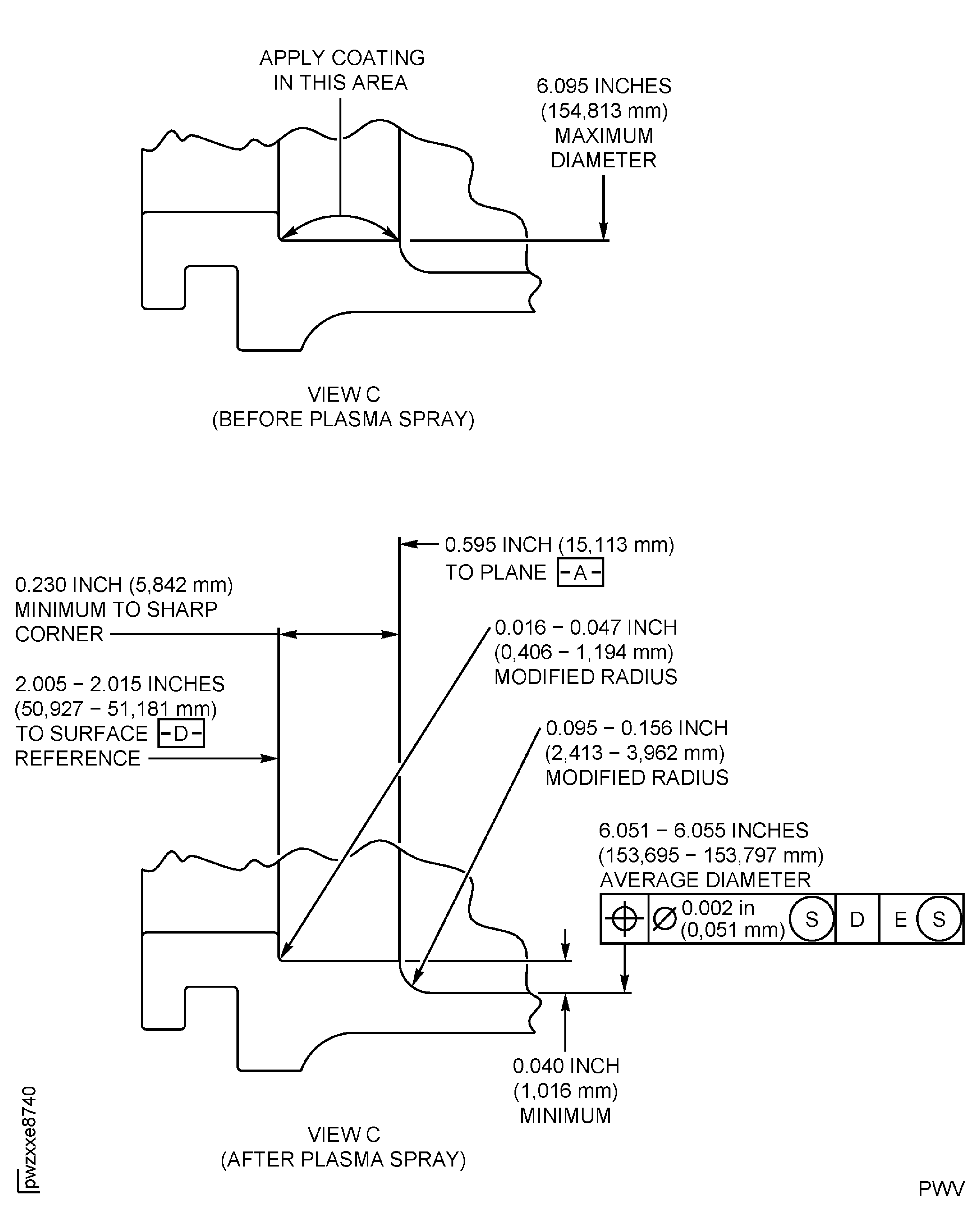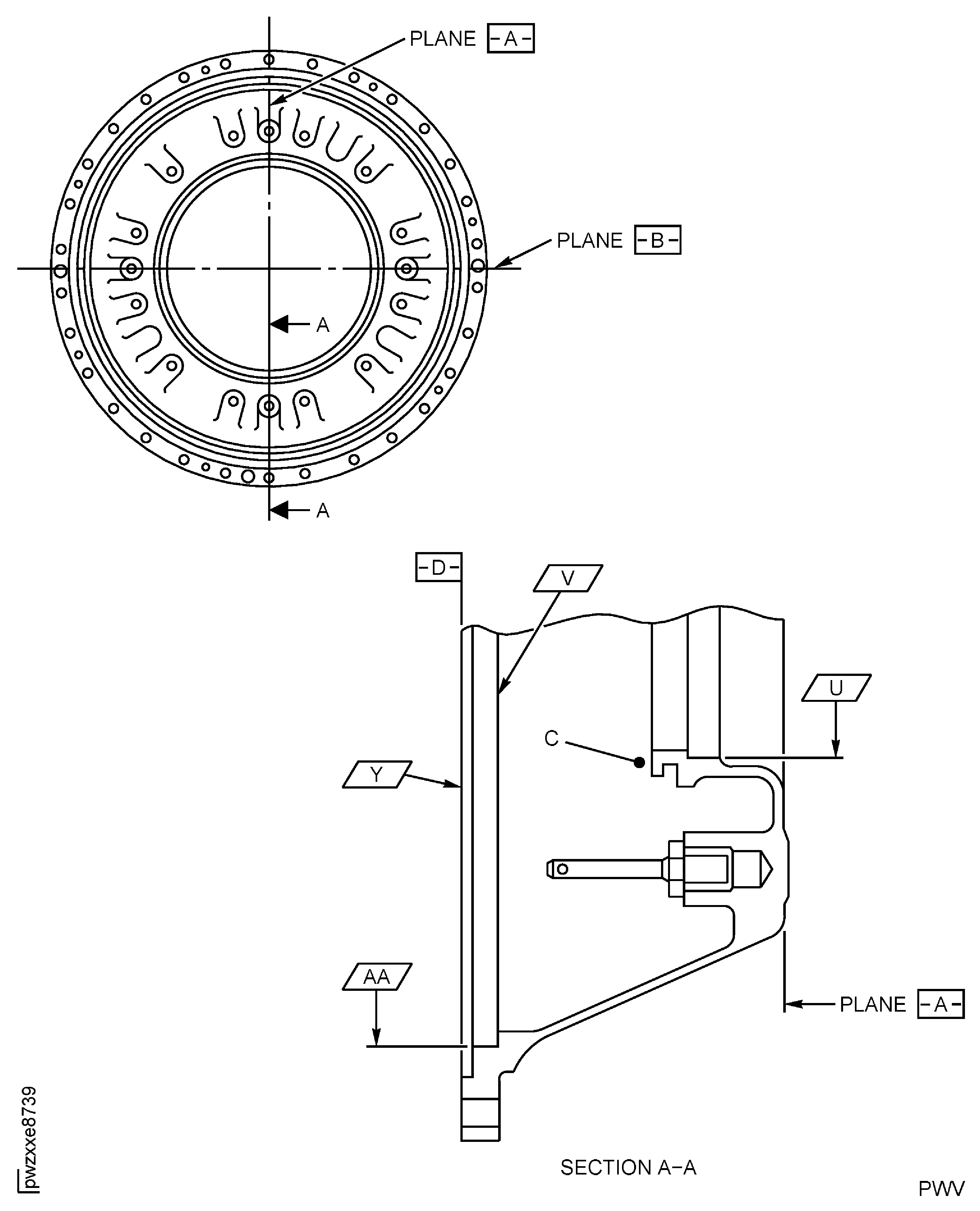 The thickness of the coating after finish machine must be 0.003 to 0.020 in. (0.07 to 0.51 mm) all around.All dimensions apply when surface Y is flat by 0.002 in. (0.05 mm) and Diameters AA and U maintain a clearance envelope of 10.887 in. and 6.050 in. (276.53 mm and 153.67 mm) respectively in a free or held condition. Hold the seal ring holder only on surfaces Y and V and Diameters AA and U.
