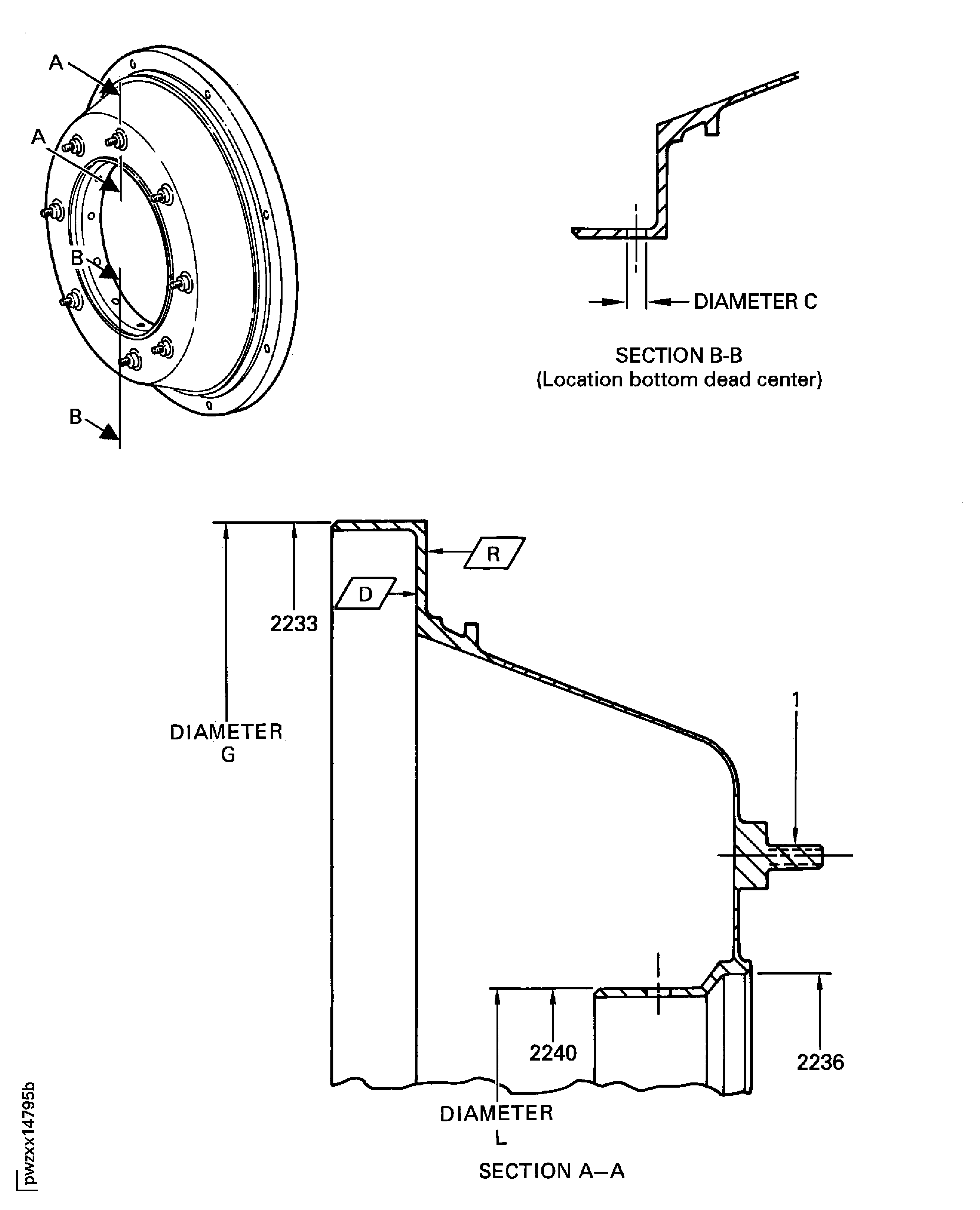 The diameters can be measured in a free or held condition. All dimensions apply when Surface D is flat by 0.002in. (0.051 mm), Diameter G maintains a clearance envelope of 12.759in. (324.079 mm) diameter, and Diameter L maintains a clearance envelope of 6.058in. (153.873 mm) diameter in a free or held condition. Hold the duct only on Surfaces D and R, and Diameters G and L.Refer to Figure.
