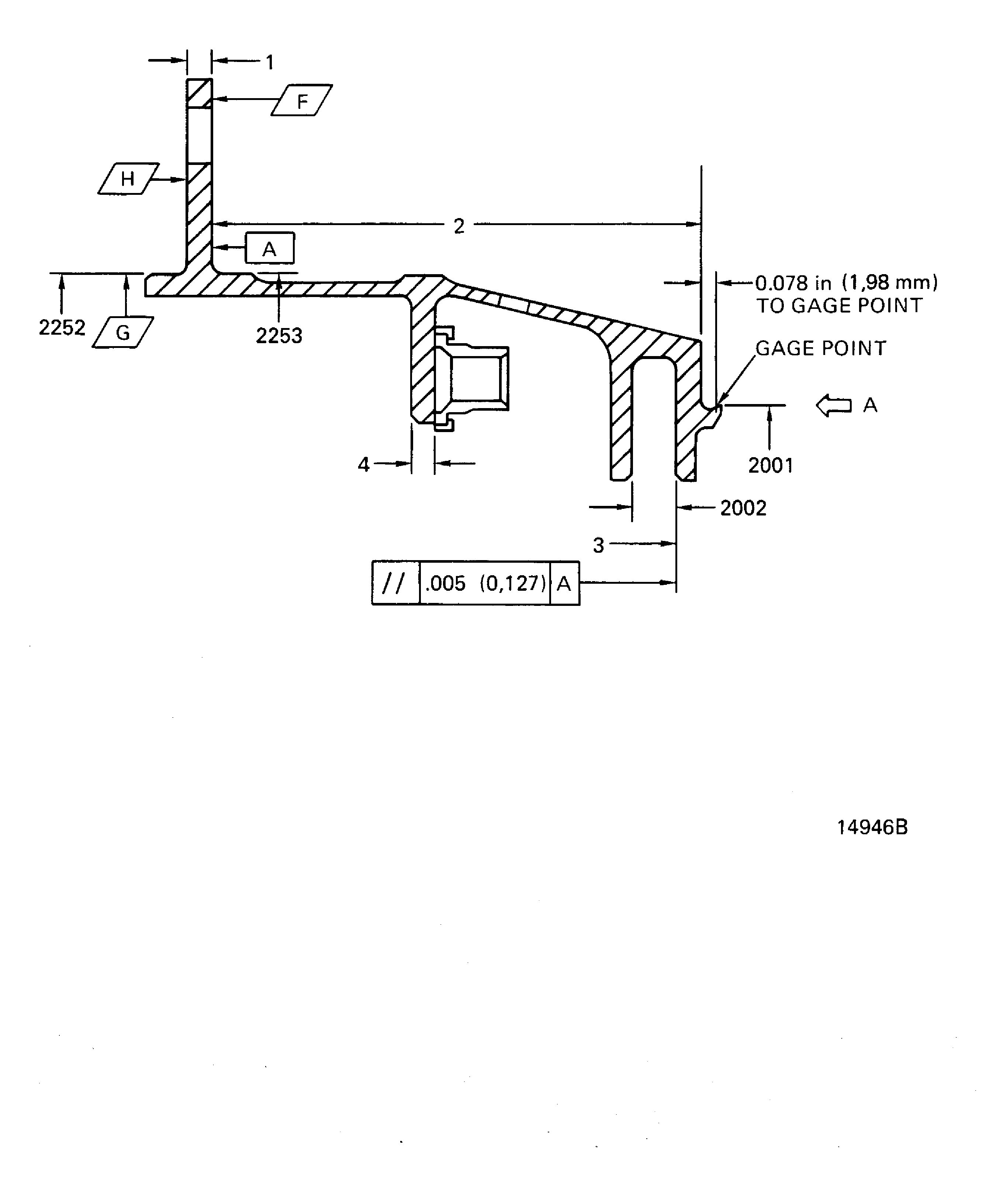 If the measured dimensions in a free condition are not satisfactory, a held condition is permitted. All dimension apply when Surface F is flat by 0.005 in. (0.13 mm) and Diameter G maintains a clearance envelope of 28.242 in. (717.35 mm) in a free or held condition. Hold the support assembly only on Surfaces F and H on Diameter G.Examine the support assembly at locations 2252 and 2253 for the outer diameter on the front and rear flanges.