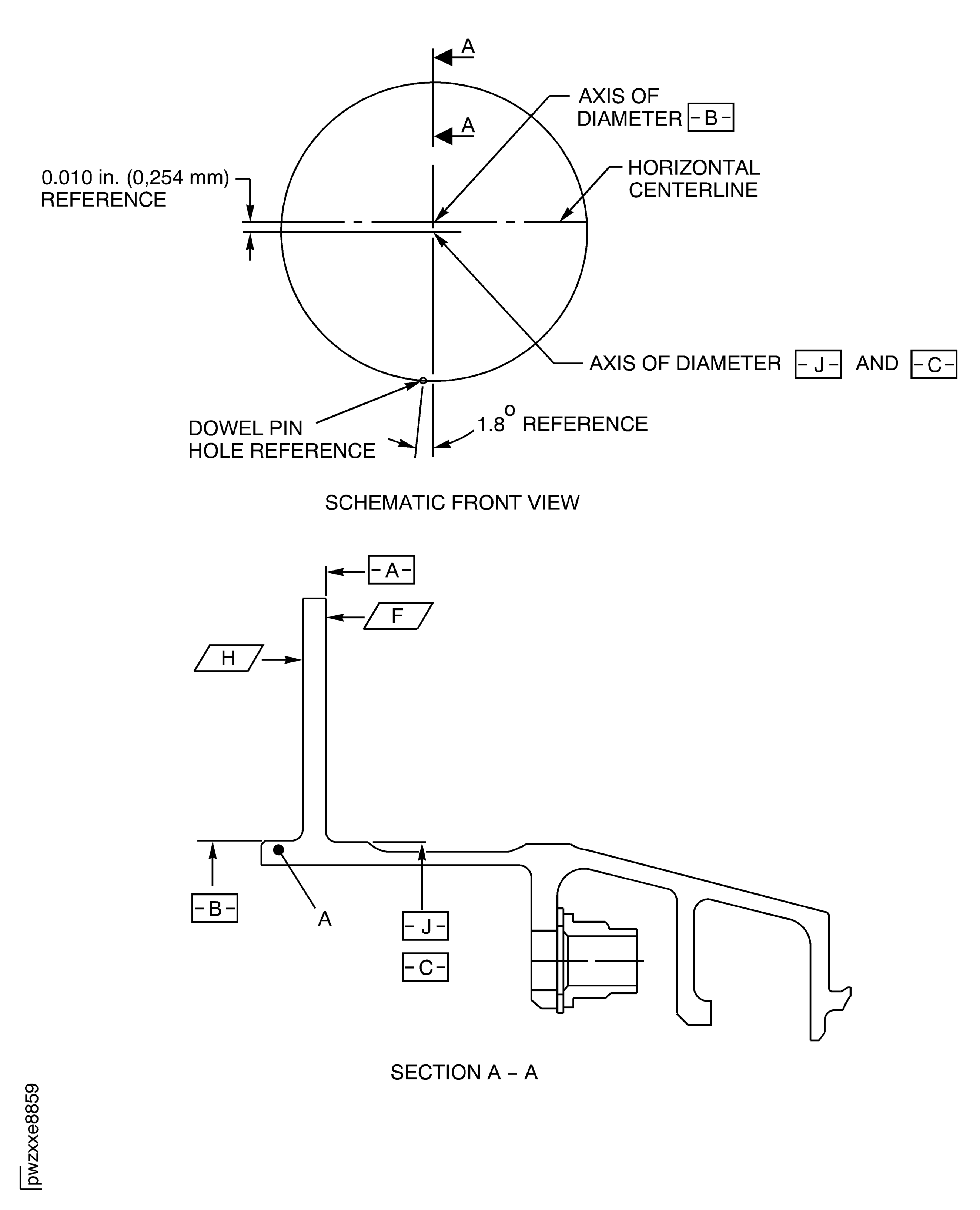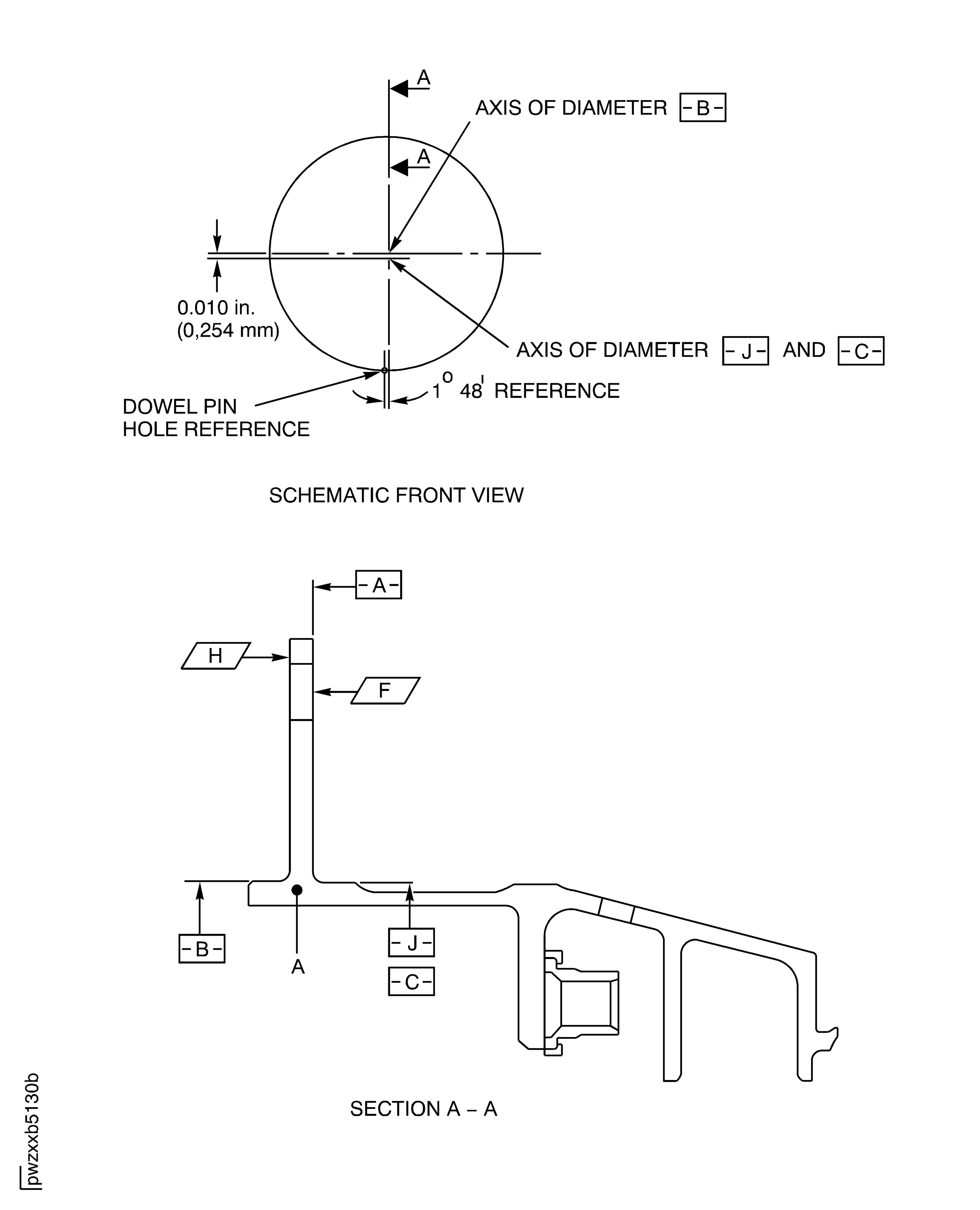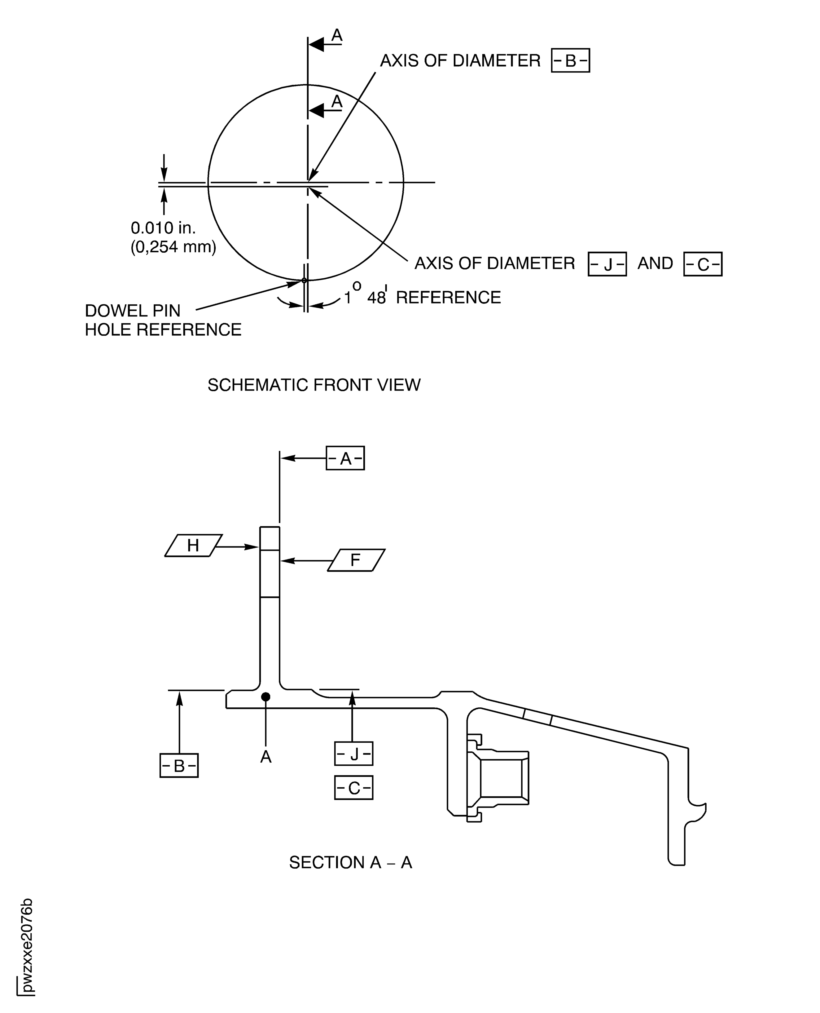 If the measured dimension in a free condition is not satisfactory, a held condition is permitted. All dimensions apply when Surface F is flat by 0.005 in. (0.13 mm) and Diameter J maintains a clearance envelope of 28.242 in. (717.35 mm) diameter in a free or held condition. In a free condition, Surface F must be flat by 0.010 in. (0.25 mm) and Diameter J must be 28.210 to 28.266 in. (716.53 to 717.96 mm). Hold the duct only on Surfaces F and H and Diameter J.