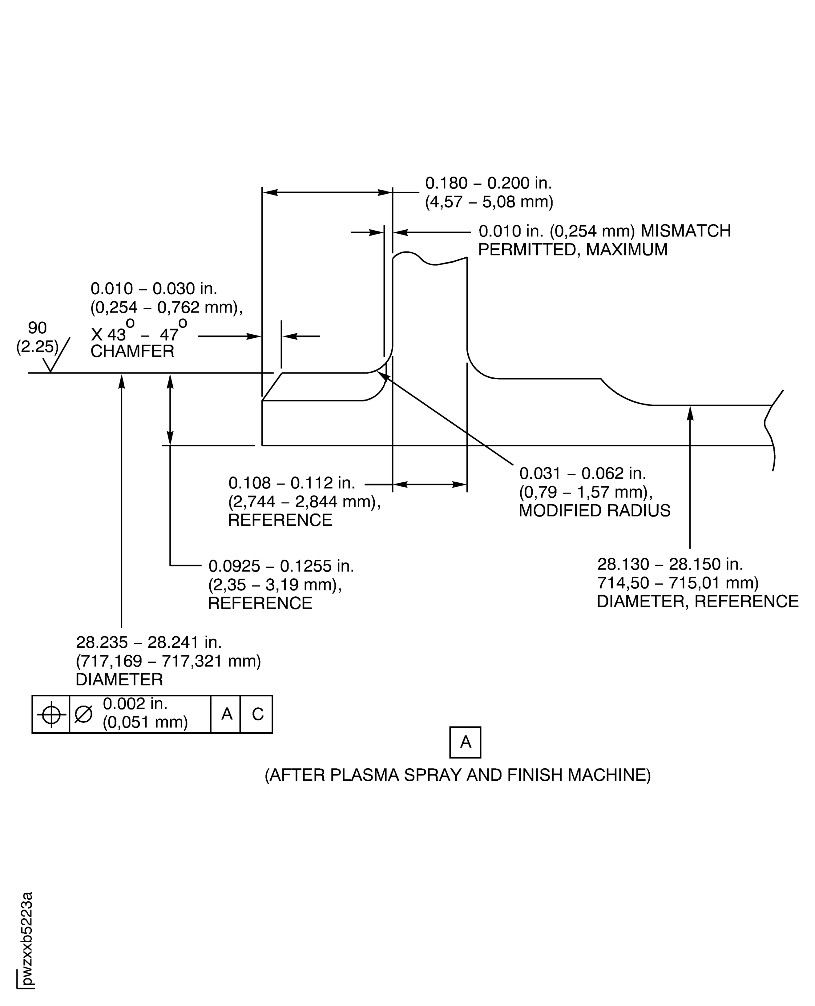 If the measured dimension in a free condition is not satisfactory, a held condition is permitted. All dimensions are applicable when Surface F is flat by 0.005 in. (0.13 mm) and Diameter J keeps a clearance envelope of 28.242 in. (717.35 mm) diameter in a free or held condition. In a free condition, Surface F must be flat by 0.010 in. (0.25 mm) and Diameter J must be 28.210 to 28.266 in. (716.53 to 717.96 mm). Hold the duct only on Surfaces F and H and Diameter J.