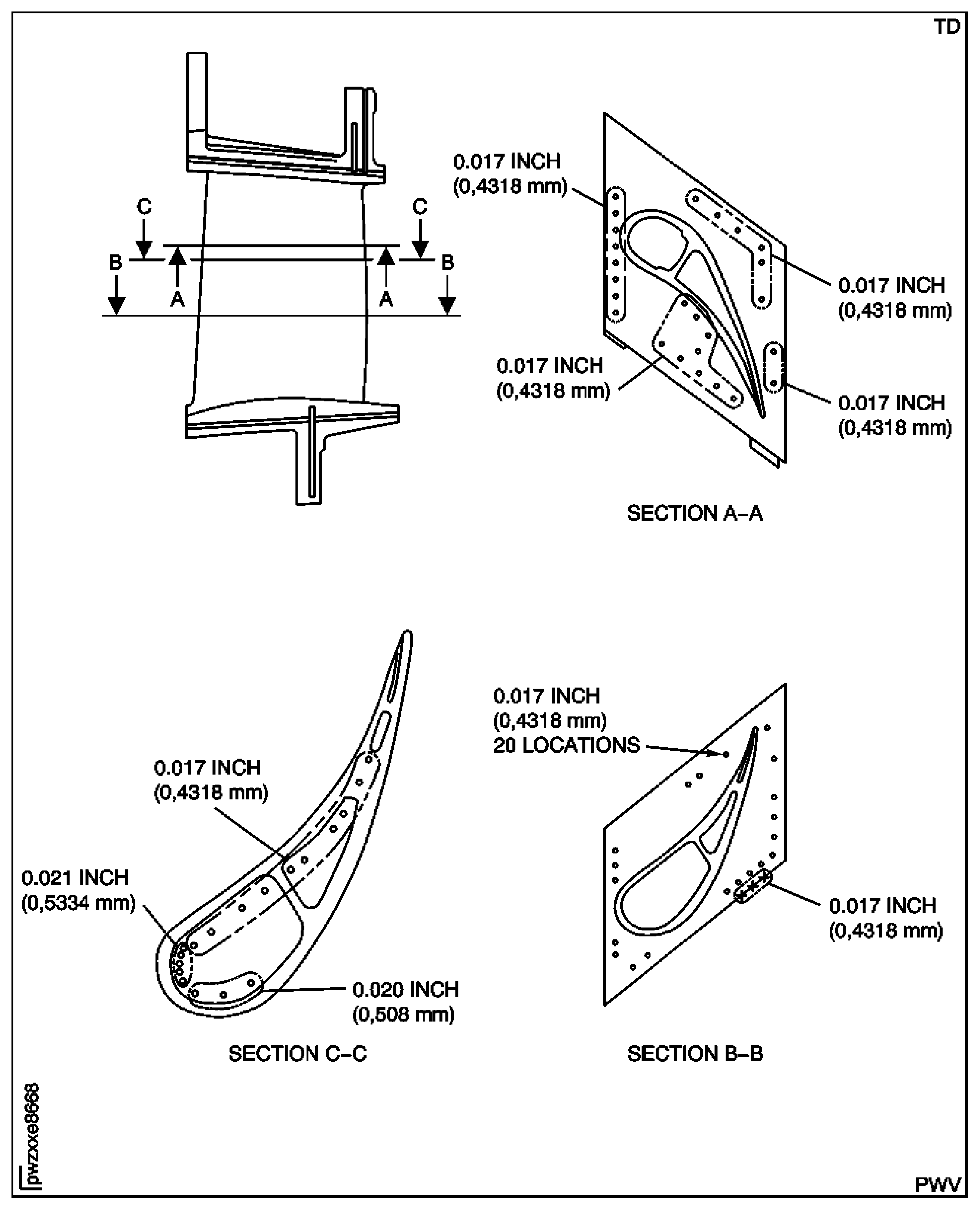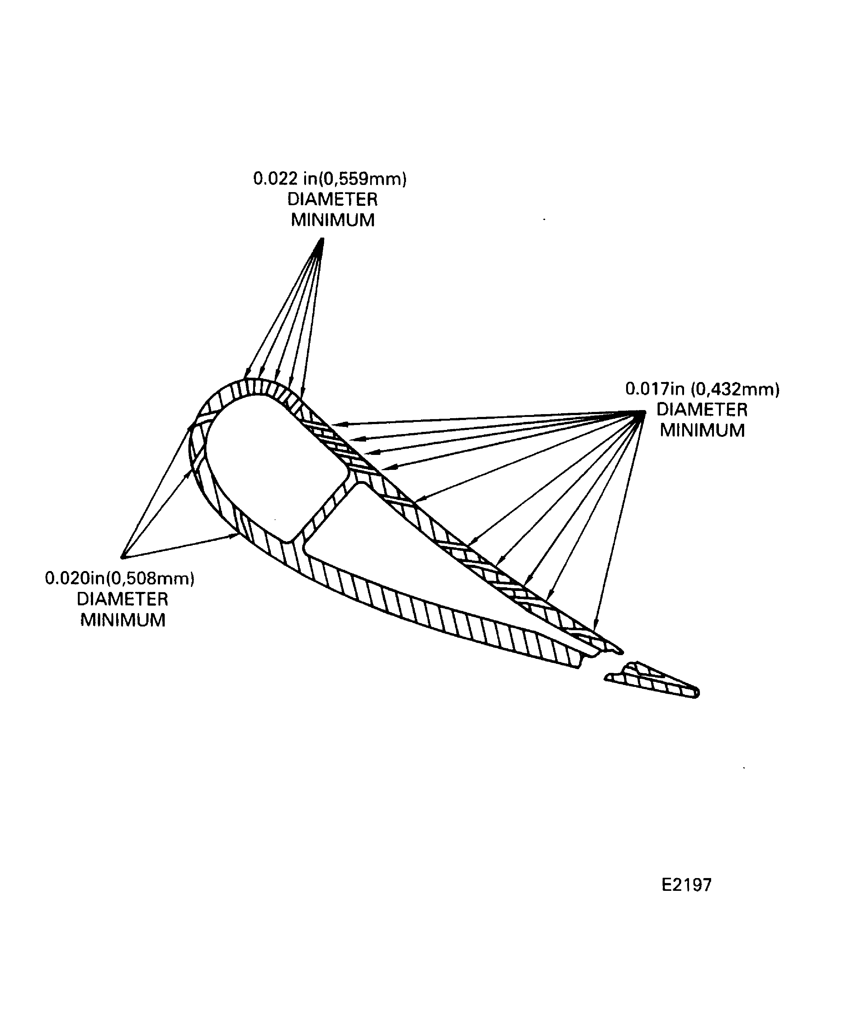 THE SMALLEST AIRFOIL COOLING AIR HOLE IS 0.017 IN. (0.431 MM). THE HOLES ARE DIFFERENT SIZES FROM LOCATION TO LOCATION. USE A REAMER OR WIRE THAT HAS A SMALLER DIAMETER THAN THE FINAL HOLE SIZE AND INCREASE IN SMALL INCREMENTS TO THE CORRECT SIZE. CAREFULLY PROBE THE HOLES SO YOU DO NOT CAUSE DAMAGE TO THE COATING.Hand probe the cooling air holes to remove the foreign material or blockage.