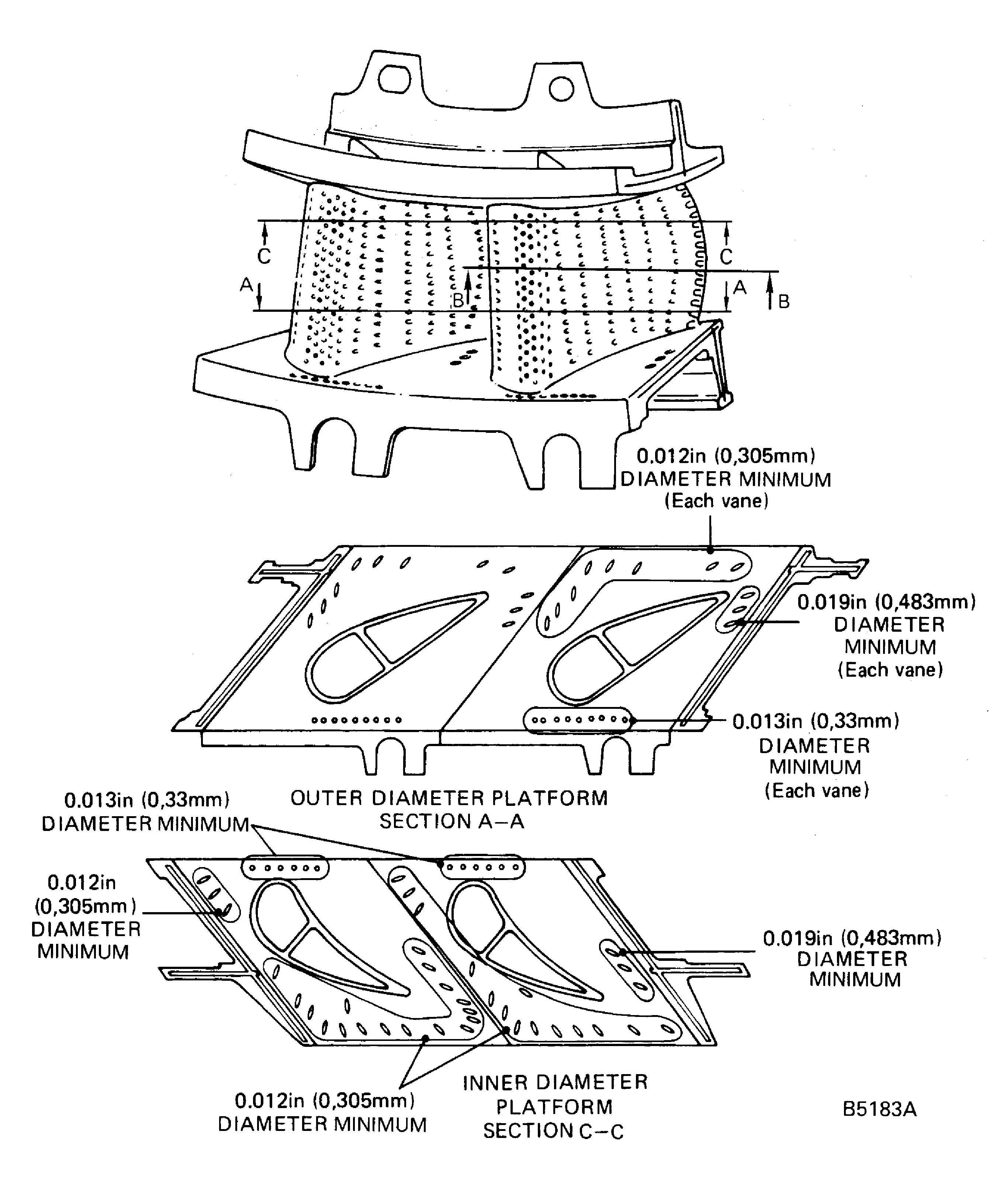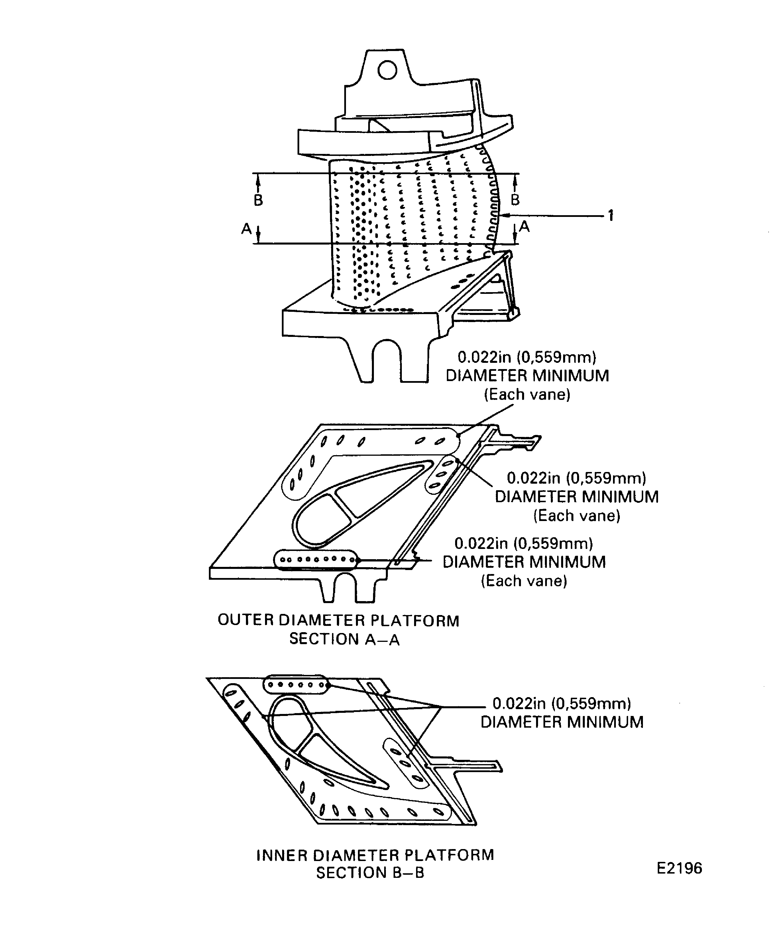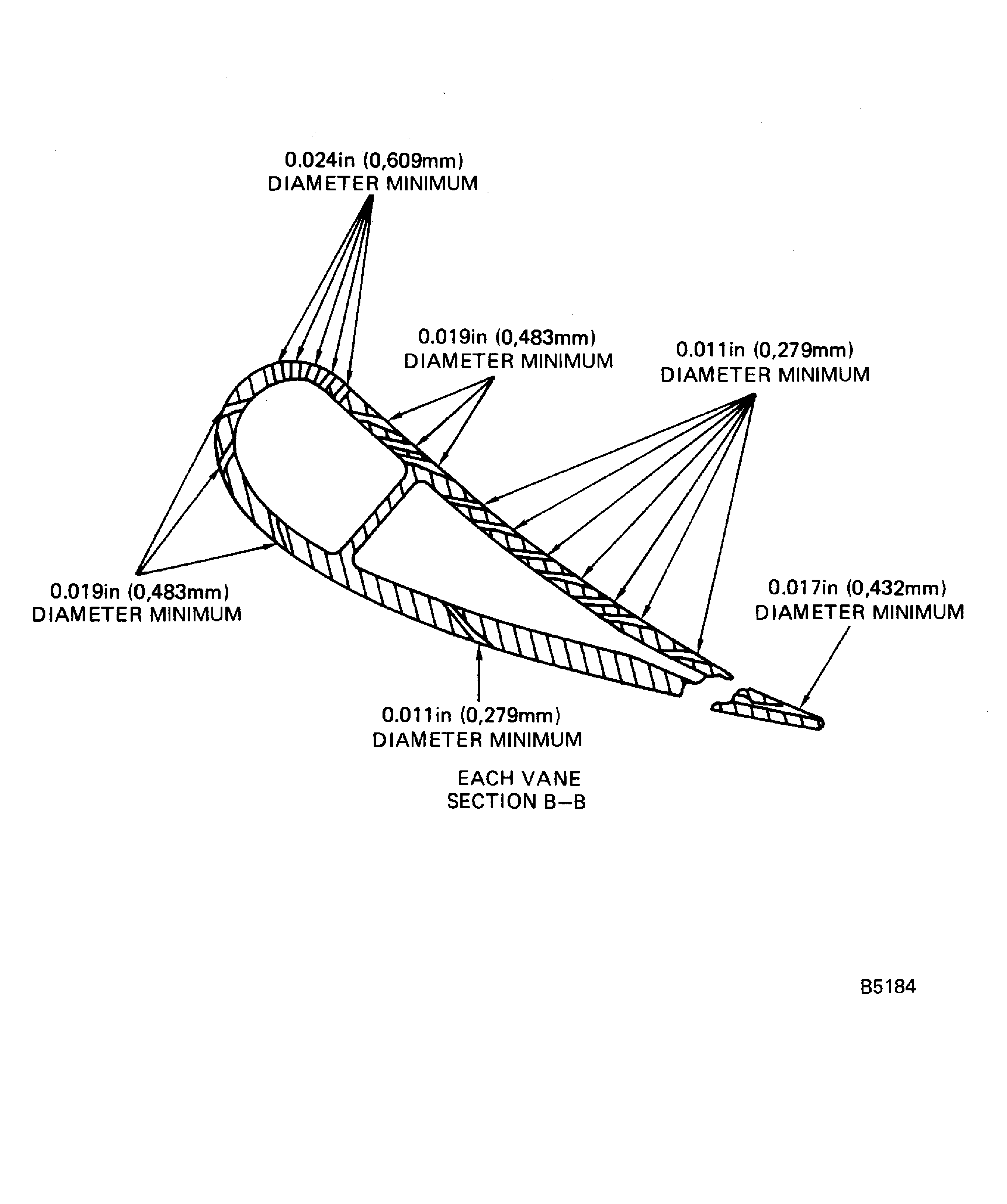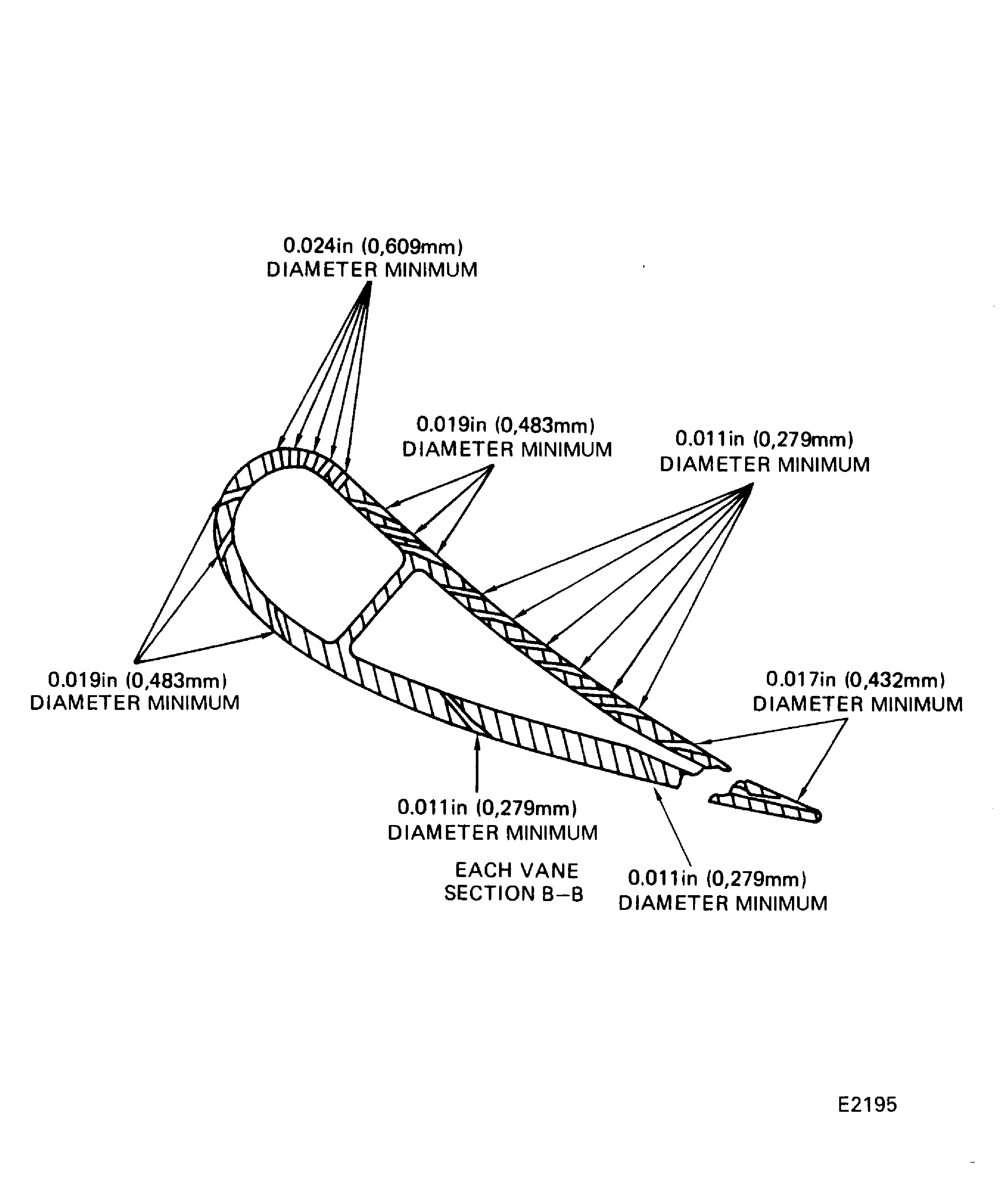 THE SMALLEST AIRFOIL COOLING AIR HOLE IS 0.011 IN. (0.279 MM). THE HOLES ARE DIFFERENT SIZES FROM LOCATION TO LOCATION. USE A REAMER OR WIRE THAT HAS A SMALLER DIAMETER THAN THE FINAL HOLE SIZE AND INCREASE IN SMALL INCREMENTS TO THE CORRECT SIZE. CAREFULLY PROBE THE HOLES SO YOU DO NOT CAUSE DAMAGE TO THE COATING.Hand probe the cooling air holes to remove the foreign material or blockage.