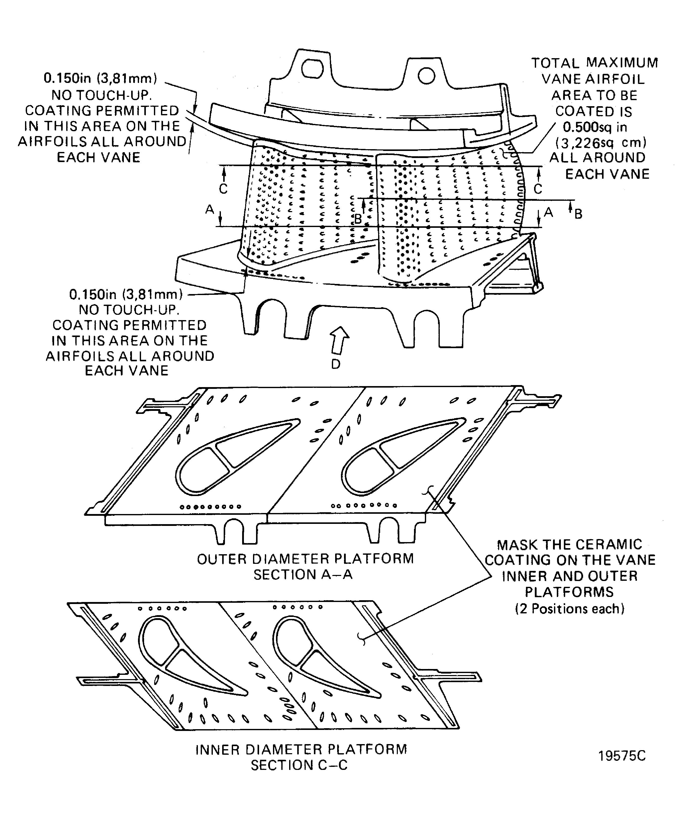 No touch-up coating is permitted in 0.150 in. (3.81 mm) area of the ceramic coating on the inner and outer airfoil platforms.