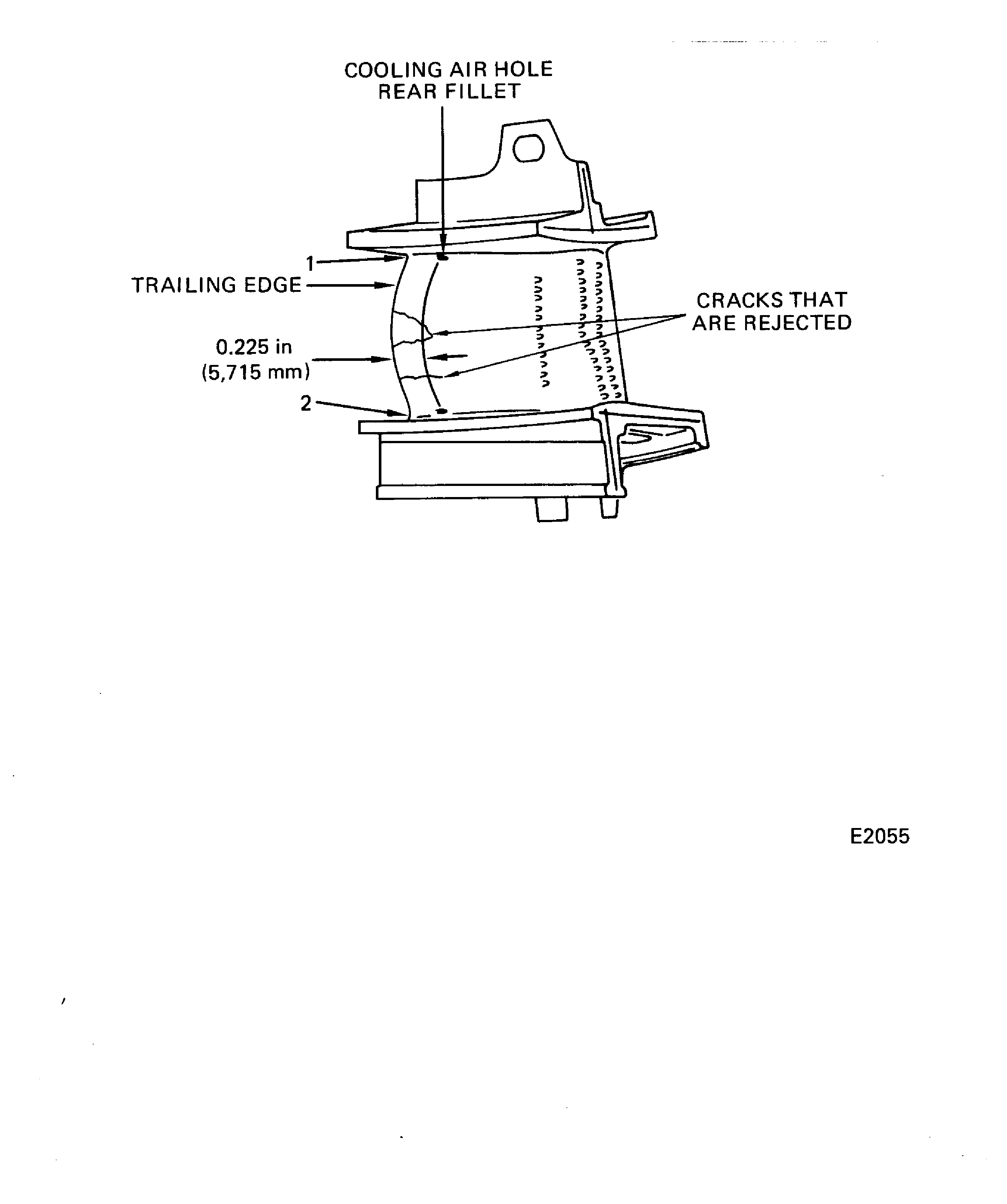 Examine the vane assembly trailing edge convex sides for cracks. Cracks are only permitted at locations 1 and 2, Figure.
