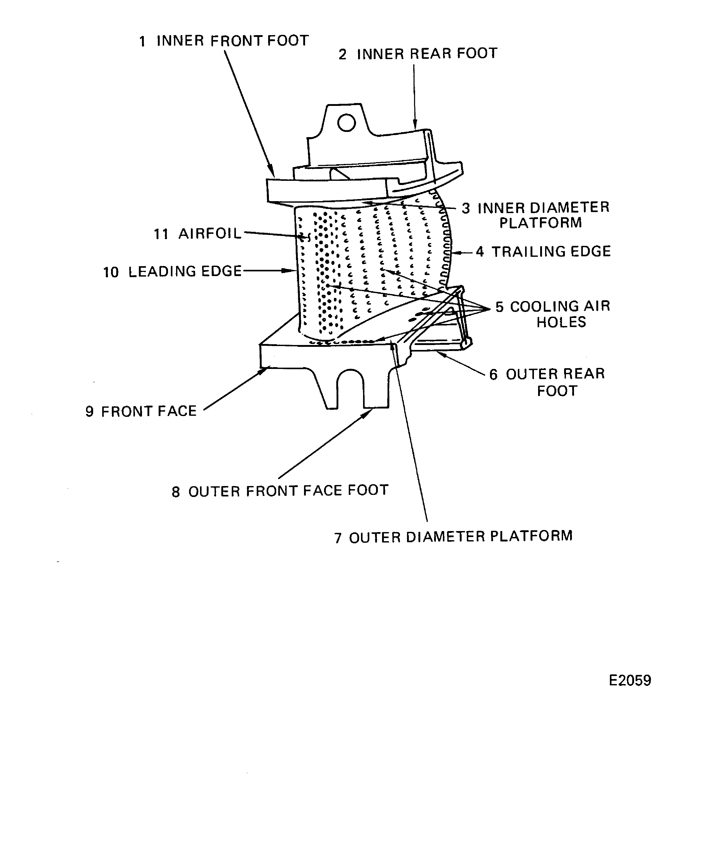Examine the vane assembly at locations 4, 10 and 11 Figure.or burns and erosion on the airfoil, leading and trailing edges.