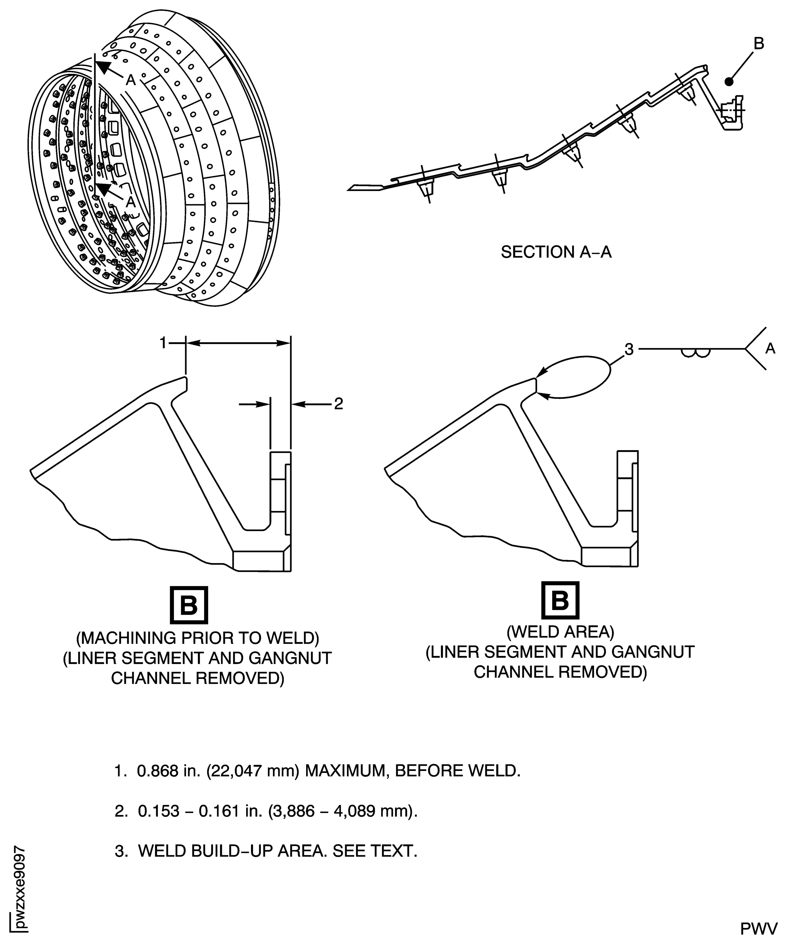 WELDING AT THIS REPAIR AREA CAN DISTORT THE PART. IT IS RECOMMENDED TO USE APPROPRIATE WELD FIXTURES TO MINIMIZE PART DISTORTION.Refer to the SPM TASK 70-37-24-370-501. Use argon or vacuum.