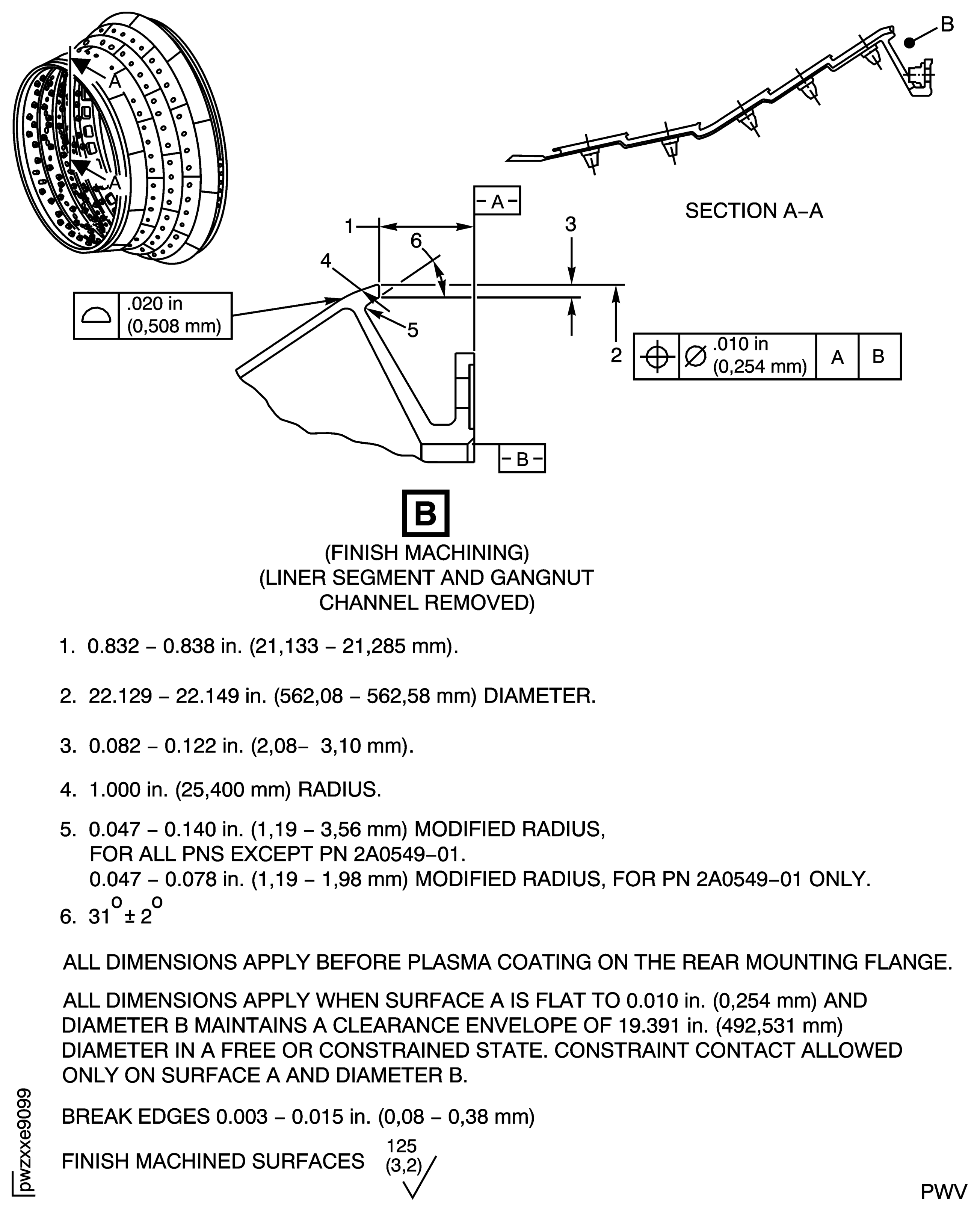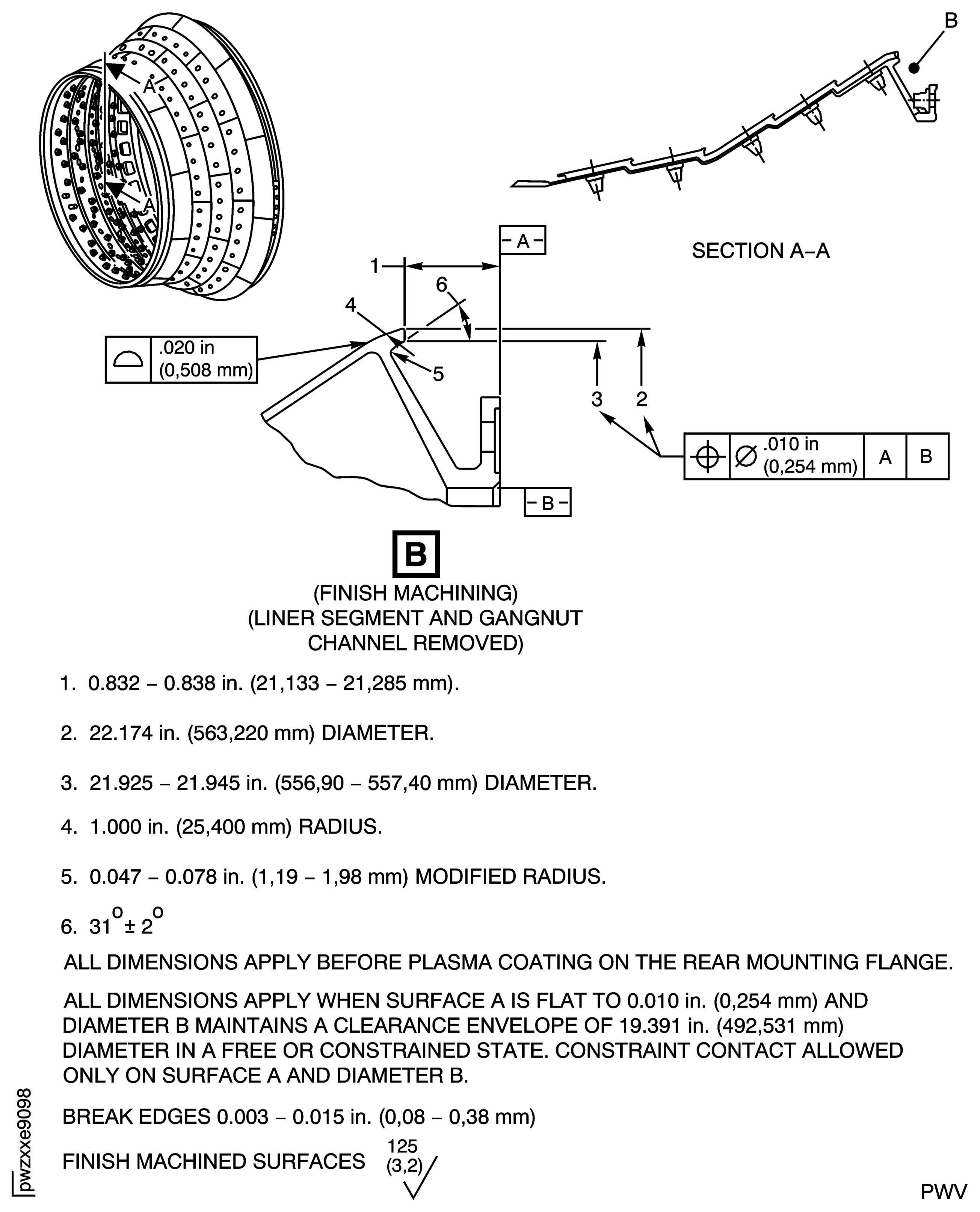 Remove all wear and/or existing coating from the rear flange-to-vane platform seal face to the limits by one or more of the methods that follow: