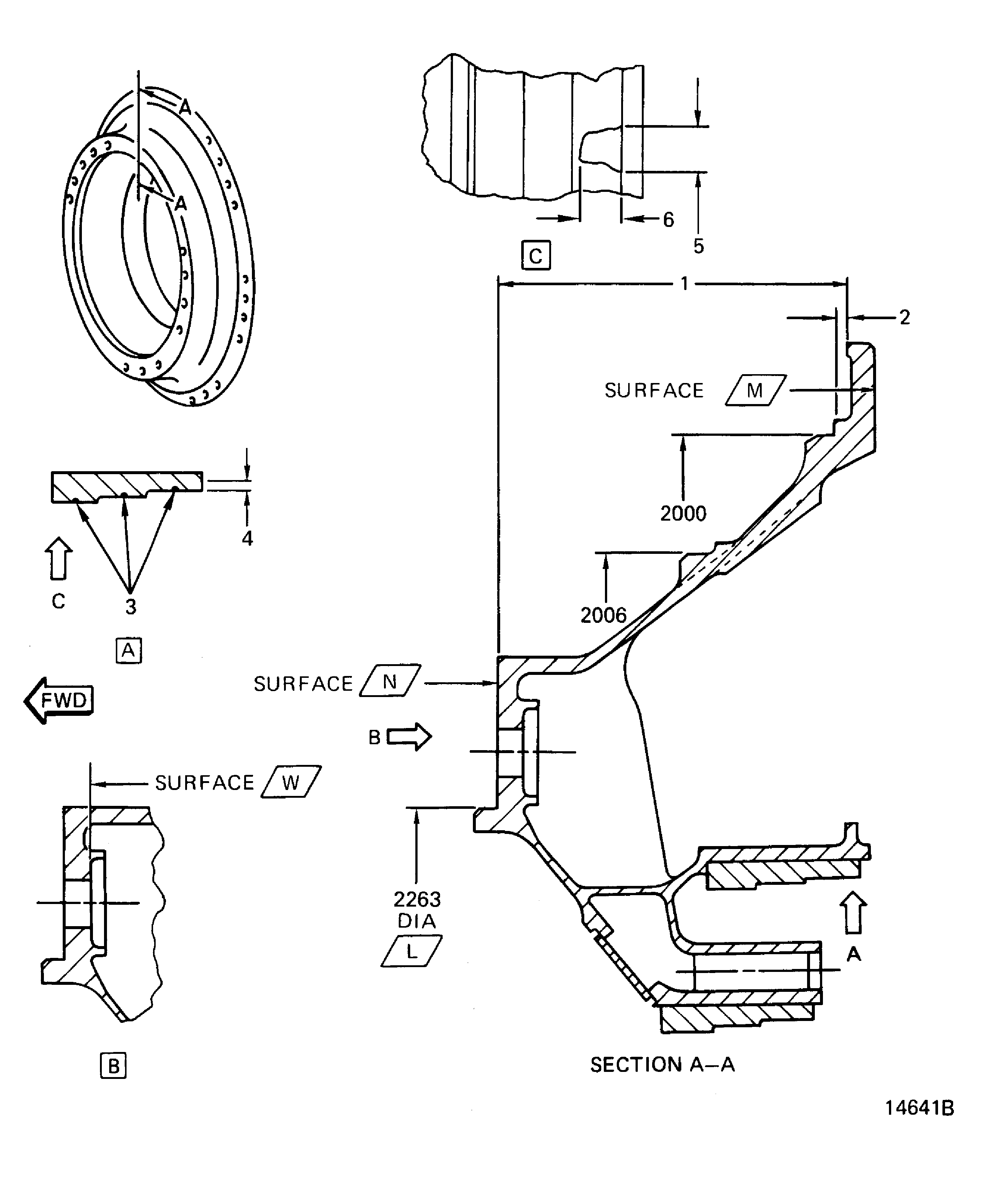 If the measured axial dimensions in a free condition are not satisfactory, a held condition is permitted. All dimensions apply when Surface N is flat by 0.002 in. (0.051 mm) and Diameter L maintains a clearance envelope of 13.040 in. (331.216 mm) diameter in a free or held condition. Hold the duct only on Surfaces N, M and W, and Diameter L.Refer to Figure