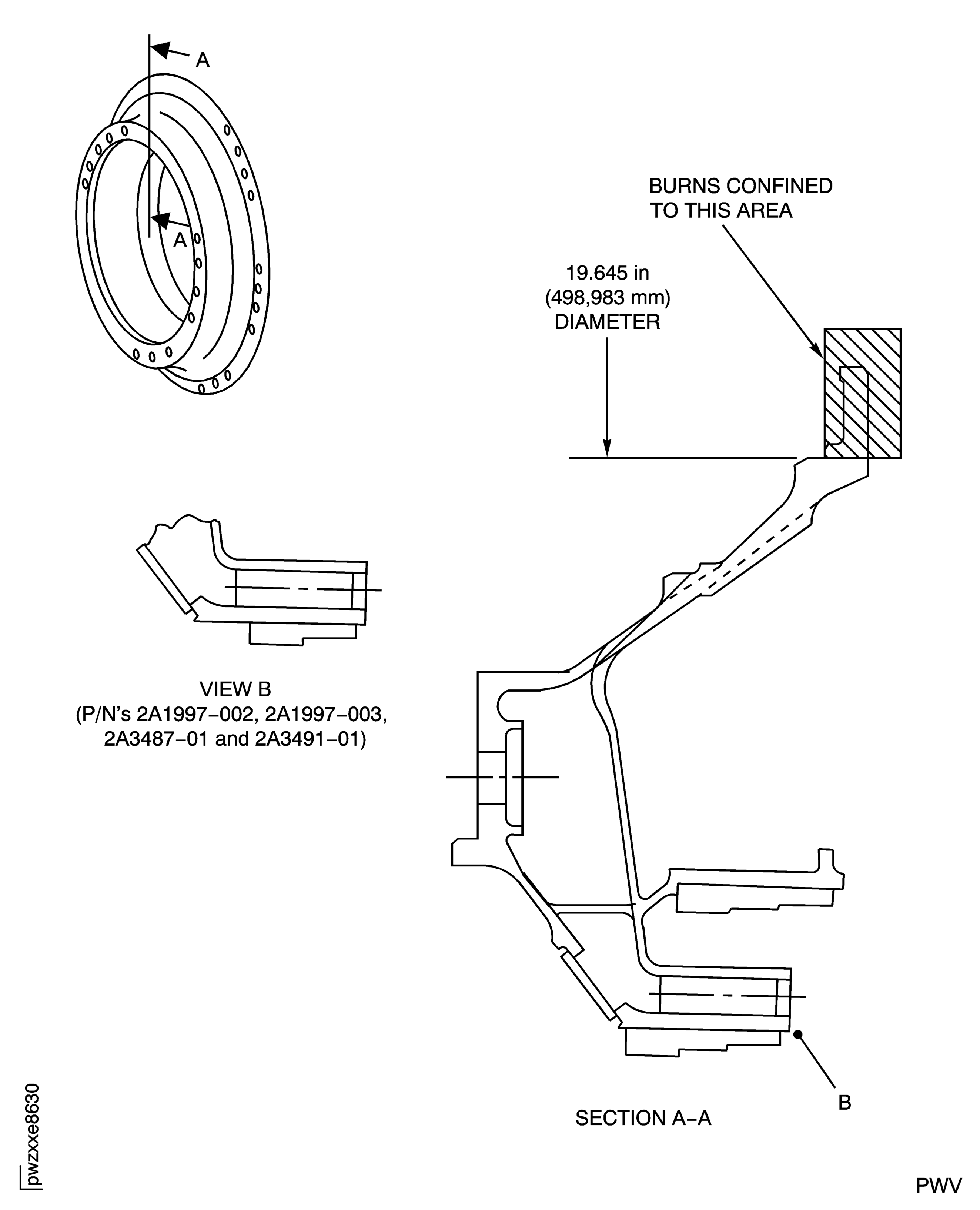 Burnt sections in O. D. flange with arc length greater than 1.5 inches (38.1 mm) and within area indicated on Figure