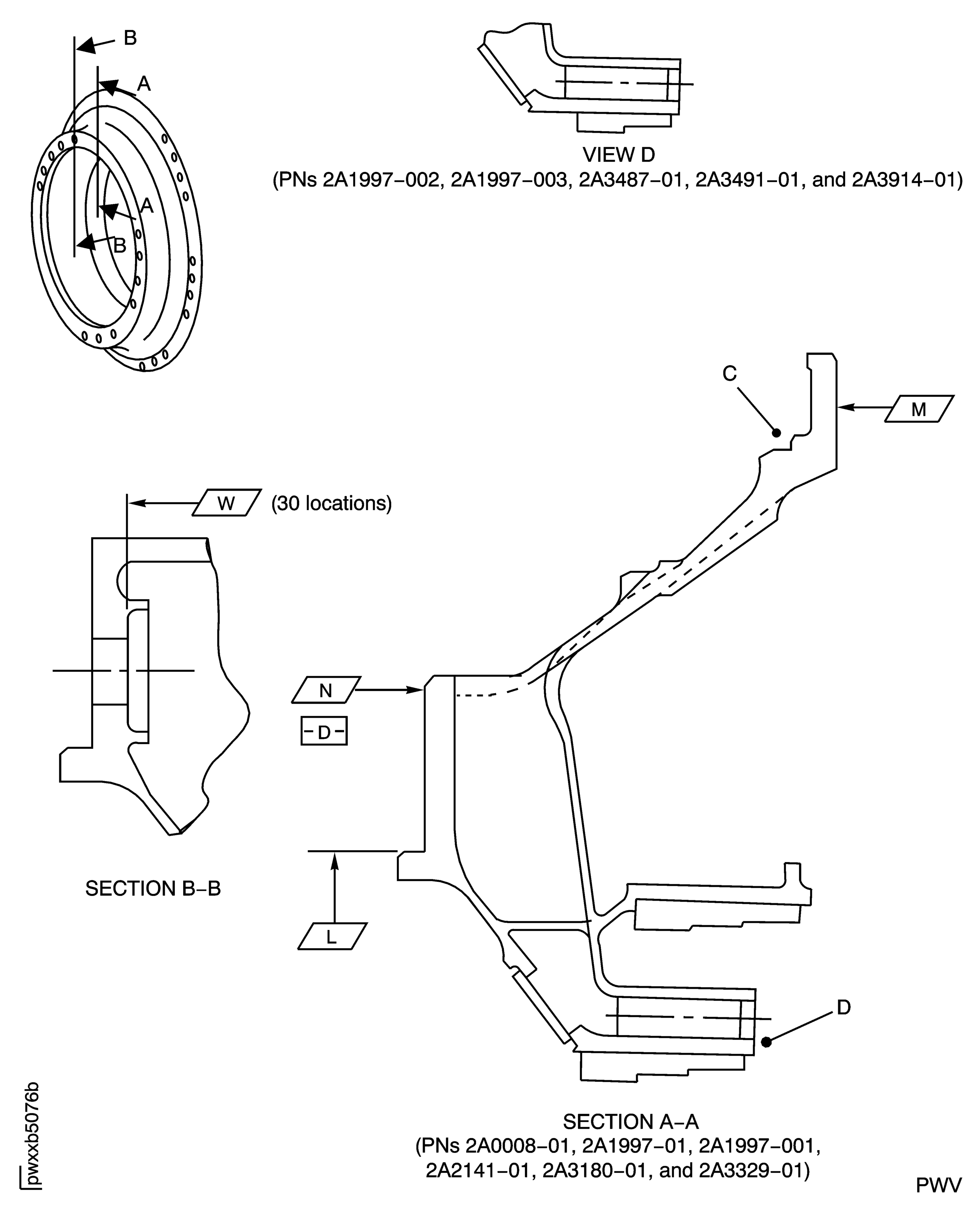 If the measured dimension in a free condition is not satisfactory, a held condition is permitted. All dimensions apply when Surface N is flat by 0.002 in. (0.051 mm) and Diameter L maintains a clearance envelope of 13.040 in. (331.216 mm) diameter in a free or held condition. In a free condition, Surface N must be flat by 0.005 in. (0.127 mm) and Diameter L must be 13.008 in. to 13.059 in. (330.40 to 331.70 mm). Hold the duct only on Surfaces N, M and W and Diameter L.Machine to remove the coating.