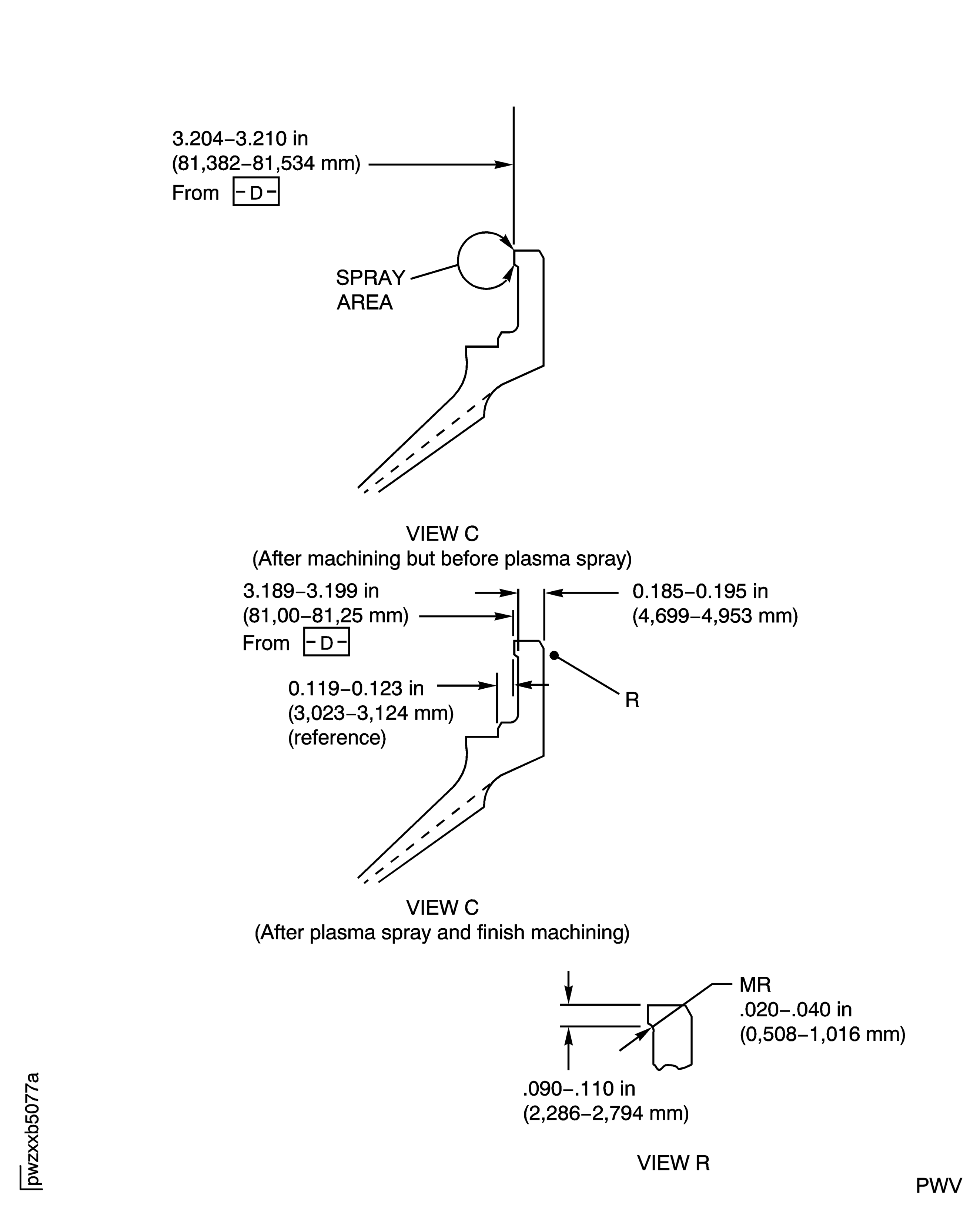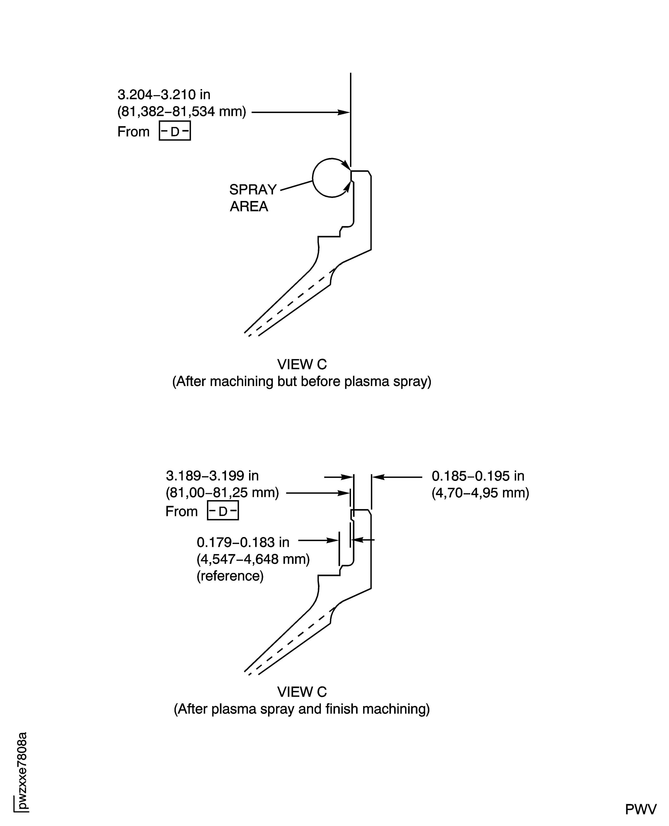 Machine the surface to be repaired to 3.204 in. to 3.210 in. (81.382 to 81.534 mm) from Surface D.