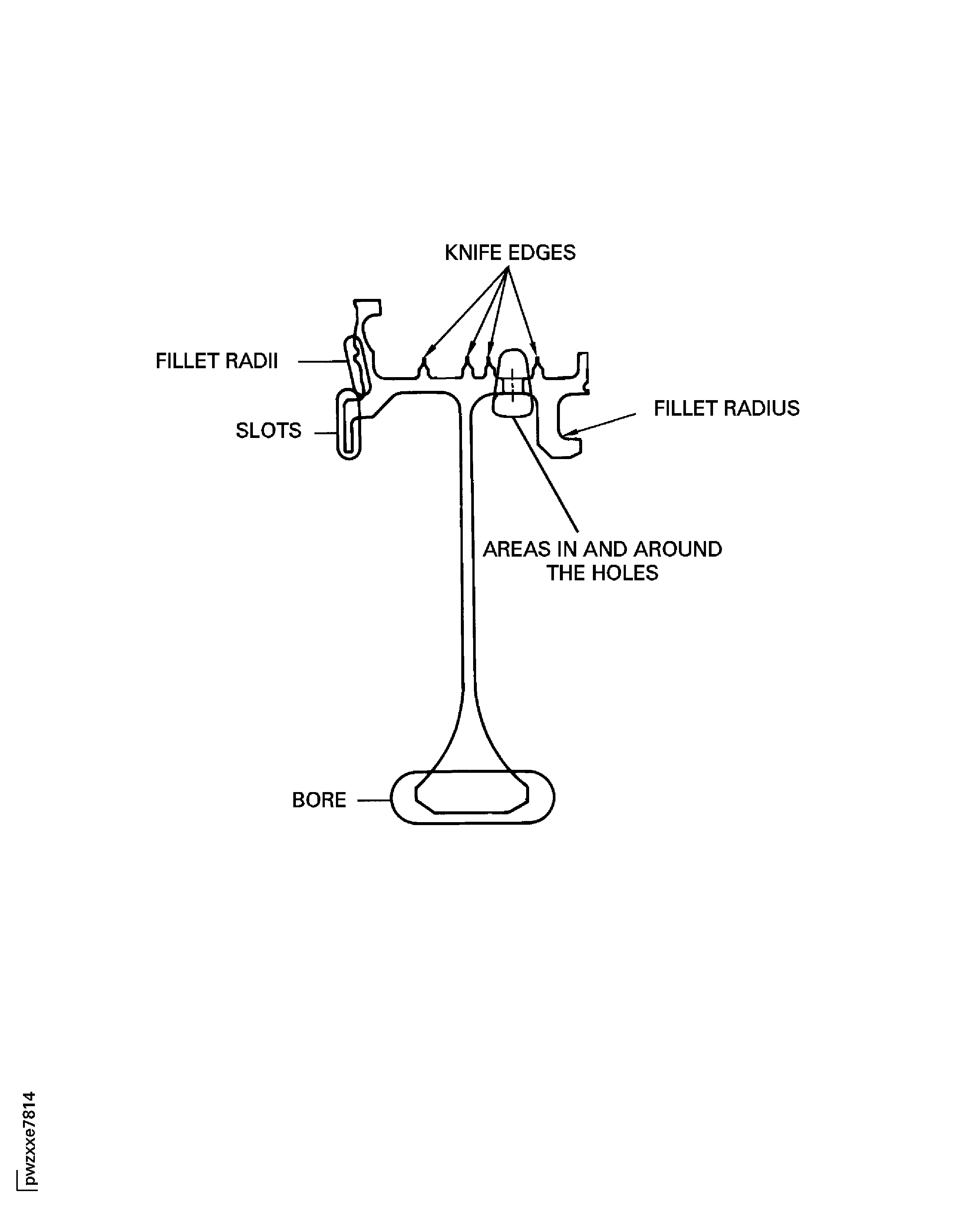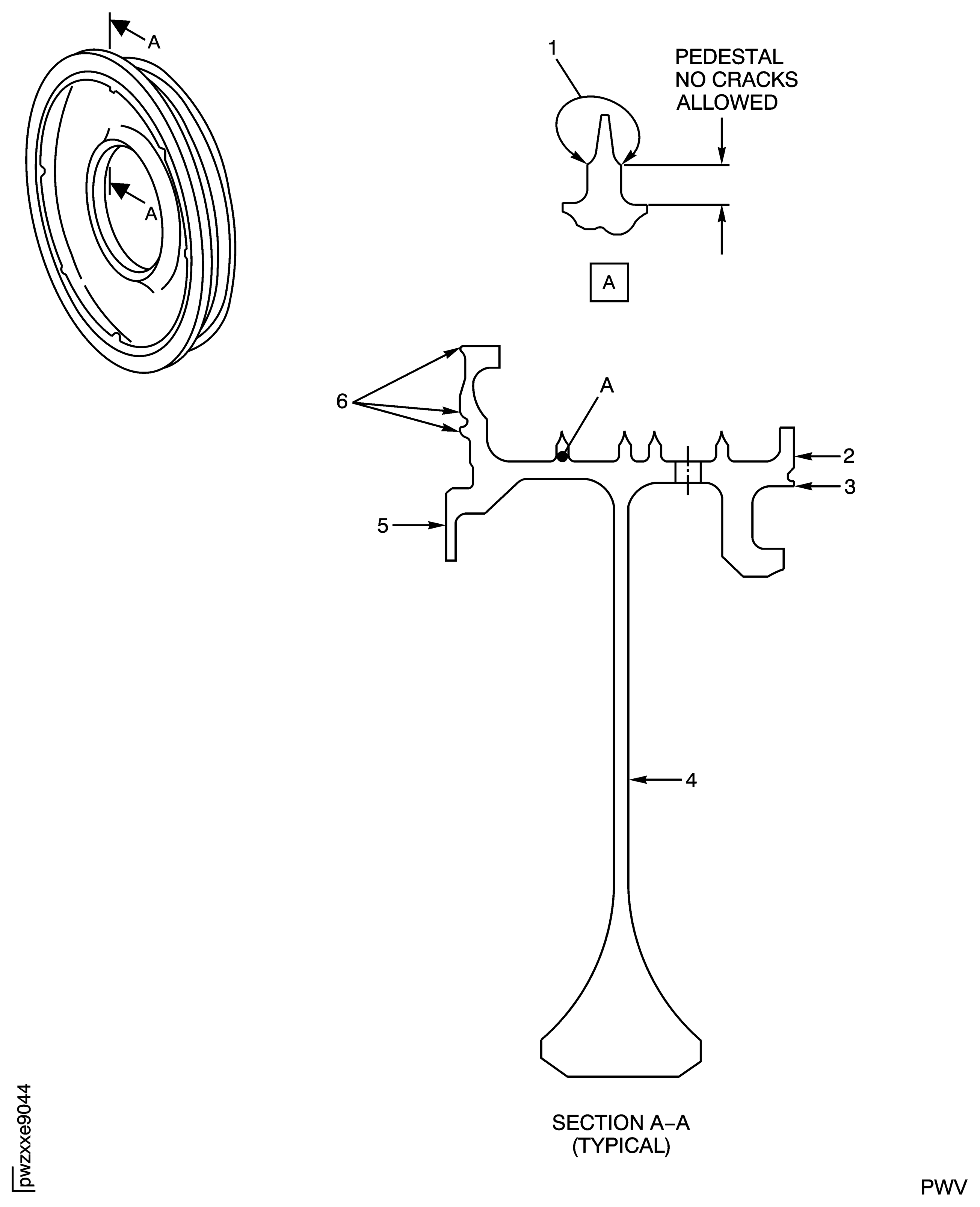 If the crack originates at the fillet radius (outer diameter side) and extends through to the inner diameter side, reject the HPT stage 1 hub HPT Stage 1 Hub (72-45-11, 01-011) and HPT stage 1air seal - rear ENGINE-STAGE 1 AIR SEAL (REAR) (72-45-15, 01-020).