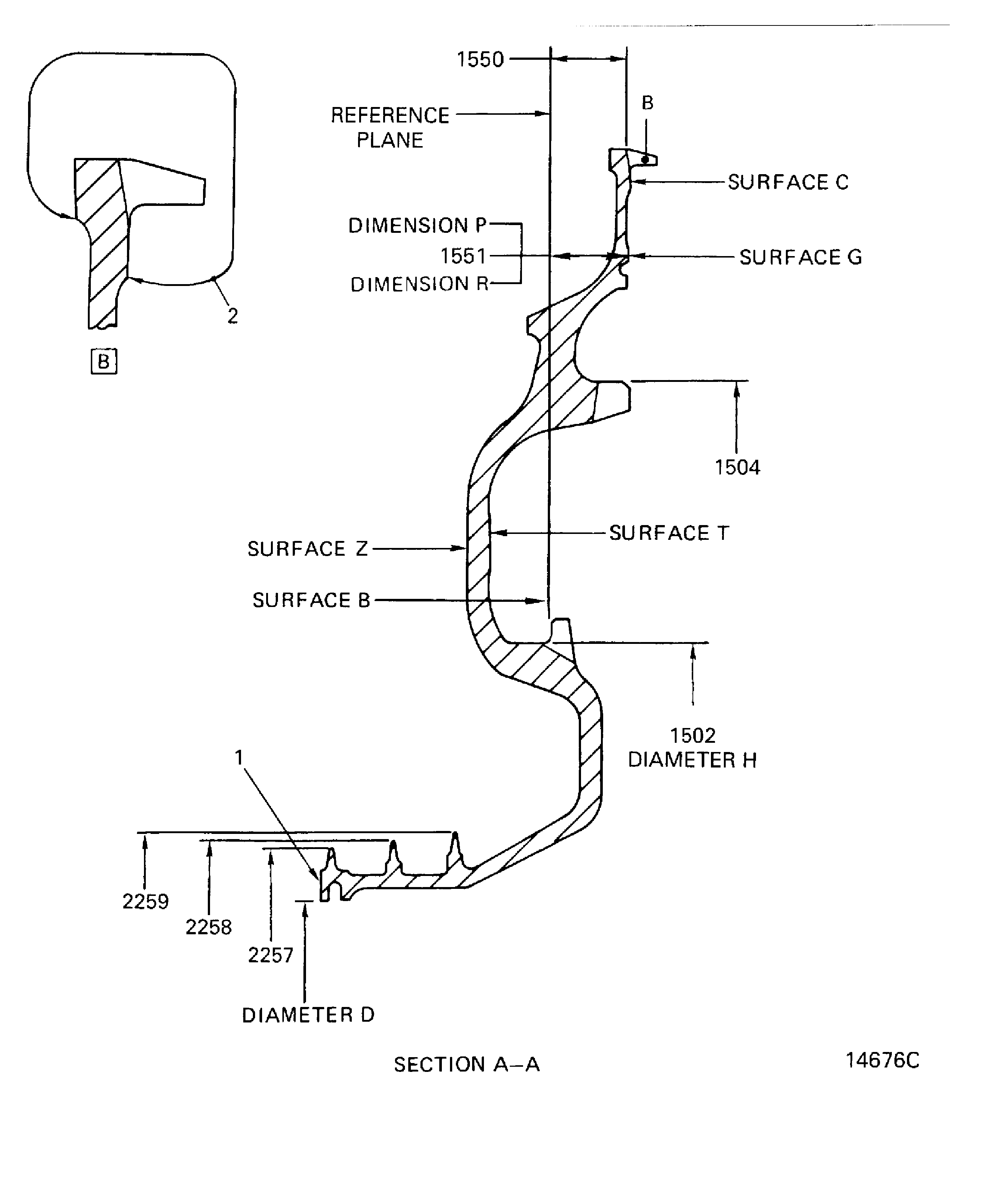If the measured diameters in a free condition are not satisfactory, a held condition is permitted. All dimensions apply when Surface B is flat by 0.0005 in. (0.0127 mm), Diameter D maintains a clearance envelope of 10.664 in. (270.866 mm), and the seal maintains Dimension P by 0.0005 in. (0.0127 mm) in a free or held condition. Dimension P is 0.503 in. (12.776 mm). The air seal must be held only on Surfaces B, C, G, T and Z, and Diameter D. In a free condition Dimension R is applicable and Diameter D is between 10.660 and 10.680 in. (270.76 mm and 271.27 mm) and Diameter H is between 14.160 in. and 14.172 in. (359.66 mm and 359.97 mm). Dimension R is between 0.502 in. and 0.523 in. (12.75 mm and 13.28 mm).Refer to Figure.