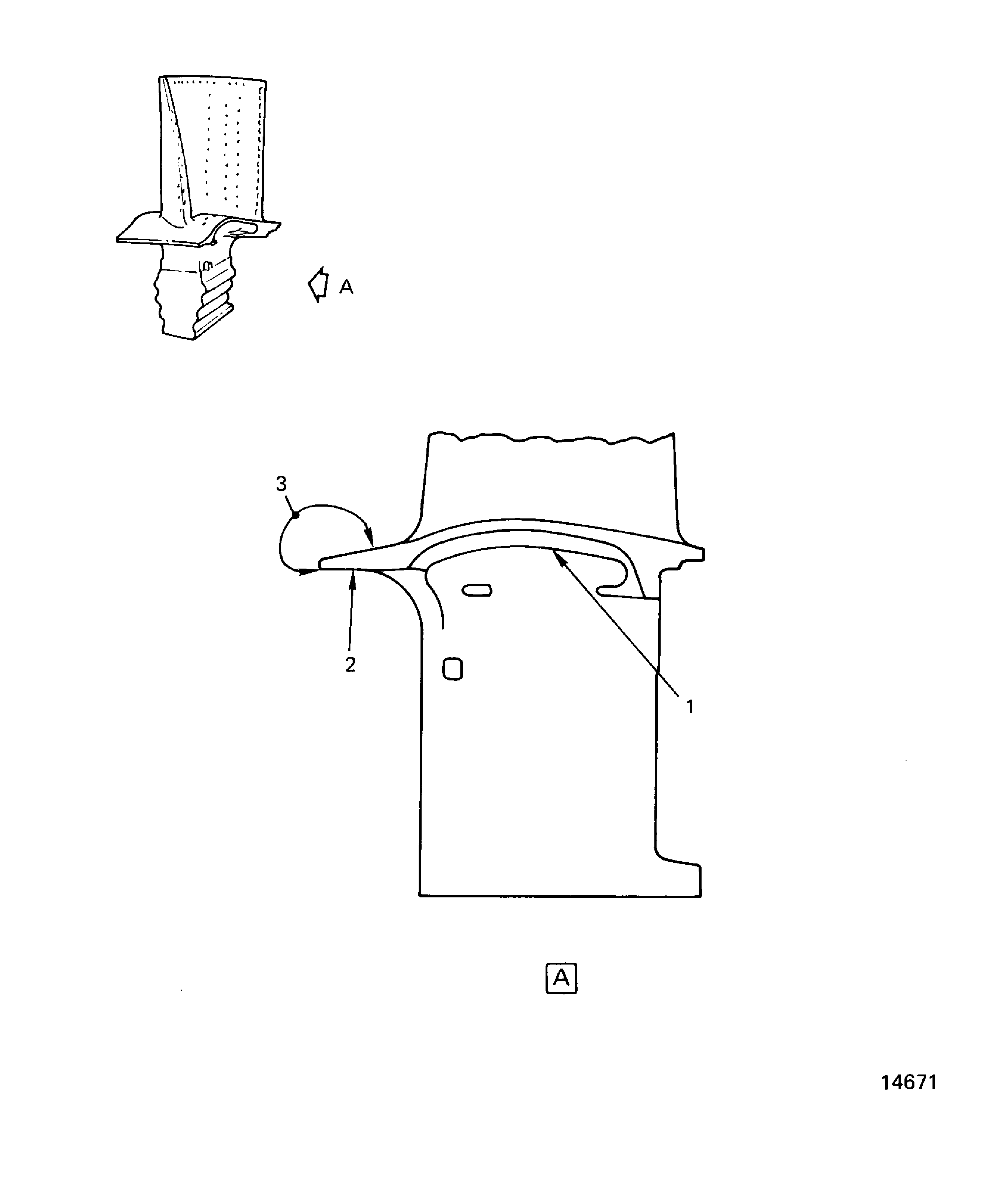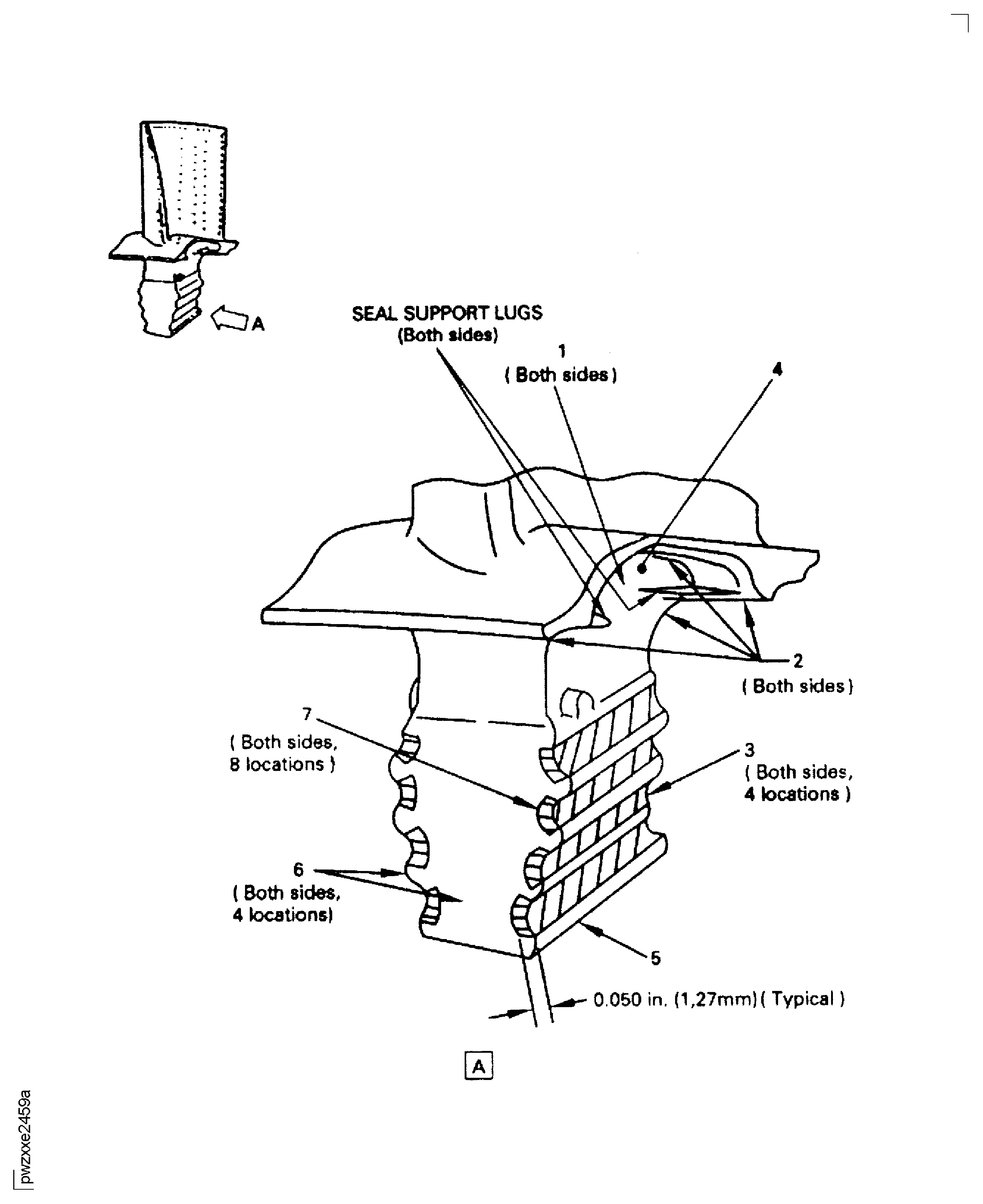 Examine the blade root attachment area for pitting, nicks and cracks at locations 2, 3 and 7. Use a white light and a 10X magnification to examine for cracks.