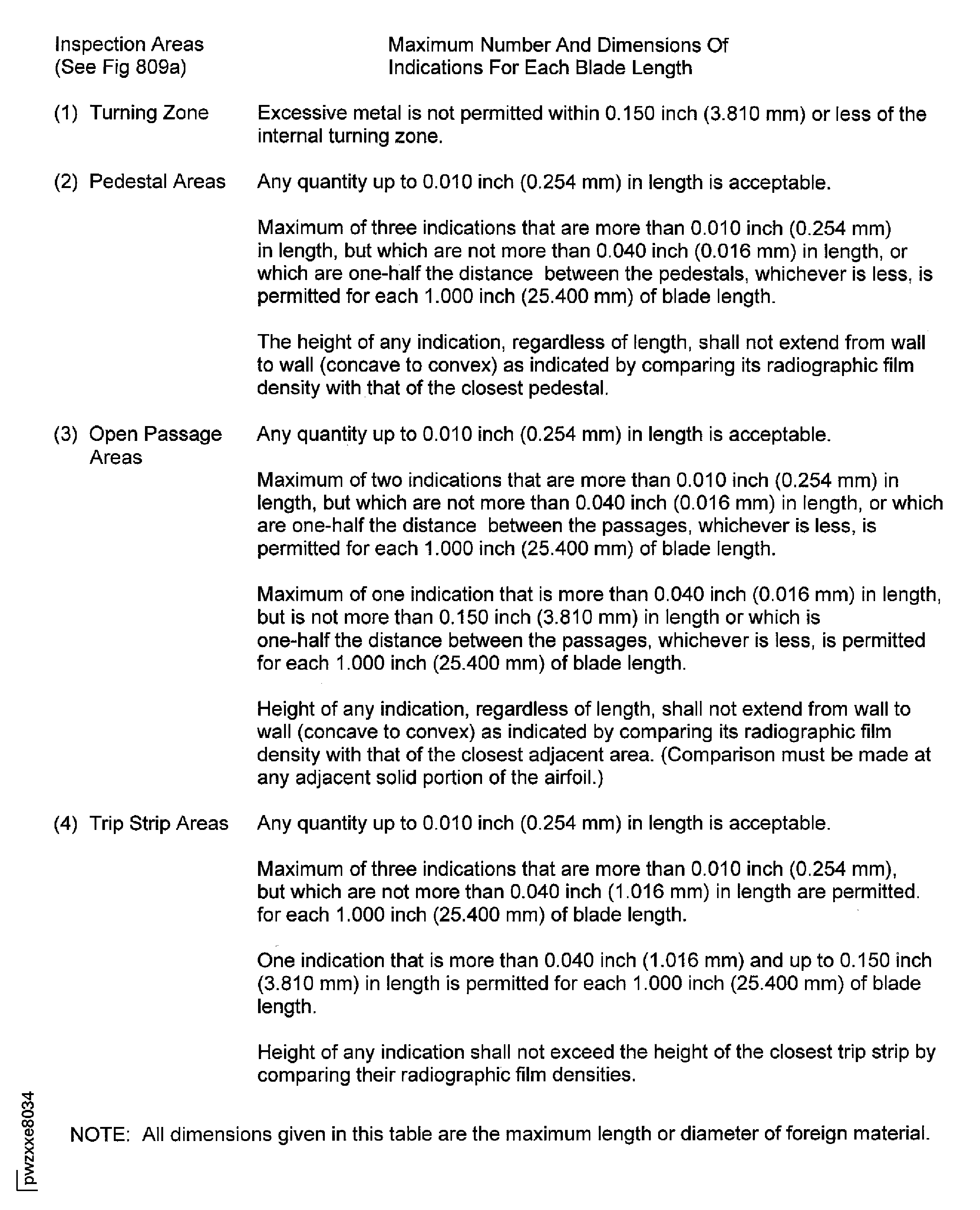 If there are any indications of shot peen and/or other forms of foreign material. e.g. metal chips or broken wire that are distinguishable by there shape, form or density, the parts shall be rejected.After cleaning the internal cavities refer to VRS3357 TASK 72-45-14-300-005 (REPAIR-005), unwanted metal and materials are acceptable provided the size, density and location of the indication(s) has remained unchanged from step (2) (b). Refer to the limits in Figure and Table 801.