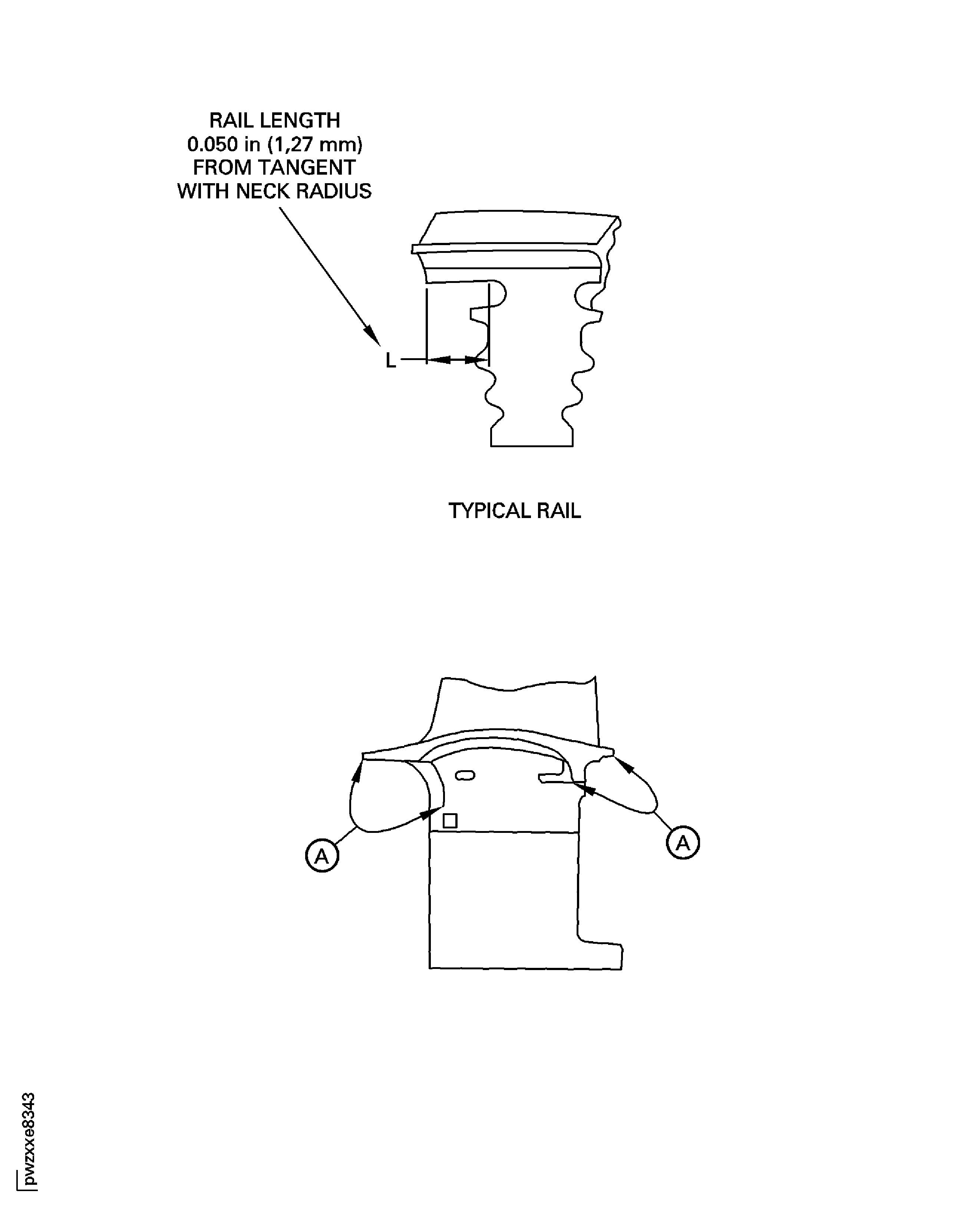 Examine the base of the underplatform damper pins for anomalies by visual inspection with a white light and a minimum of 10X magnification. Acceptable anomalies have a length of 0.070 in. (1.778 mm) or less. Indications that go from the centerline of the damper pin radius to the blade root, are not acceptable. Indications on the blade root are not acceptable. Any quantity of linear anomalies is permitted. IAE 2P16508 Reference card 1 off shows examples of acceptable linear anomalies. Cracks inside or which start from linear anomalies are not permitted. Fluorescent penetrant inspect questionable indications. Acceptable linear anomalies will not retain fluorescent penetrant fluid.