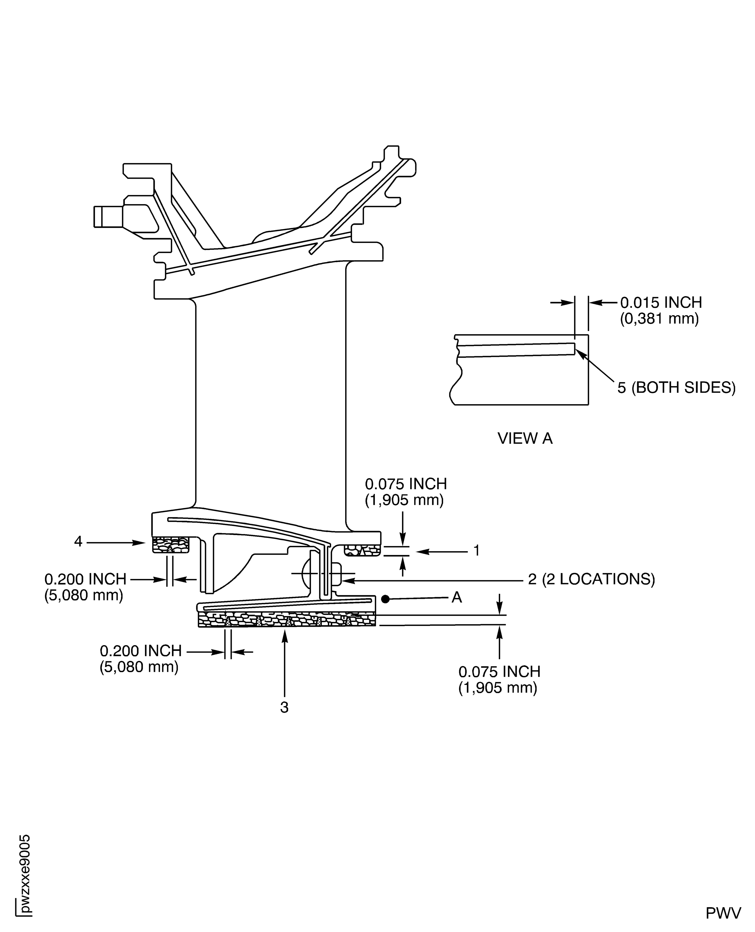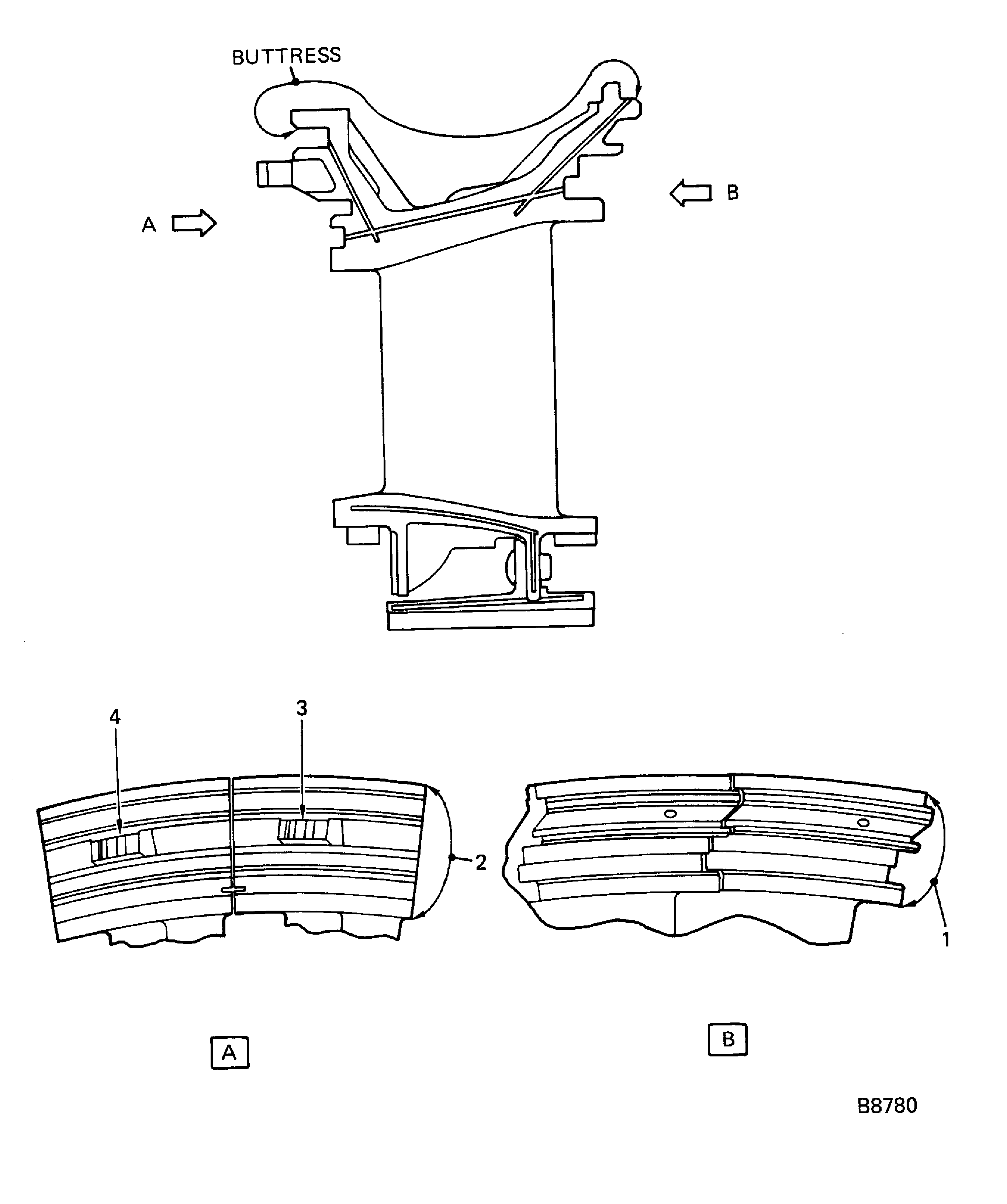 Examine the vane clusters outer diameter vane buttress for wear at locations 1 and 2.