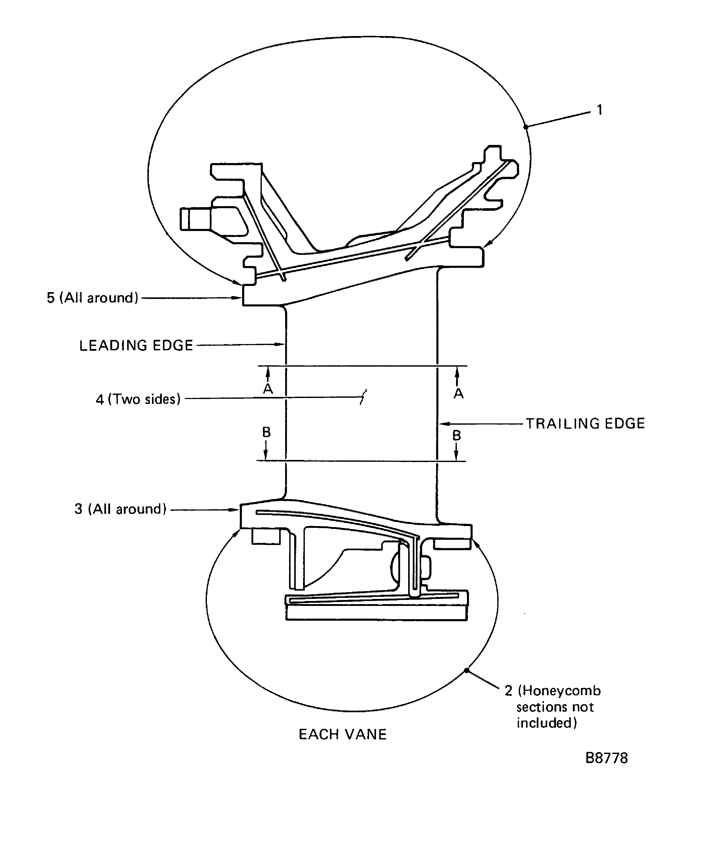 Examine the vane clusters for feather seals between the detail vanes at locations 1, 2 and 3.