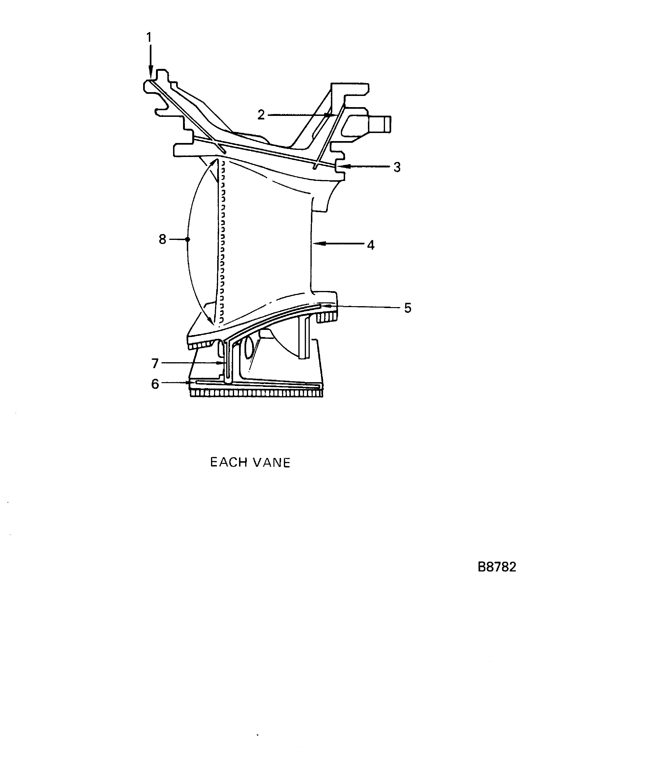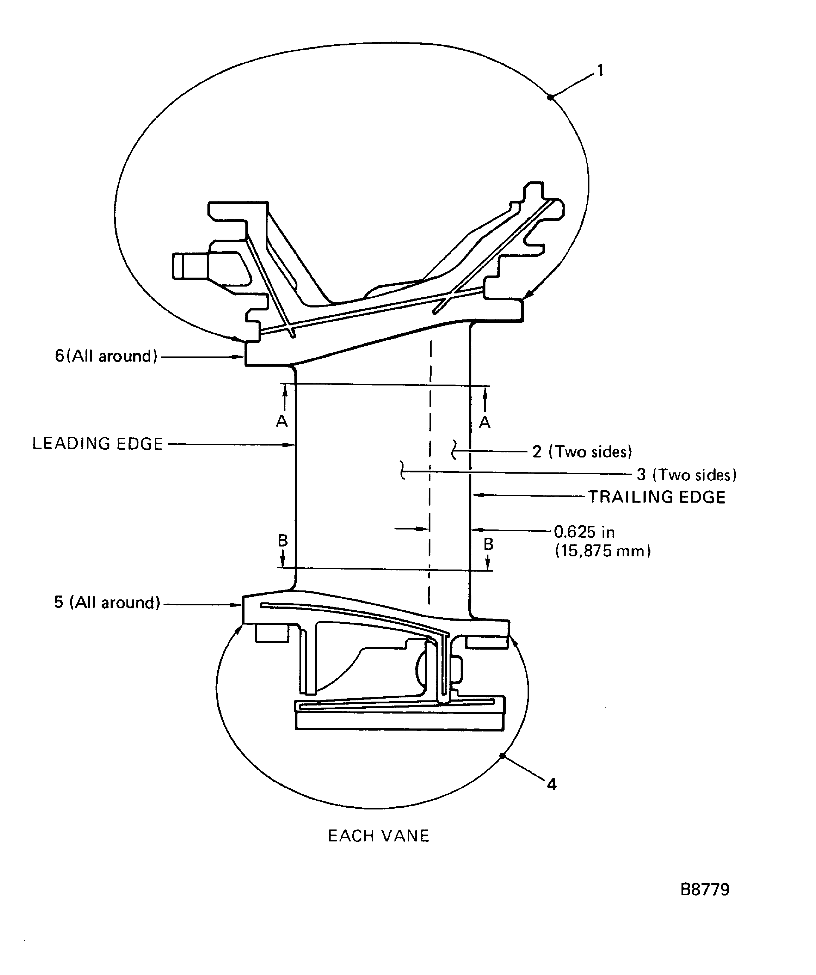 Examine the vane clusters for feather seal slots for burned areas and unwanted material on each end at locations 1, 2, 3, 5, 6 and 7.