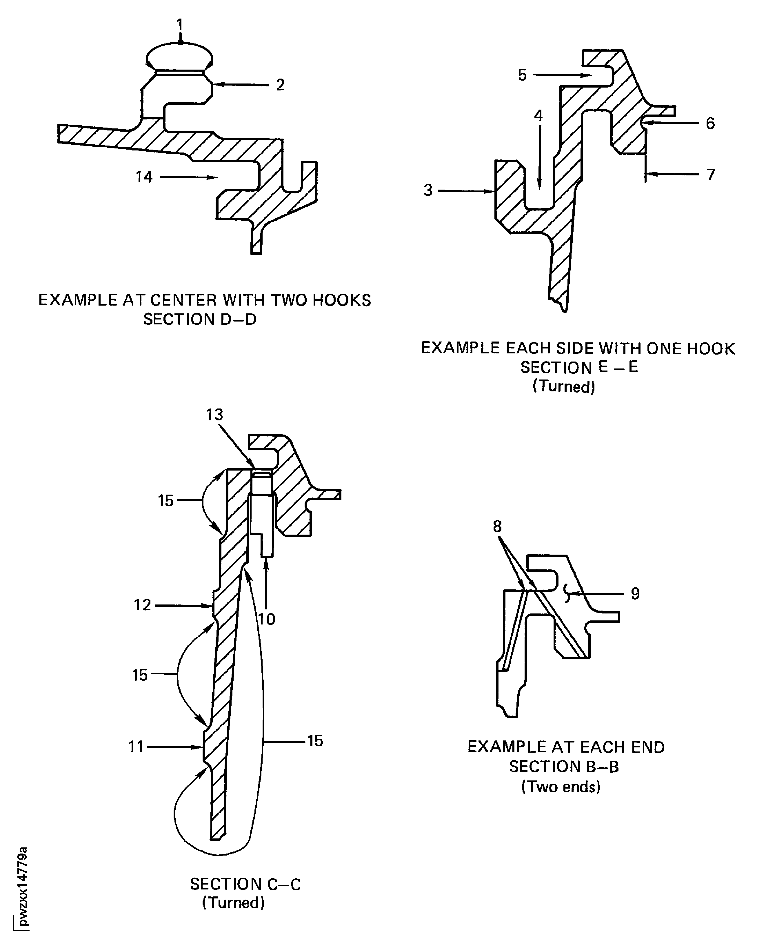 Examine the duct support detail assemblies hook contact surface for wear on the coating at location 1 (two hooks).