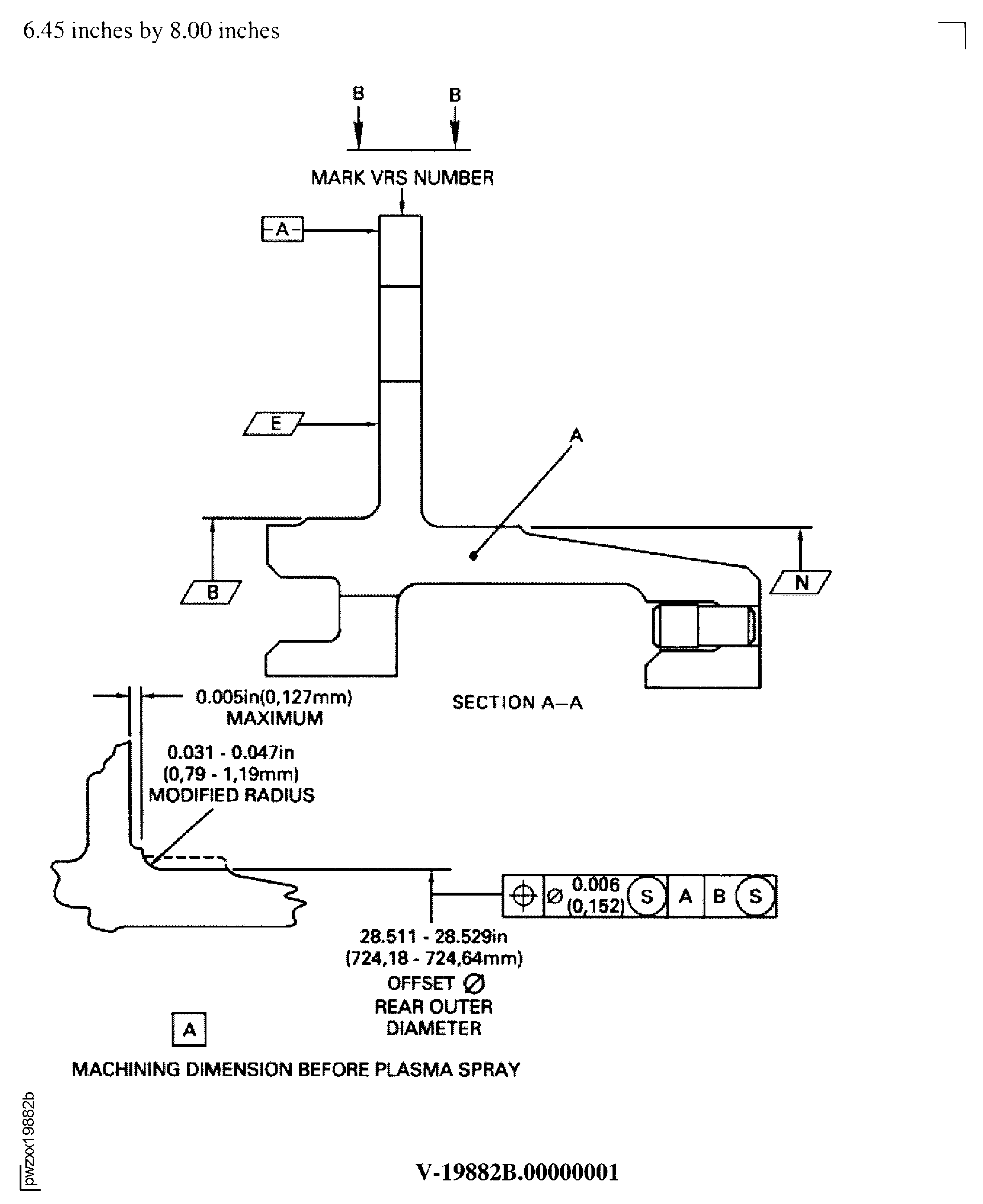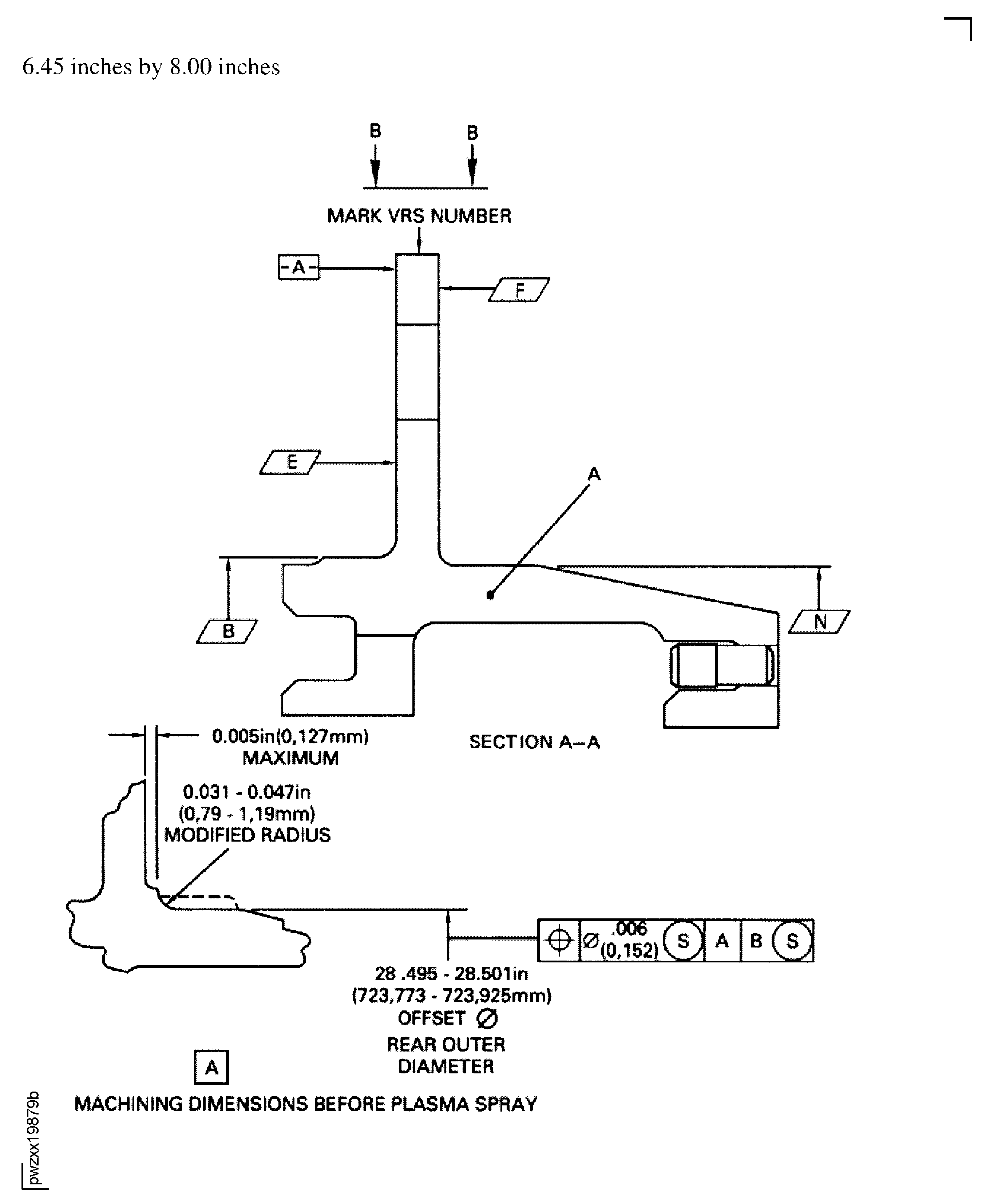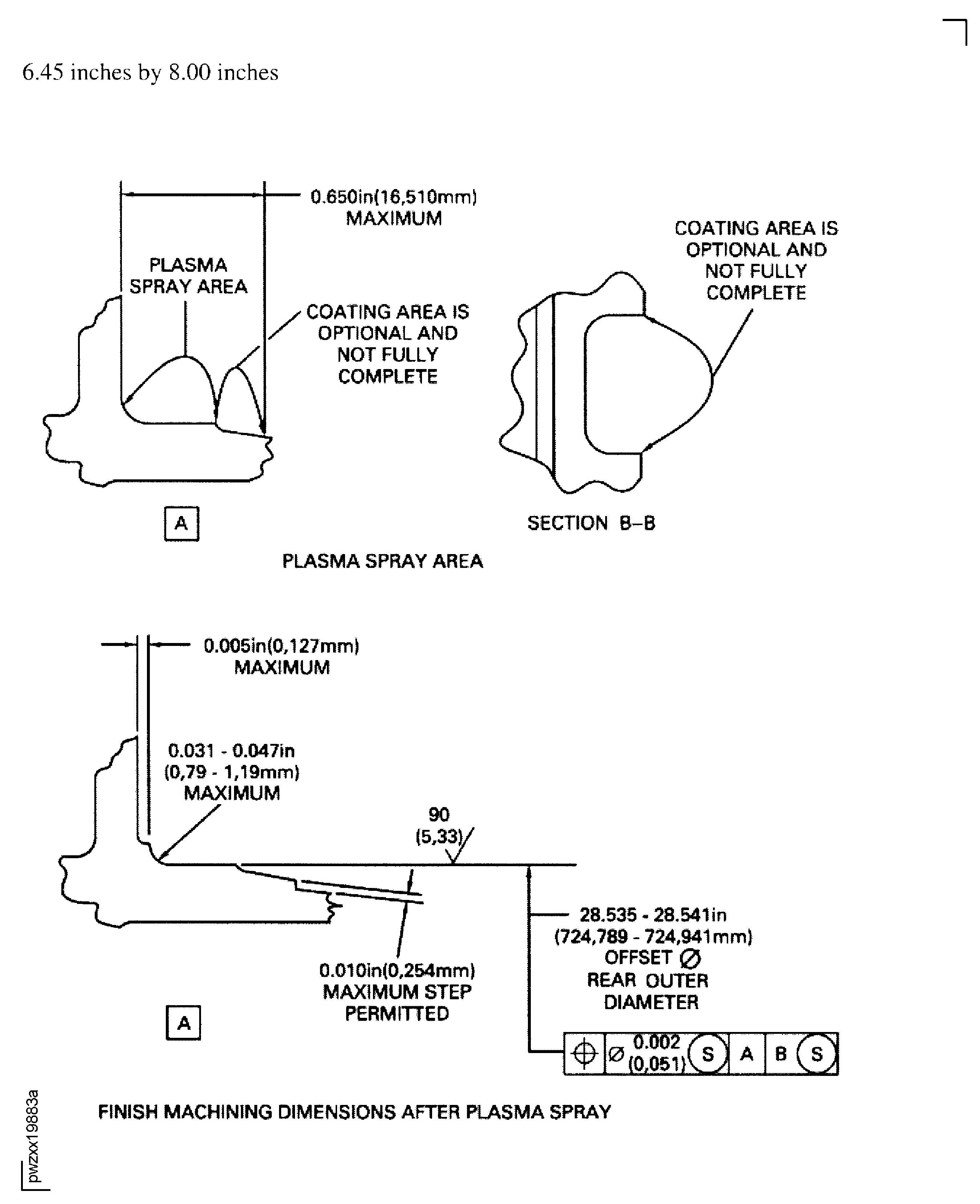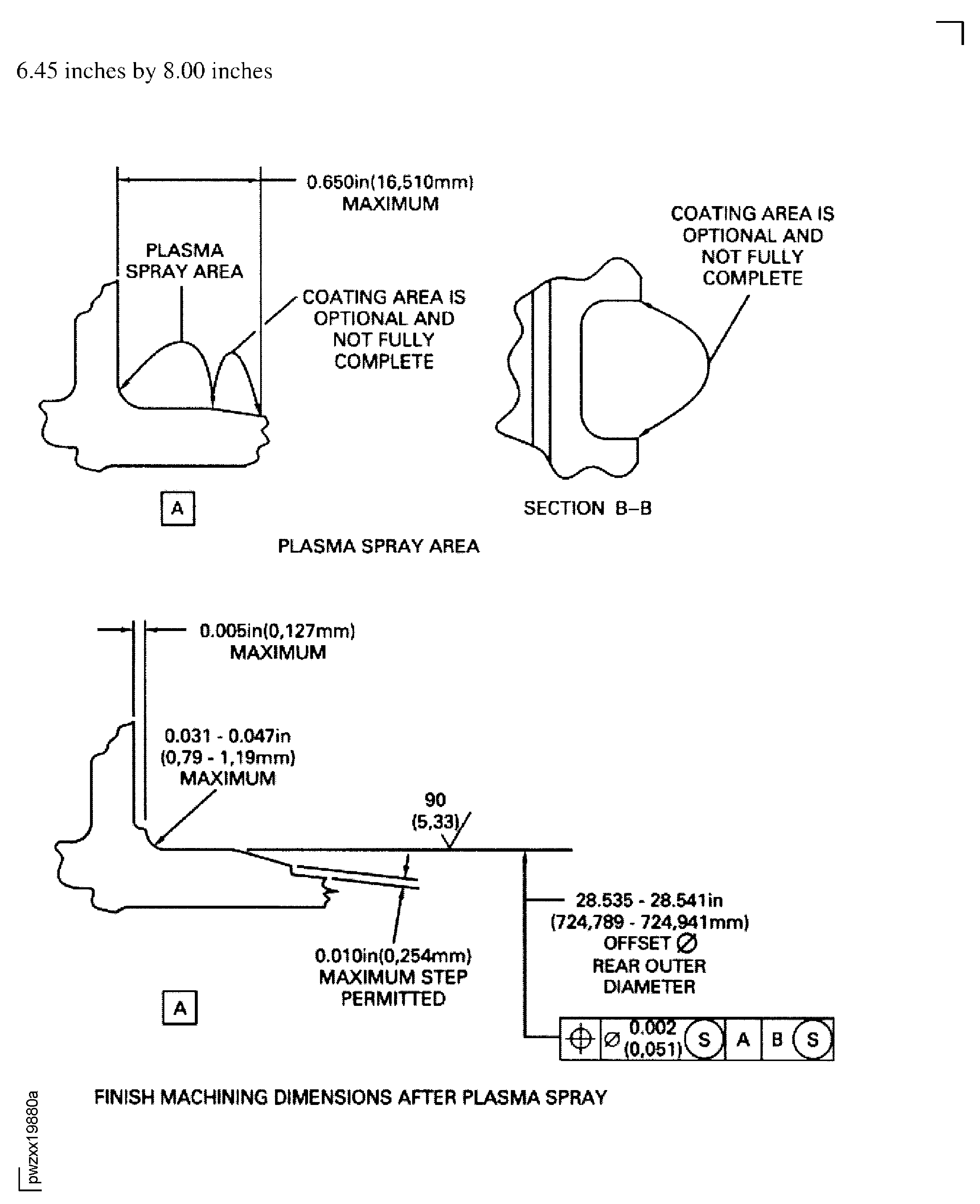 All dimensions apply when Surface E is flat by 0.002 in. (0.051 mm) and Diameter B maintains a clearance envelope of 28.592 in. (726.925 mm) in a free or held condition. In a held condition, hold the air seal only on Surfaces E and F and Diameter B. In a free condition Surface E is flat by 0.010 in. (0.254 mm) and Diameter B is 28.550 to 28.626 in. (725.17 to 727.10 mm) in diameter.Apply the plasma spray to a sufficient thickness which will permit the final machining of the dimensions given in the Figure.