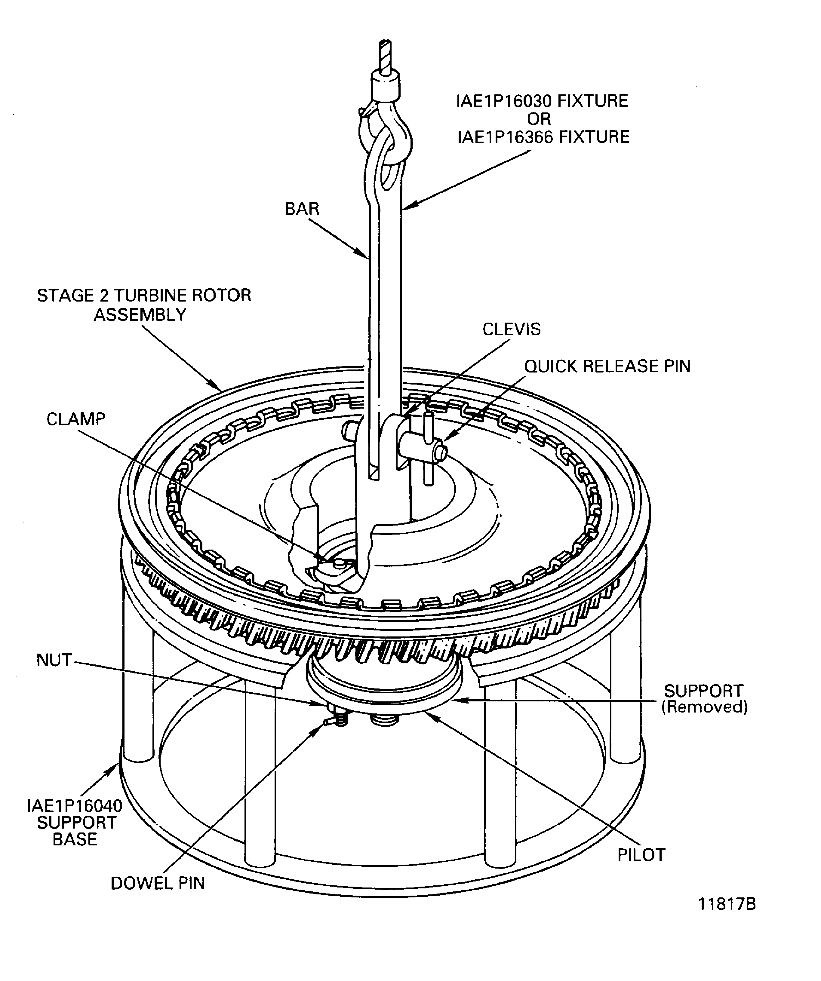 Remove the IAE 1P16063 Fixture and IAE 1P16017 Lift fixture from the assembly.
