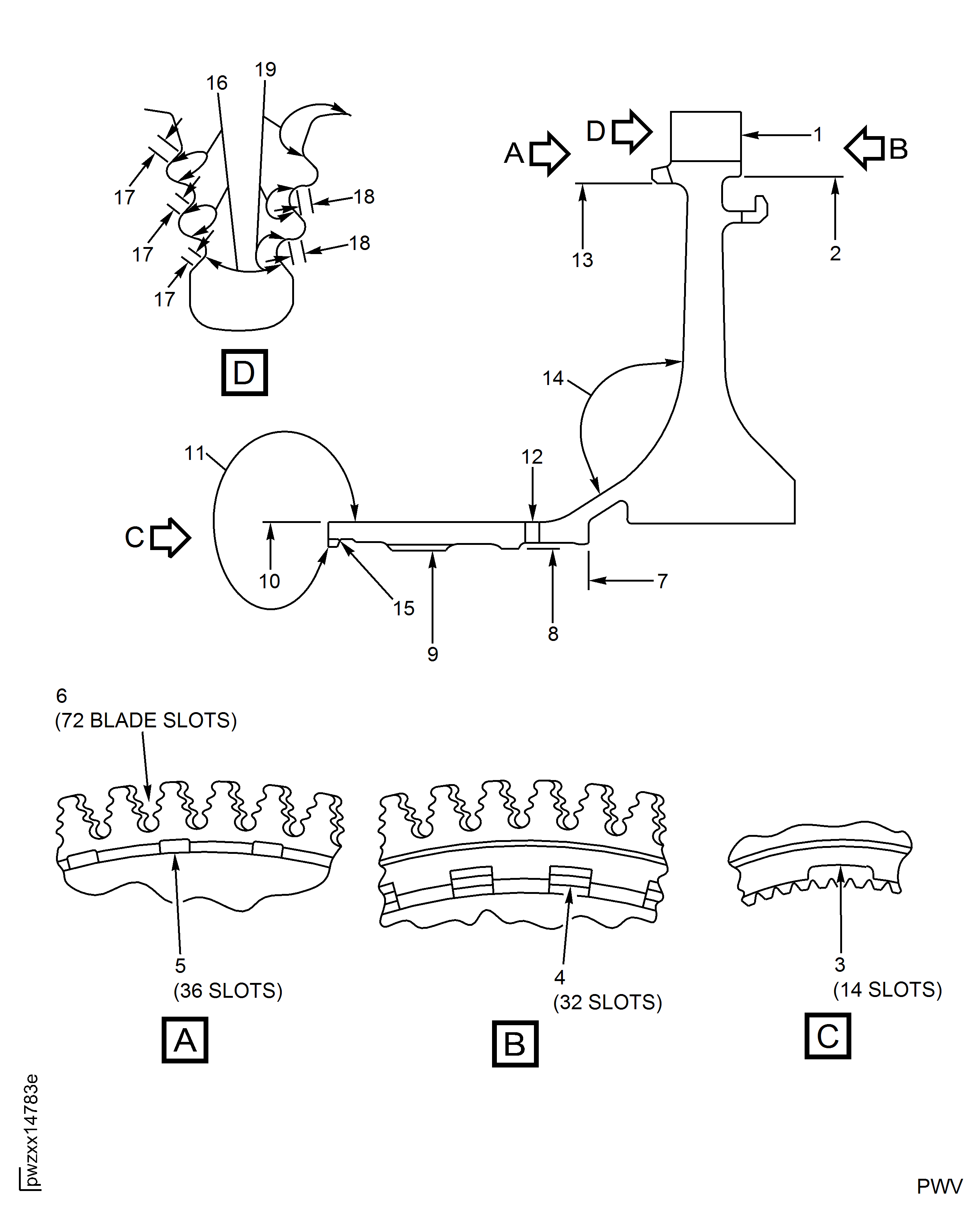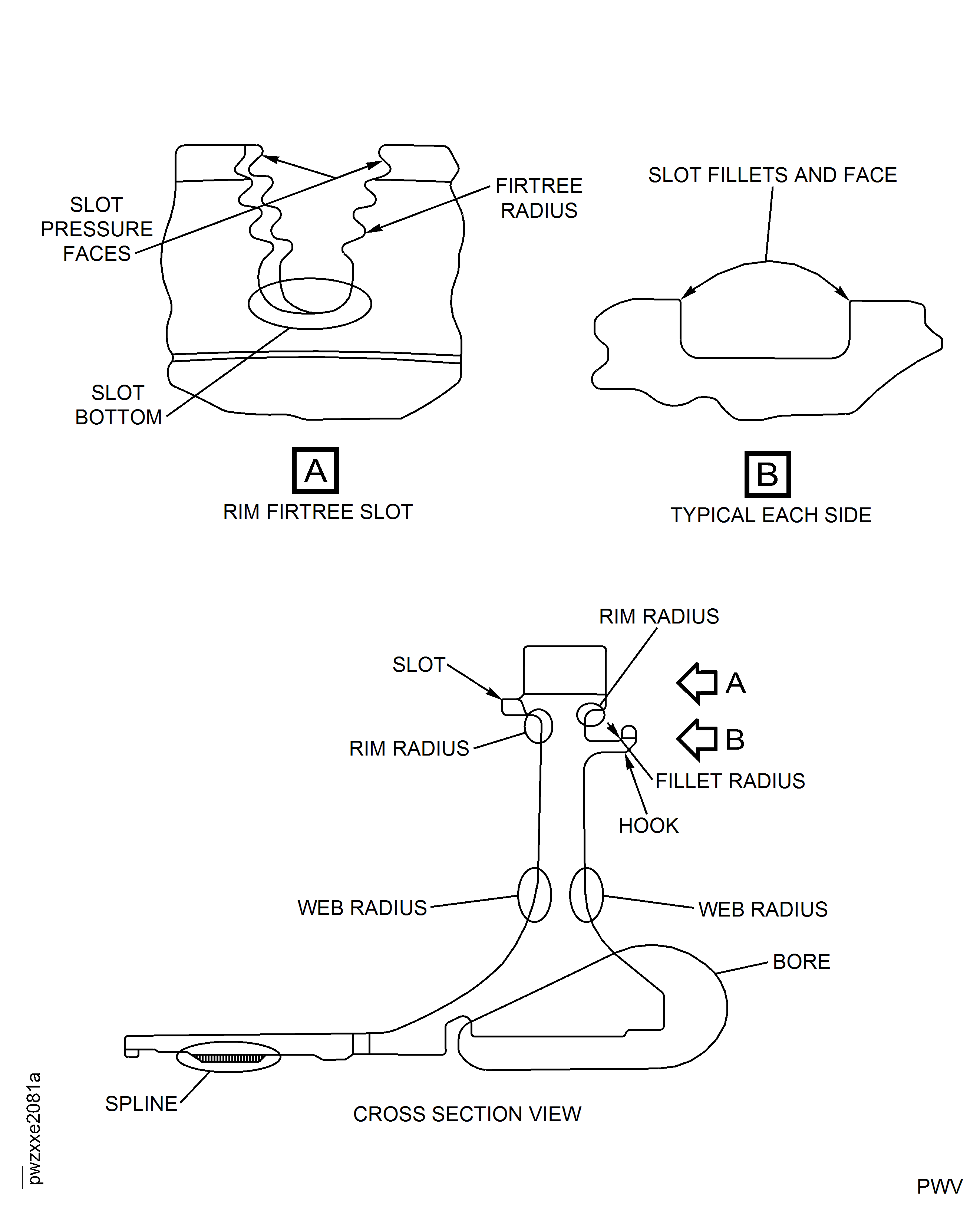 When you inspect the stage 2 turbine hub for cracks make sure you check the important areas. These areas are shown in Figure.Do the test for cracks on the part that is given below. Carefully examine slot pressure faces, slot bottom, firtree radius, rim radius, fillet radius, web radius, bore, spline, hook, slot fillet, and face. Use the applicable penetrant inspection procedure.
