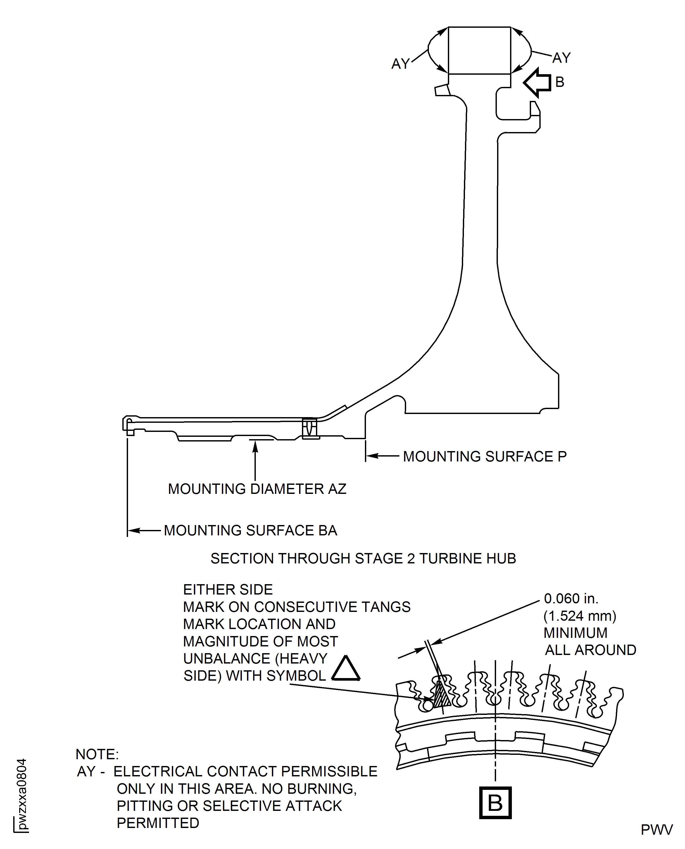 Mark location and magnitude of the most heavy unbalance (heavy side) with the symbol on consecutive tangs. Refer to SPM TASK 70-09-00-400-501, Procedures to Make Permanent Identification And Location Marks. Use deep electrolytic etch method.