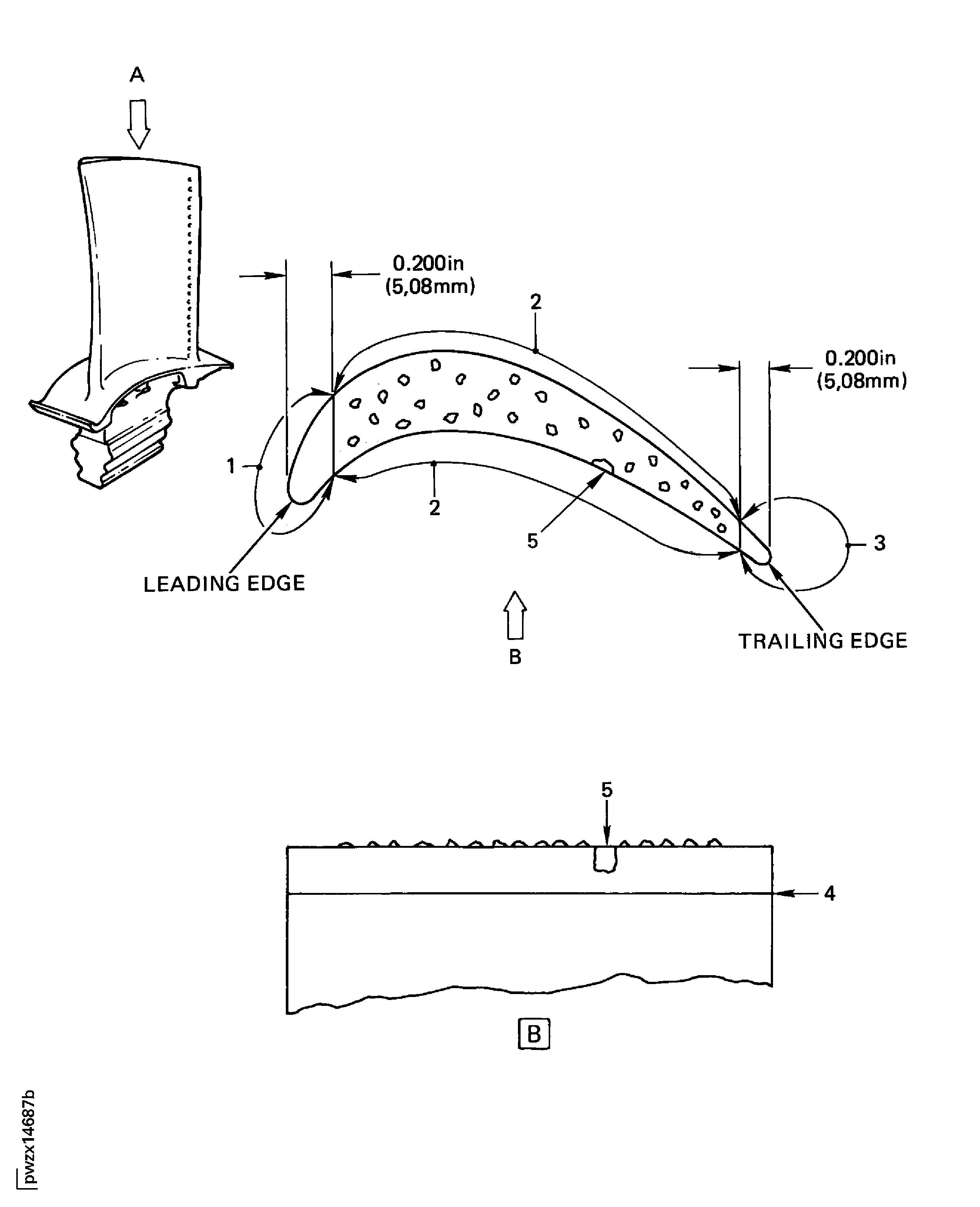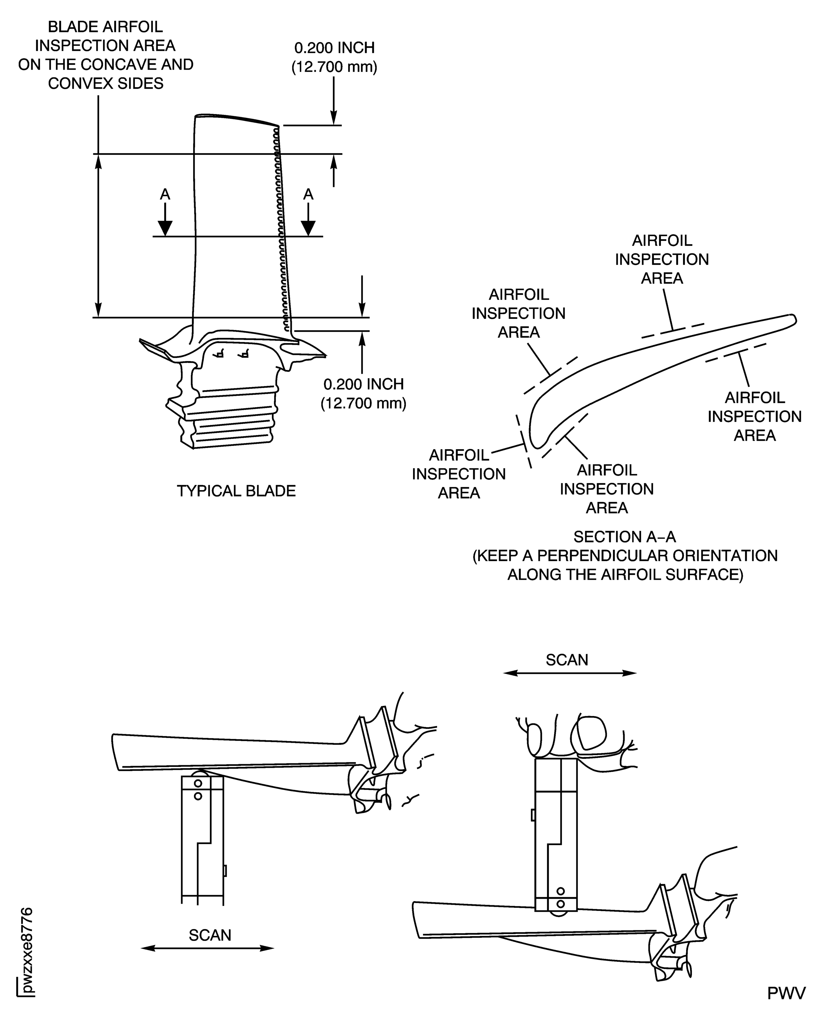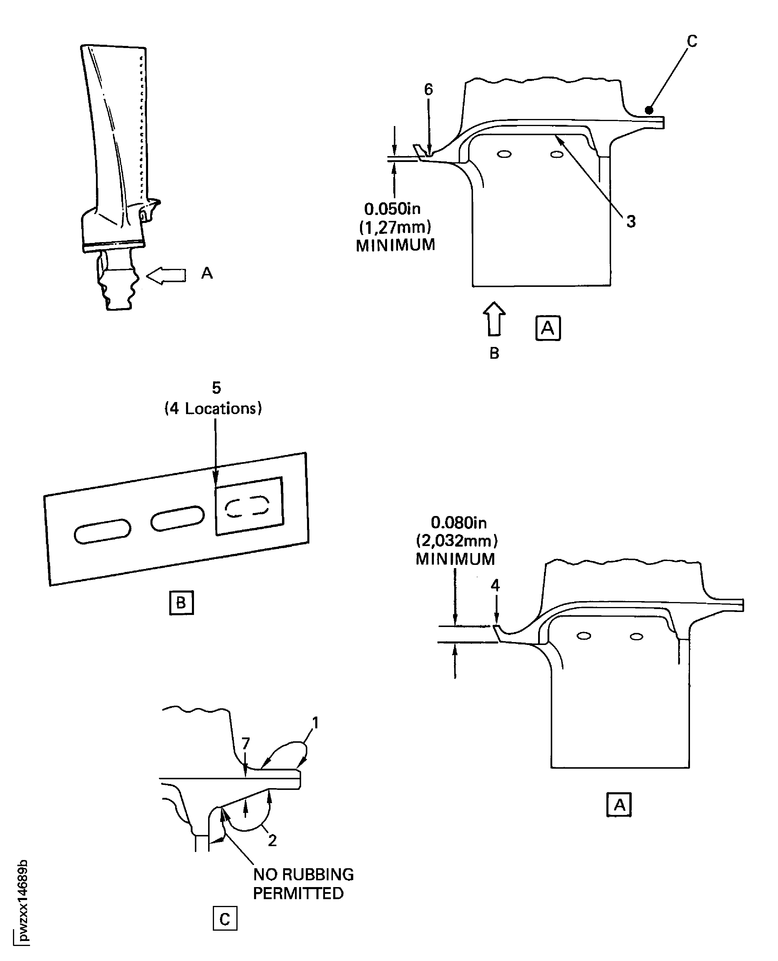 The radiographic inspection in positions A and B may require different exposure and film speeds in order to provide adequate contrast to inspect for cracks, due to the thicker section at the root with respect to the airfoil (Refer to TASK 70-26-01-260-501, Section 7).NOTE
