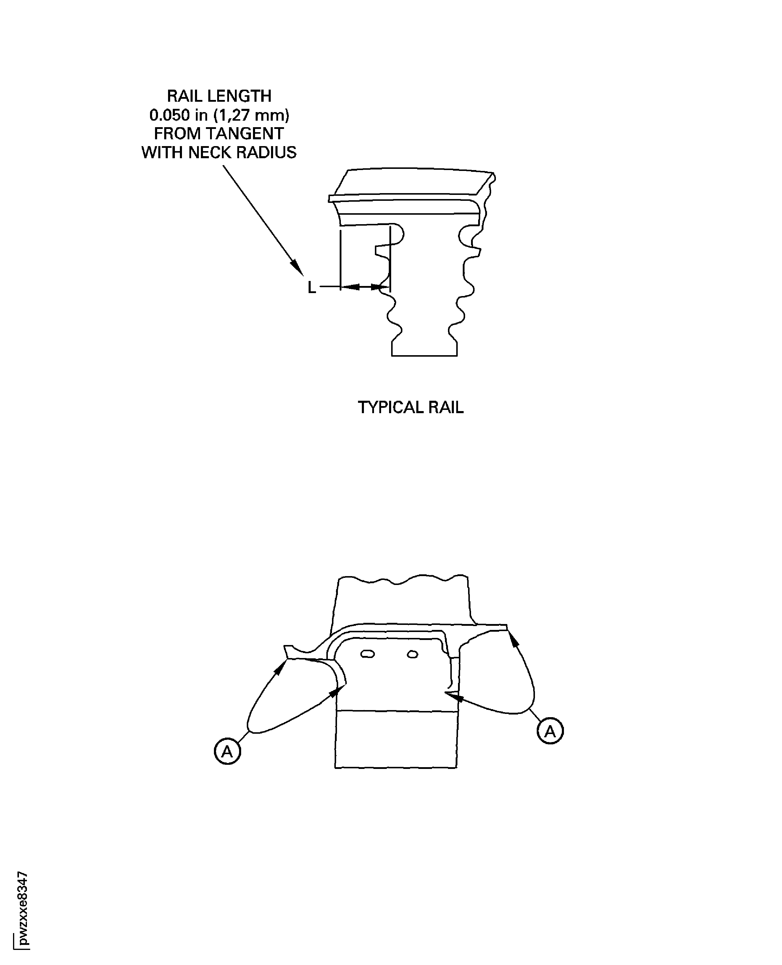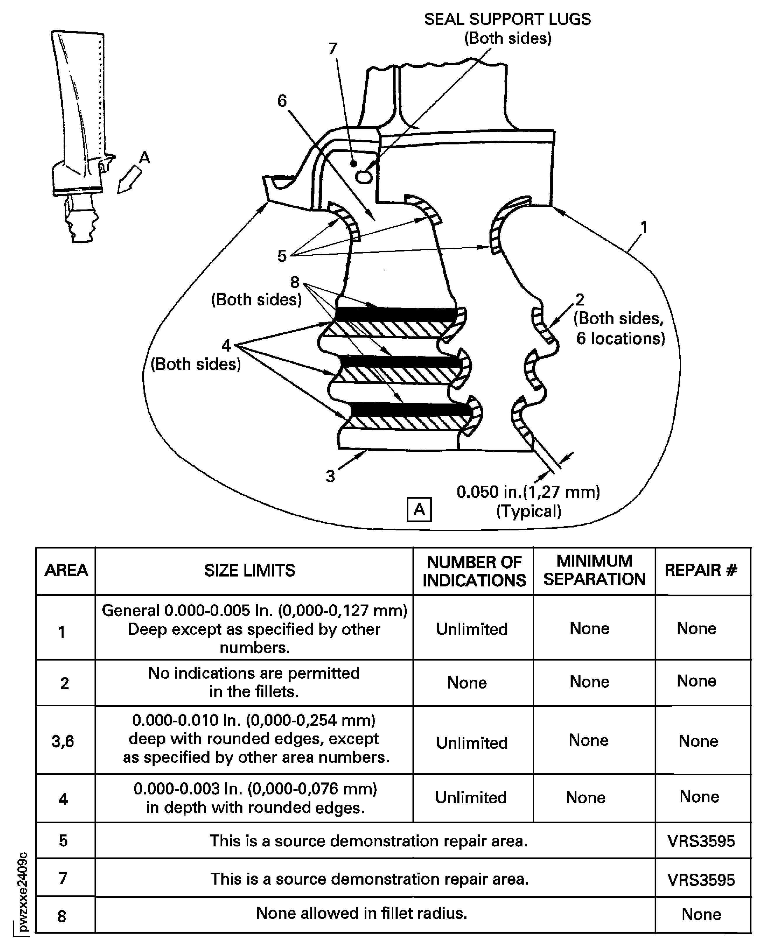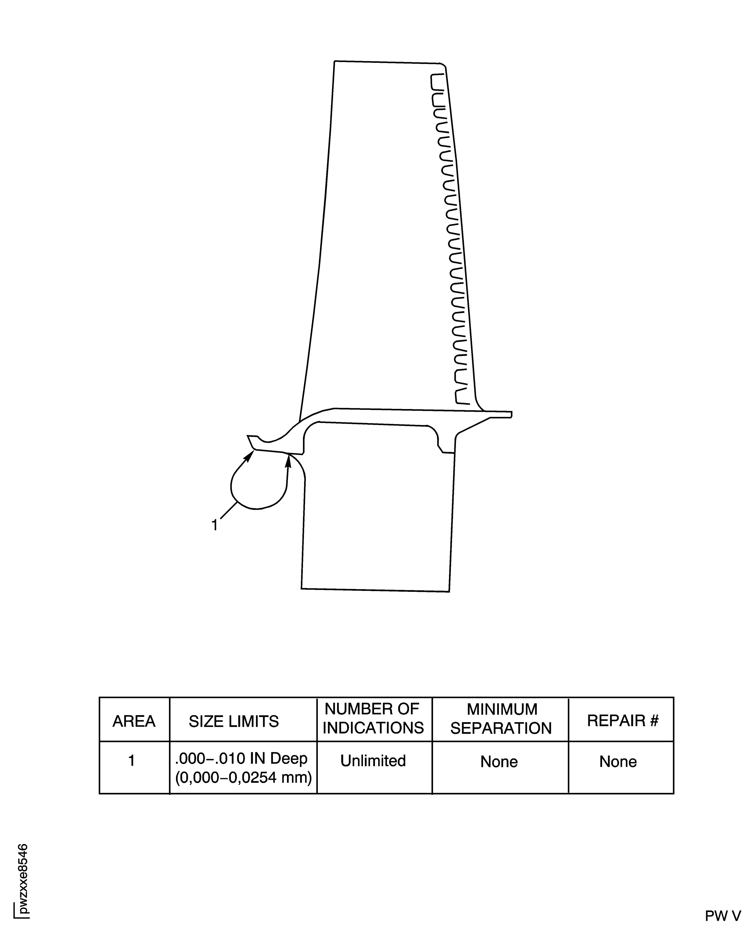 Examine the base of the underplatform damper pins for anomalies by visual inspection with a white light and a minimum of 10X magnification. Acceptable anomalies have a length of 0.070 in. (1.778 mm) or less. Indications that go from the centerline of the damper pin radius to the blade root, are not acceptable. Indications on the blade root are not acceptable. Any quantity of linear anomalies is permitted. IAE 2P16508 Reference card 1 off shows examples of acceptable linear anomalies. Cracks inside or which start from linear anomalies are not permitted. Fluorescent penetrant inspect questionable indications. Acceptable linear anomalies will not retain fluorescent penetrant fluid.