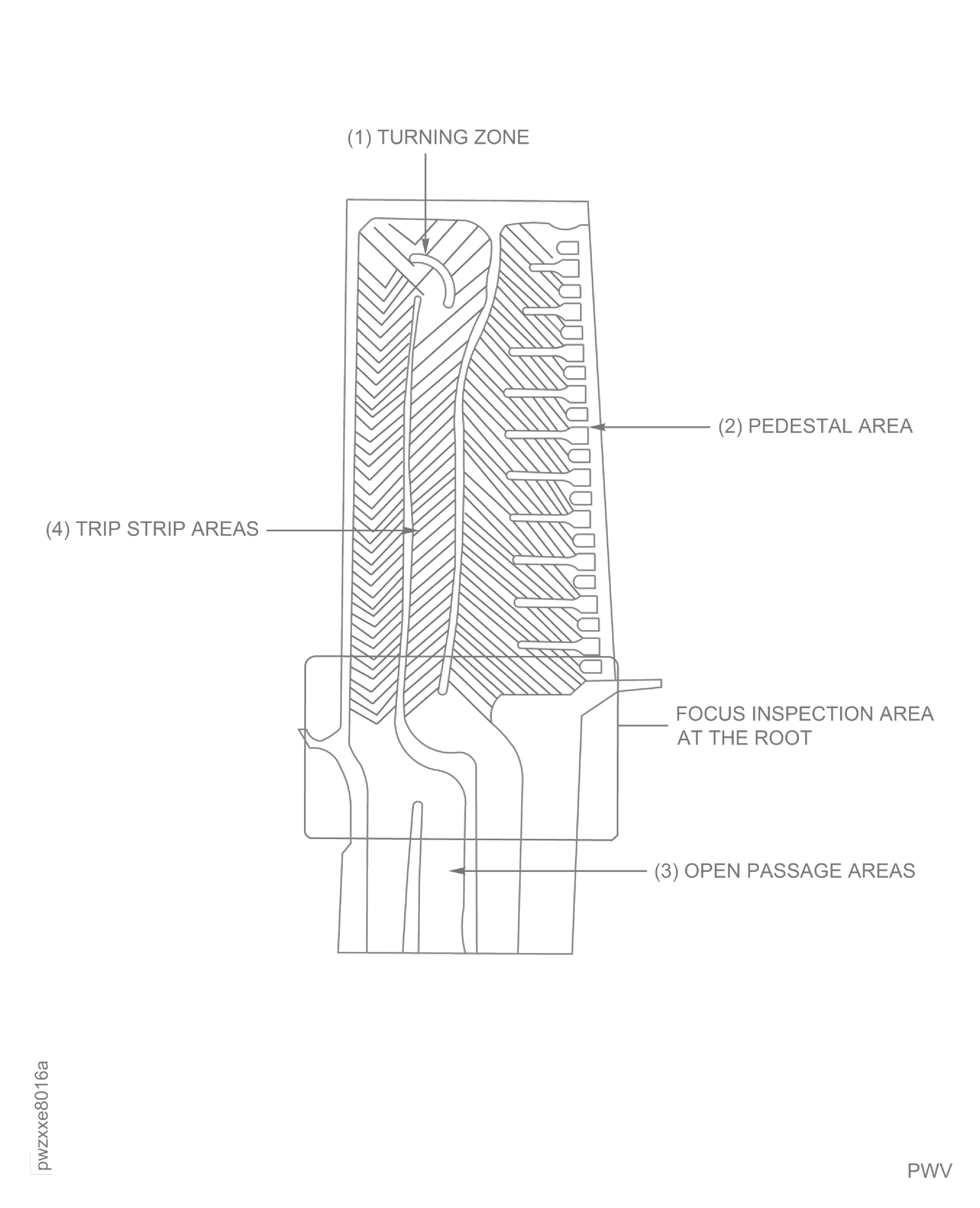 The entire blade should be inspected for cracks with a focus inspection at the root area as shown in Figure.