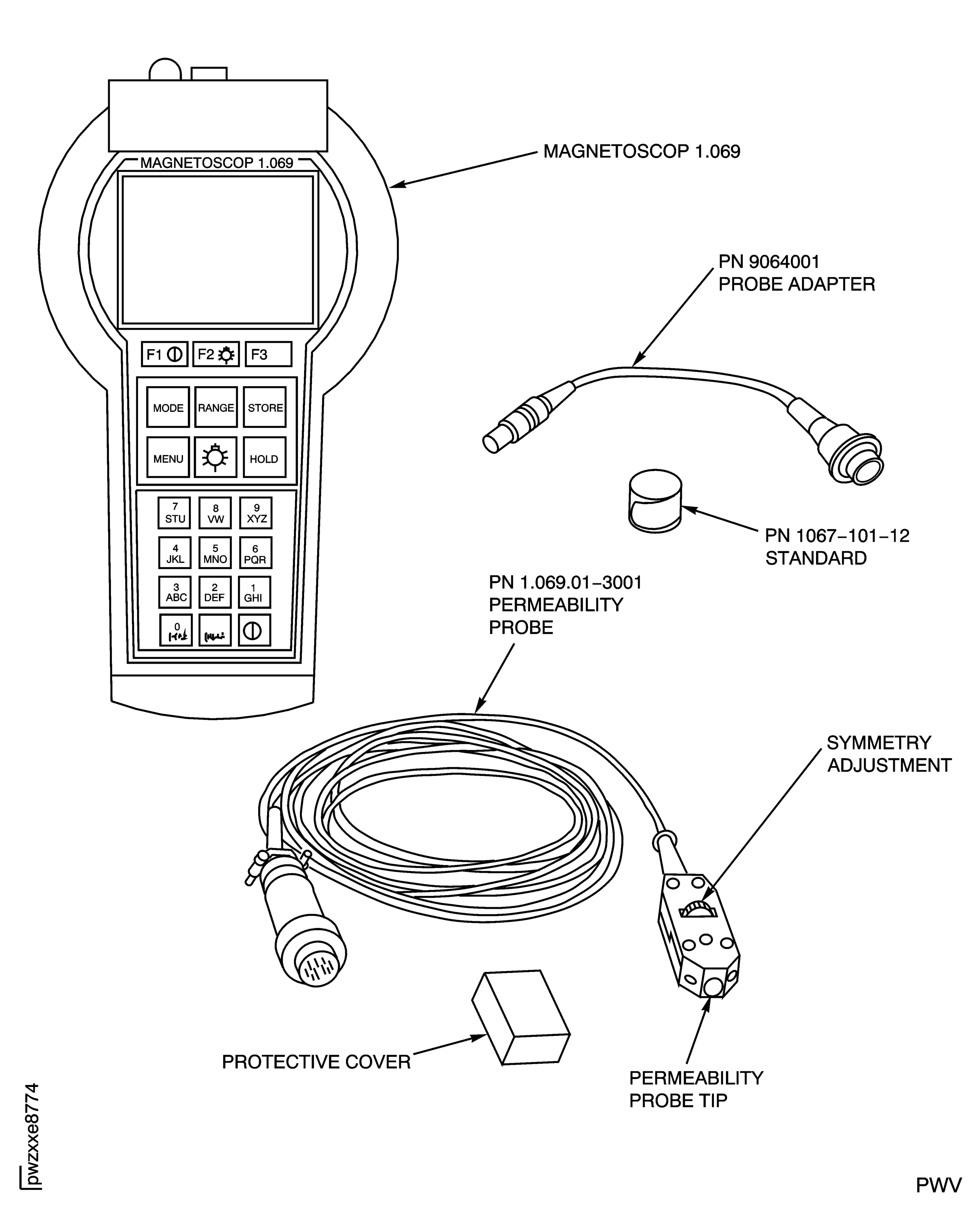 The Magnetoscop will find what type of probe is being used. If one of the old Magnetoscop 1.067 or 1.068 probes is used, a 1.069 probe adapter PN 9064001 will be needed to connect the probe to the unit. A menu on the magnetoscop will give a list of probes. You can then select the applicable probe to use. If you use the new probe designed for the Magnetoscop 1.069 model, the probe will be detected automatically.