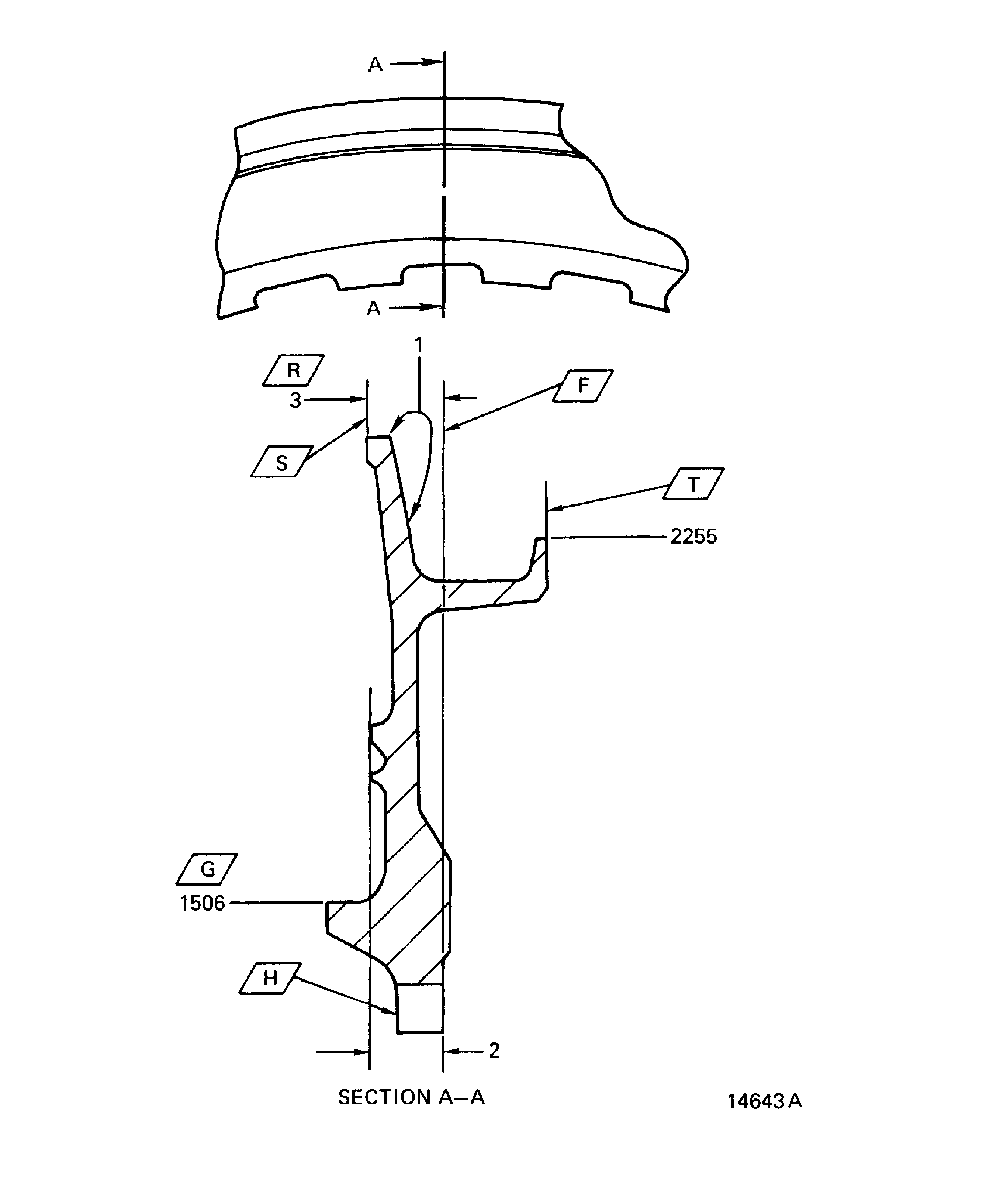 If the measured diameter in a free condition is not satisfactory, a held condition is permitted. All dimensions apply when Surface F is flat by 0.001 in. (0.025 mm) and Diameter G maintains a clearance envelope of 17.387 in. (441.630 mm) in a free or held condition. Hold the blade retaining plate only on Surfaces F, H, S, T and Diameter G.