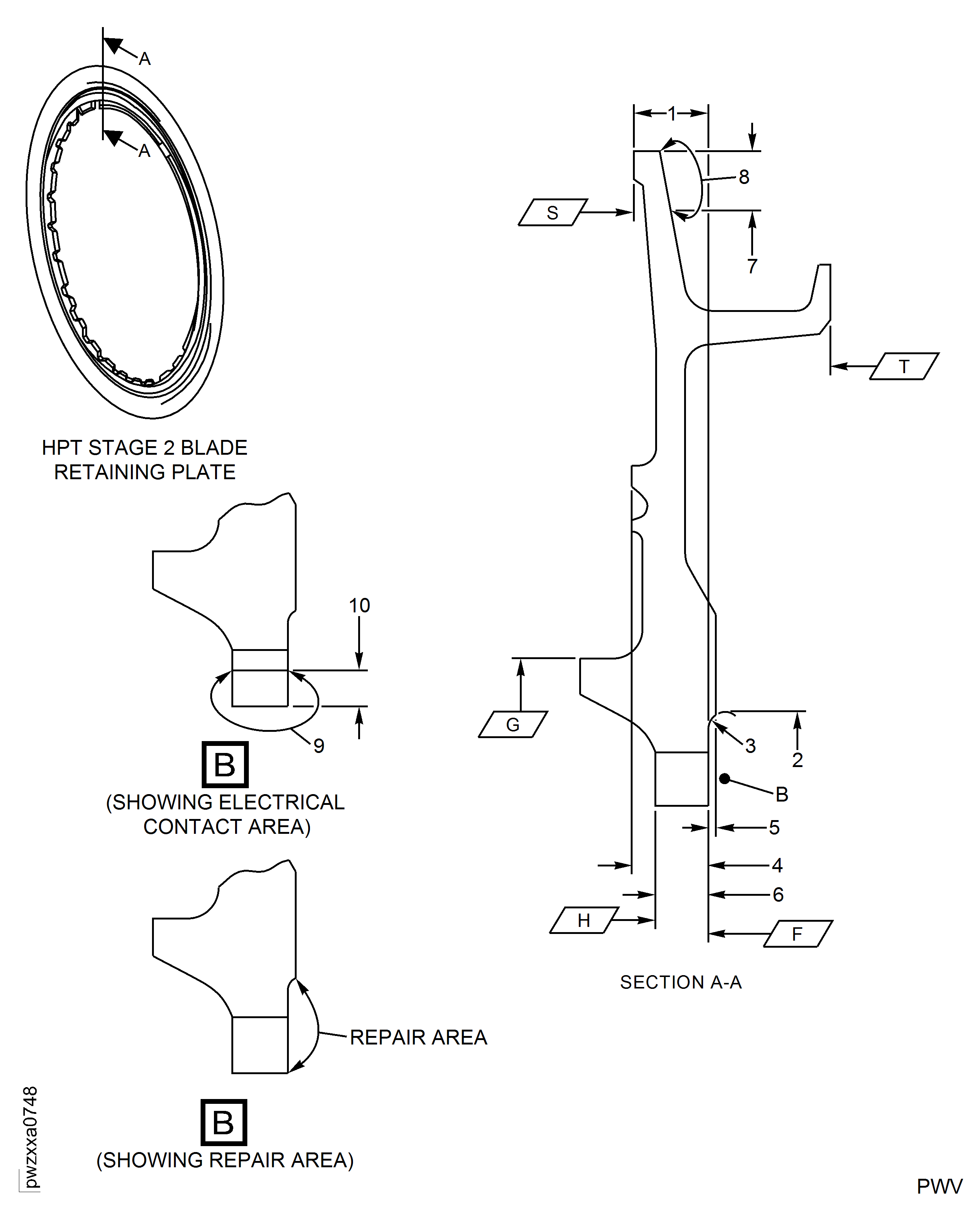 Skim grind to remove dents, nicks, tool marks, galling and wear from the rear face of HPT Stage 2 Blade Retaining Plate to the limits specified in Figure.