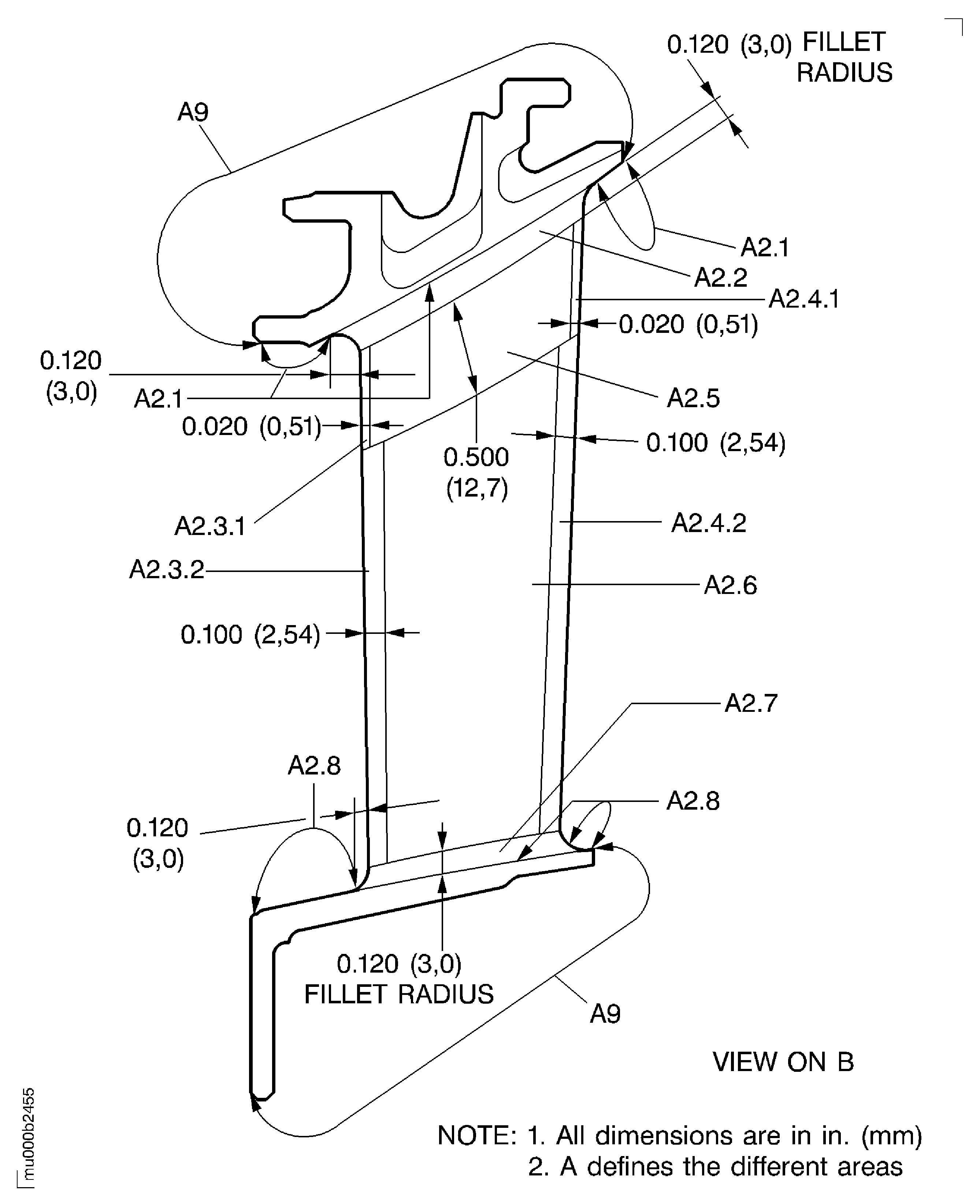 The minimum transition radius to the outer shroud is 0.08 in. (2.0 mm).