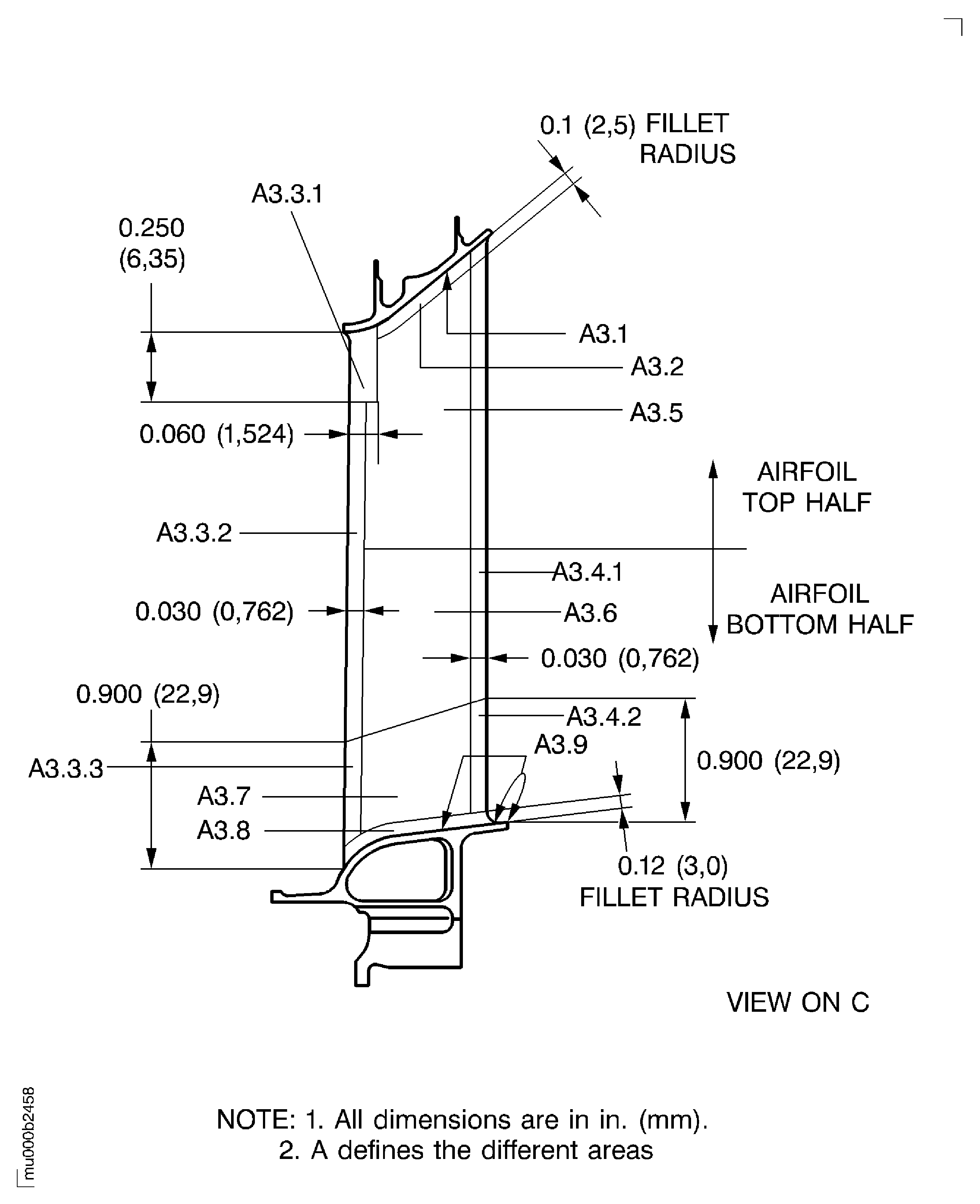 The minimum distance between the blends is 0.500in. (12.7 mm) for the outer diffuser segment and the stage 3 turbine vanes leading edge and trailing edge. For the stage 3 turbine blades the minimum distance between the blends is 0.200in. (5.0 mm).
