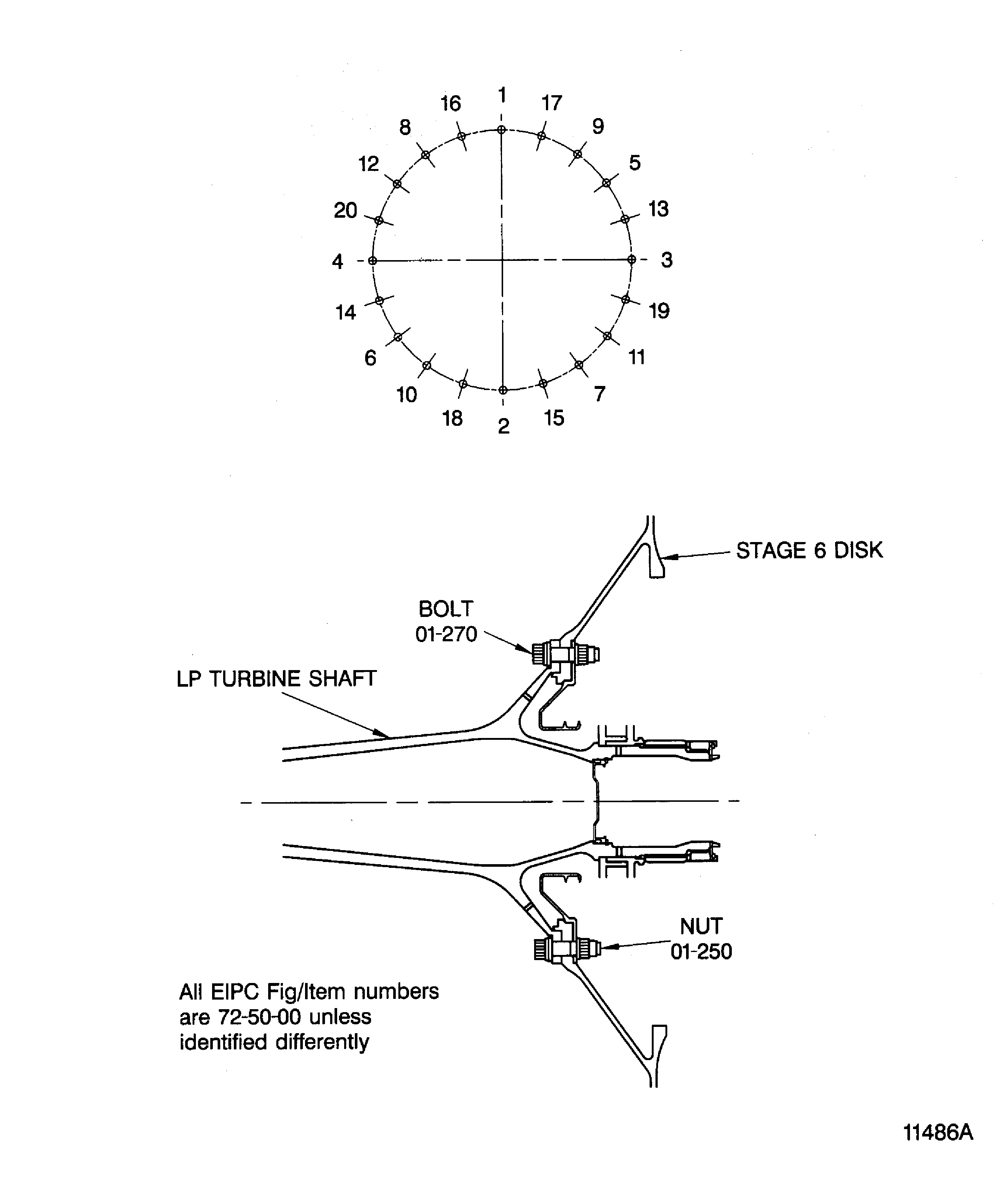HOLD THE BOLTS IN THEIR POSITION WHEN YOU INSTALL THE NUTS ON TO THE BOLTS. DO NOT TURN THE BOLTS OR MAKE TO-AND-FRO MOVEMENTS. THE SHAFT/DISK FLANGE AND/OR THE BOLTS CAN BE DAMAGED BY SCORES.Install the other 16 more bolts and nuts which lock the rear flange of the LP turbine shaft to the stage 6 turbine disk.