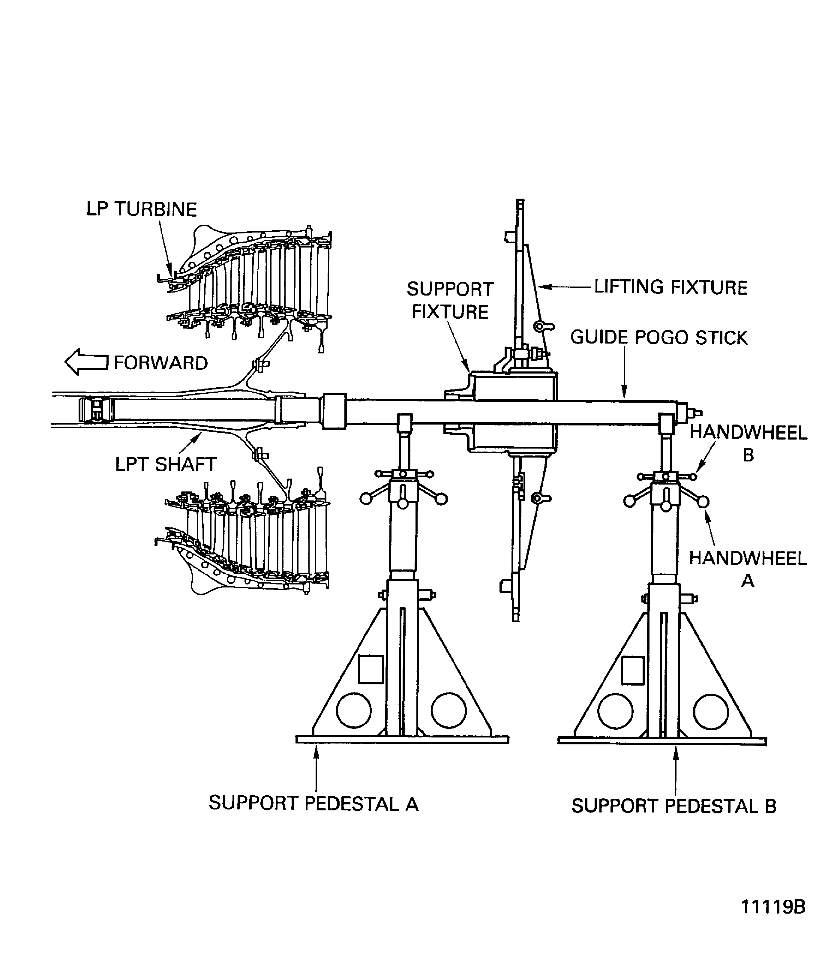 MAKE SURE THAT THE SUPPORT FIXTURE IS CORRECTLY INSTALLED ON THE LP TURBINE SHAFT AND LOCKED TO THE LIFTING FIXTURE. IF NOT CORRECTLY INSTALLED, THE LP TURBINE CASE AND ROTOR PARTS CAN BE DAMAGED DURING HANDLING OF THE LP TURBINE MODULE.Remove the IAE 1F10075 Support pedestal B. Remove the guide pogo stick through the support fixture.