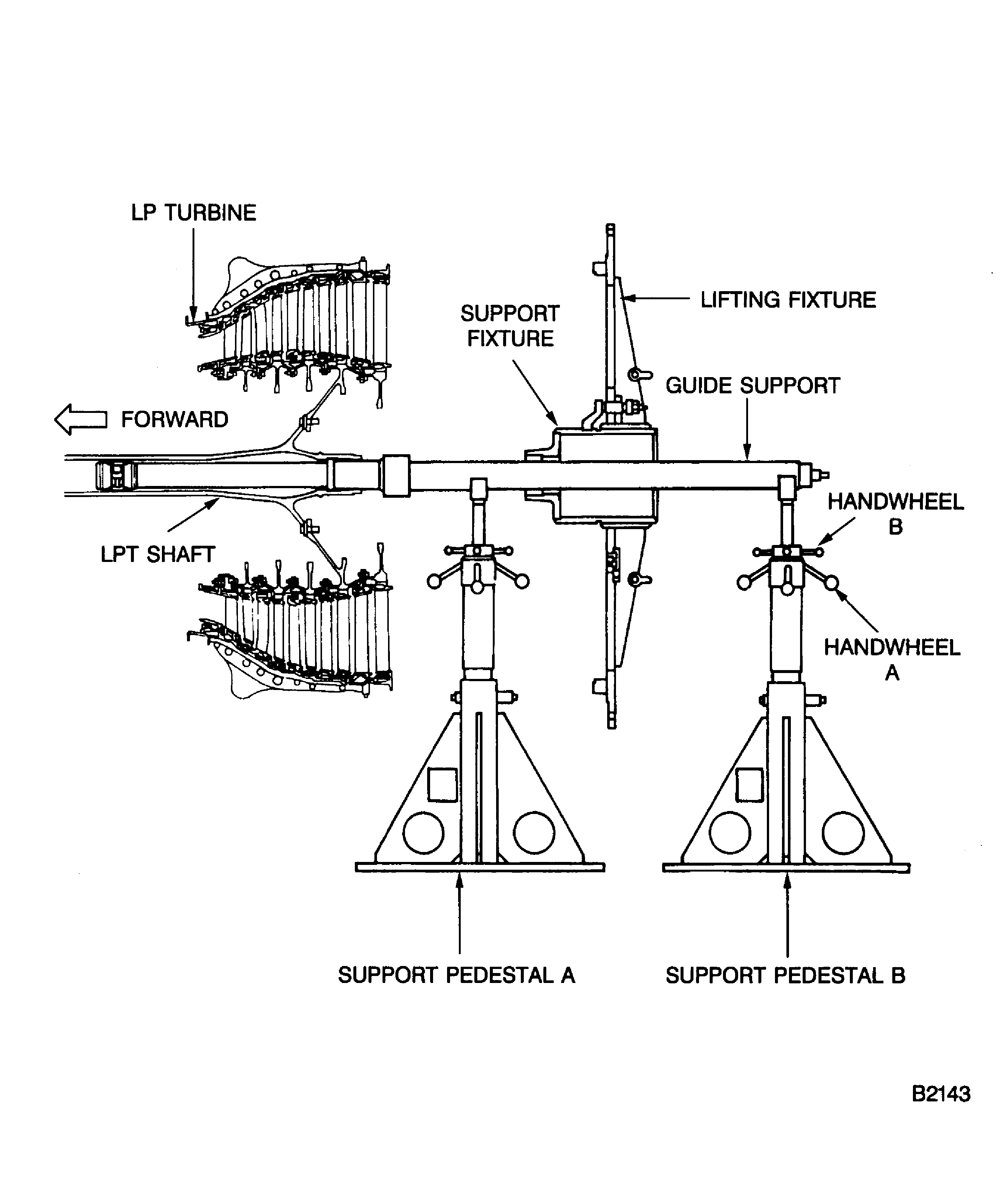 MAKE SURE THAT THE SUPPORT FIXTURE IS CORRECTLY INSTALLED ON THE LP TURBINE SHAFT AND LOCKED TO THE LIFTING FIXTURE. IF NOT CORRECTLY INSTALLED, THE LP TURBINE CASE AND ROTOR PARTS CAN BE DAMAGED DURING HANDLING OF THE LP TURBINE MODULE.Remove the IAE 1F10075 Support pedestal B. Remove the guide support through the support fixture.