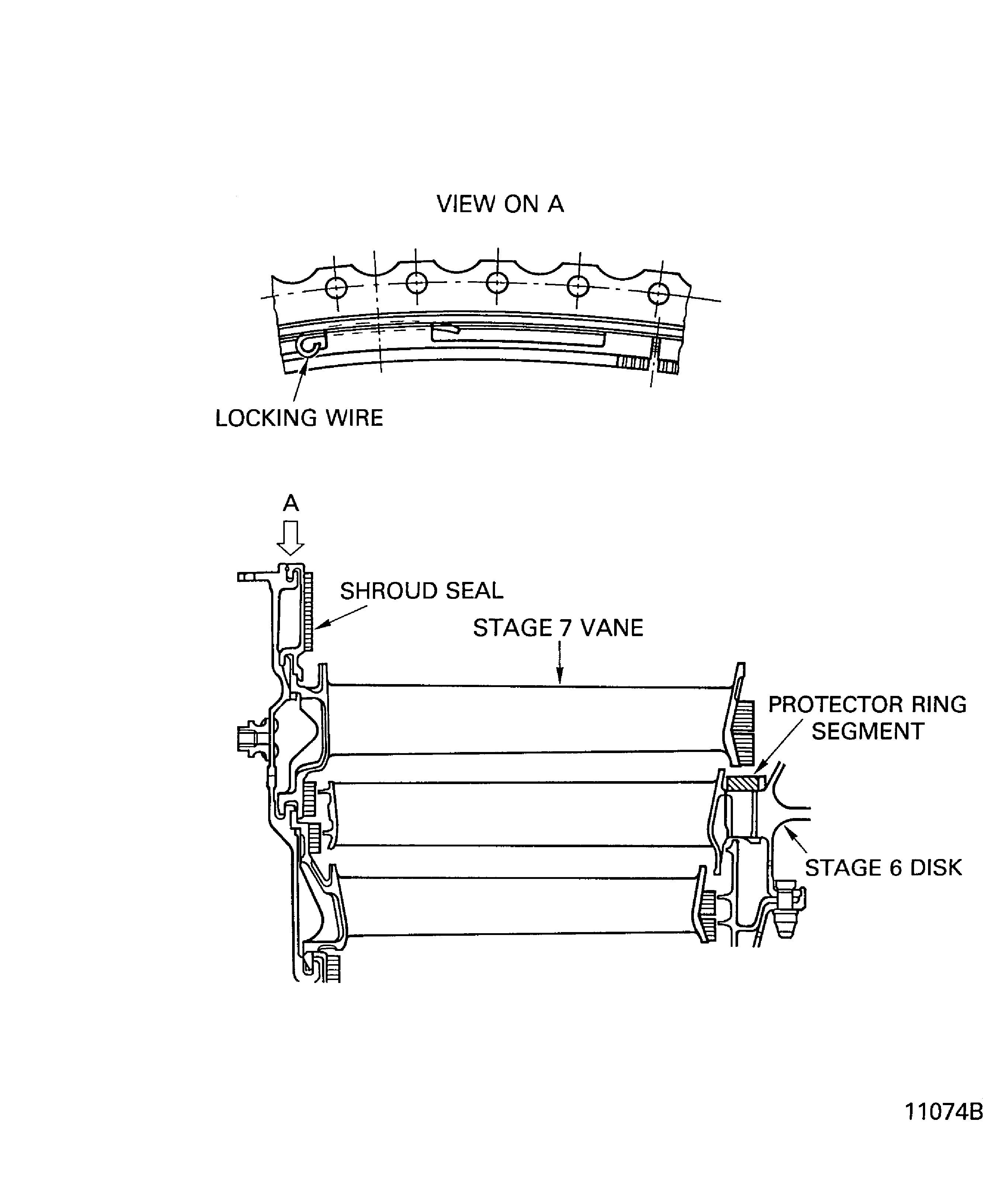 Install the IAE 1M14124 Protector ring segment 3 off between the stage 7 vanes inner platforms and the stage 6 blades roots.