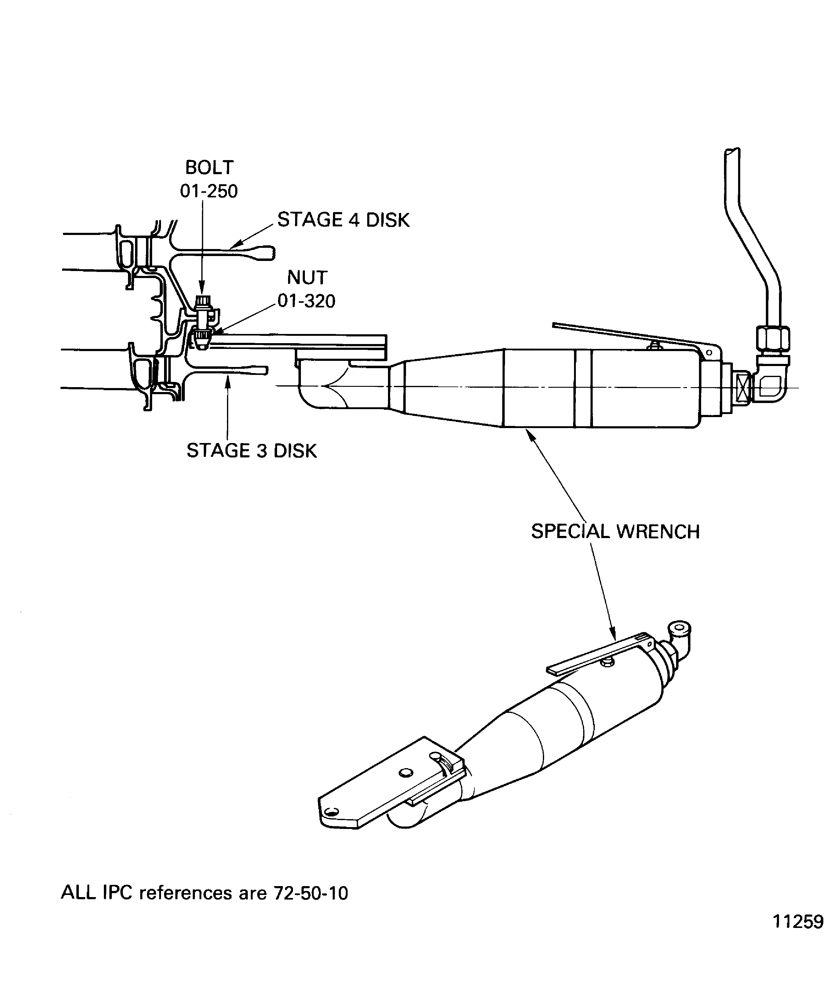 HOLD THE BOLTS IN THEIR POSITION WHEN YOU INSTALL/REMOVE THE NUTS ON TO/FROM THE BOLTS. DO NOT TURN THE BOLTS OR MAKE TO-AND-FRO MOVEMENTS. THE DISK/INNER AIR SEAL FLANGES AND/OR THE BOLTS CAN BE DAMAGED BY SCORES.MAKE SURE THAT THE LOCKING TORQUE OF THE NUTS IS BETWEEN 3.5 AND 30.0 LBFIN (0.4 AND 3.4 NM). TURN THE NUTS DOWN ON TO THE BOLTS UNTIL FINGER TIGHT. CONTINUE TO TURN THE NUTS WITH A WRENCH. MAKE SURE THAT THE NUTS GIVE SUFFICIENT RESISTANCE. IT SHOWS THAT THE SELF LOCKING PROPERTY IS STILL AVAILABLE.IT IS PERMITTED TO USE POWER TOOLS TO TURN THE NUTS ON TO THE REMAINING BOLTS THREADS. MAKE SURE THAT THE POWER TOOL IS SET TO A TORQUE VALUE WHICH IS NOT MORE THAN 50 PERCENT OF THE FINAL TORQUE VALUE. THE SPEED MUST BE SLOW TO PREVENT INCREASE OF HEAT WHICH CAN CAUSE THREAD PICK-UP AND SEIZURE.Install 30 new bolts with the head up and the new nuts to the disk flanges. Tighten the nuts on to the bolts with the IAE 1M14055 Special wrench 1 off.