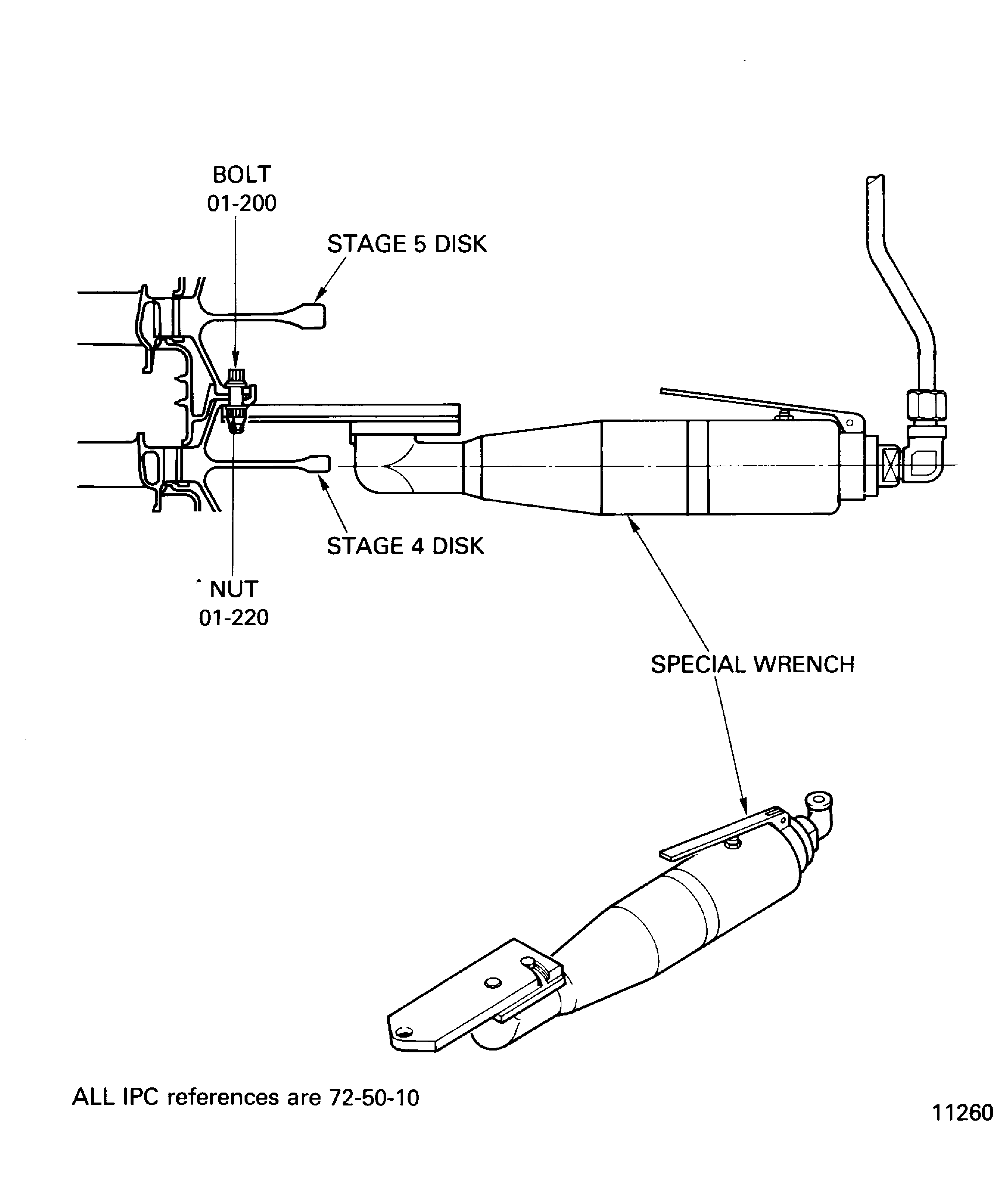 HOLD THE BOLTS IN THEIR POSITION WHEN YOU INSTALL/REMOVE THE NUTS ON TO/FROM THE BOLTS. DO NOT TURN THE BOLTS OR MAKE TO AND FRO MOVEMENTS. THE DISK/INNER AIR SEAL FLANGES AND/OR THE BOLTS CAN BE DAMAGED BY SCORES.MAKE SURE THAT THE LOCKING TORQUE OF THE NUTS IS BETWEEN 3.5 AND 30.0 LBFIN (0.4 AND 3.4 NM). TURN THE NUTS DOWN ON TO THE BOLTS UNTIL FINGER TIGHT. CONTINUE TO TURN THE NUTS WITH A WRENCH. MAKE SURE THAT THE NUTS GIVE SUFFICIENT RESISTANCE. IT SHOWS THAT THE SELF LOCKING PROPERTY IS STILL AVAILABLE.IT IS PERMITTED TO USE POWER TOOLS TO TURN THE NUTS ON TO THE REMAINING BOLT THREADS. MAKE SURE THAT THE POWER TOOL IS SET TO A TORQUE VALUE WHICH IS NOT MORE THAN 50 PERCENT OF THE FINAL TORQUE VALUE. THE SPEED MUST BE SLOW TO PREVENT INCREASE OF HEAT, WHICH CAN CAUSE THREAD PICK-UP AND SEIZURE.Install 30 new bolts with the head up and the new nuts to the disk flanges. Tighten the nuts on to the bolts with the IAE 1M14055 Special wrench 1 off.
