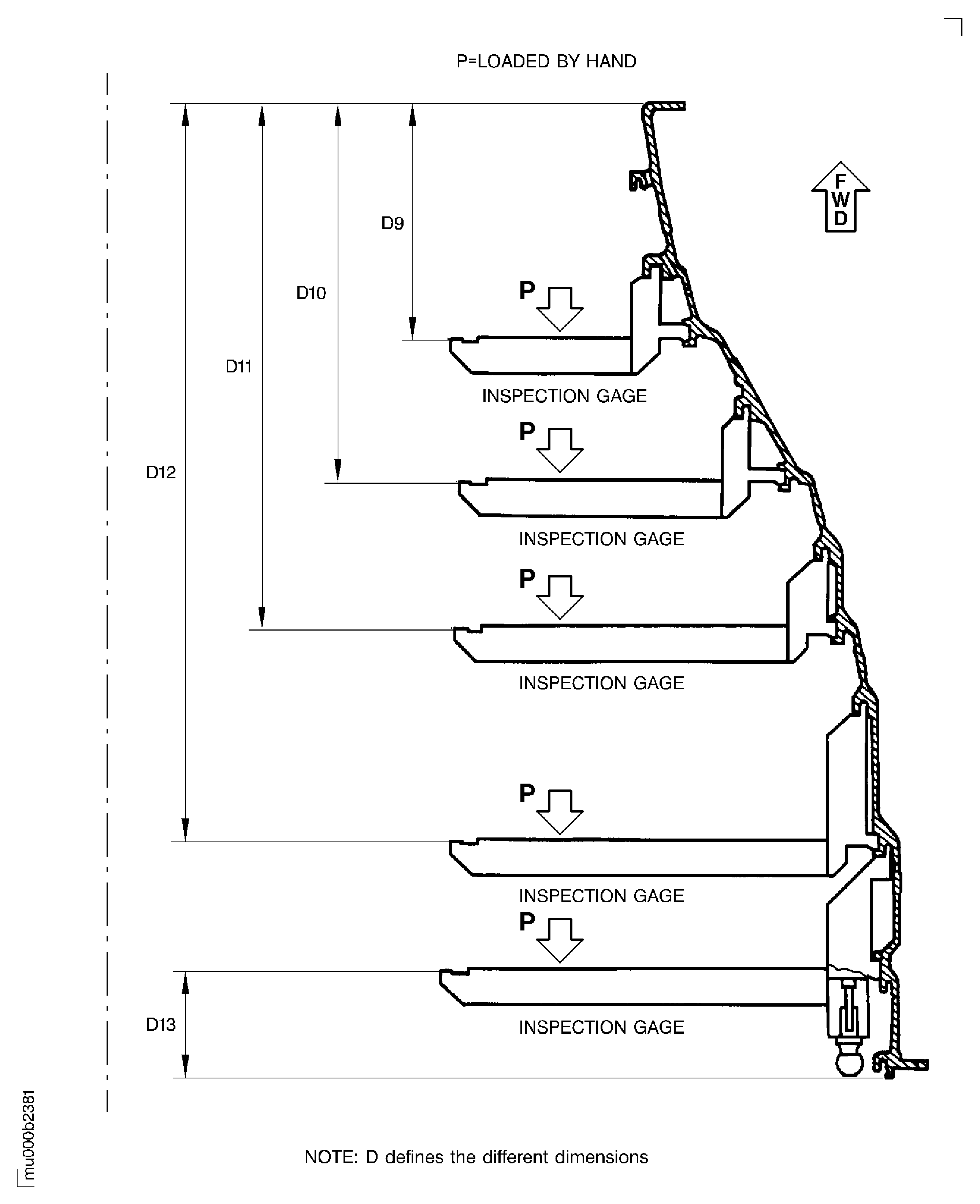 For the dimensional insepction at dimensions D9, D10, D11, D12 and D13 the inspection gages must be loaded by hand (refer to Figure.
